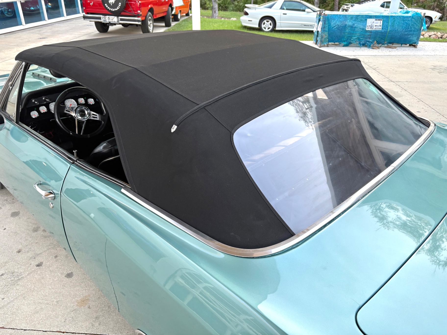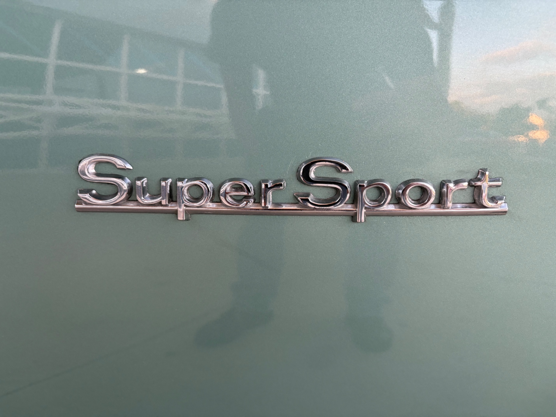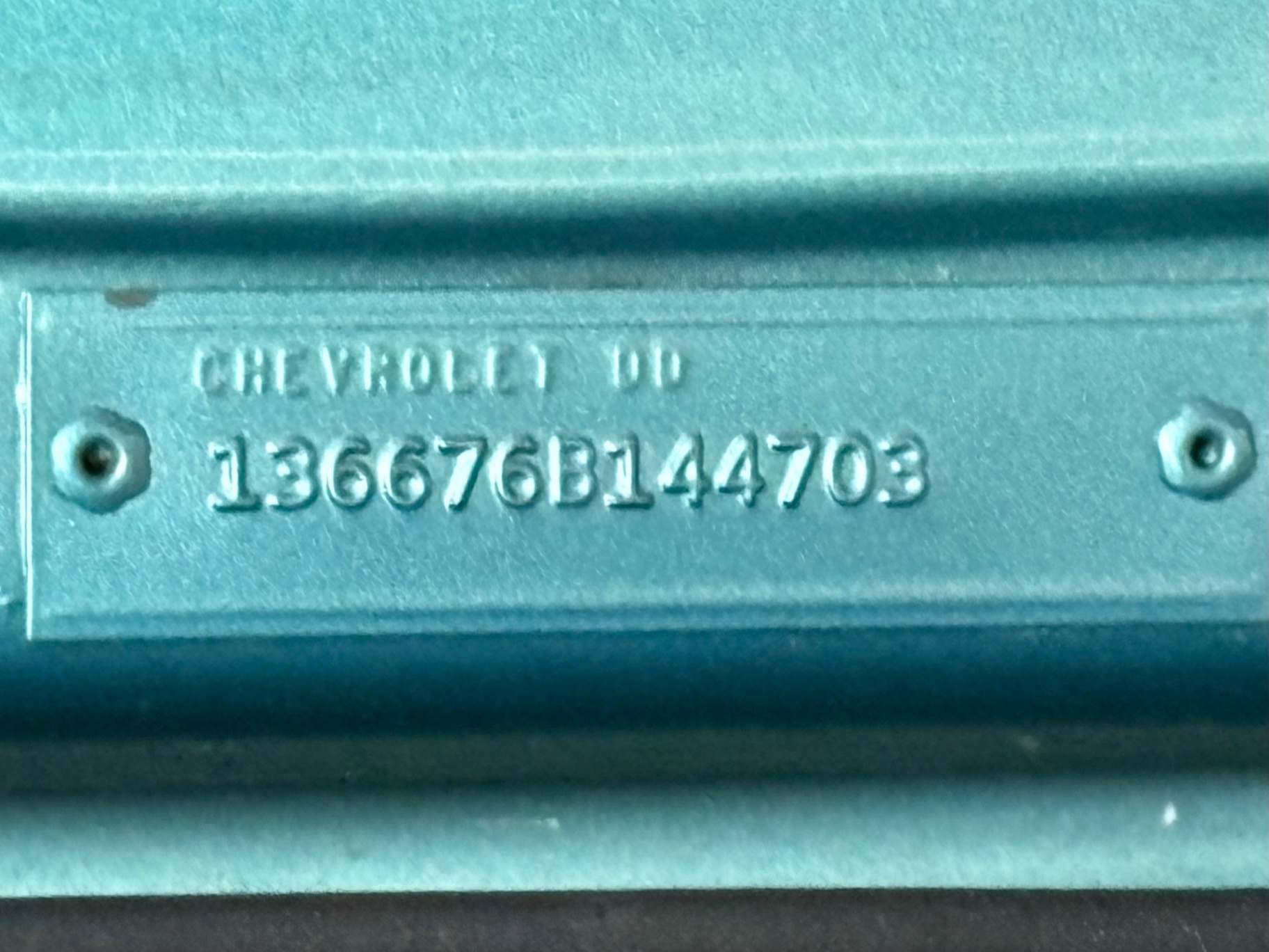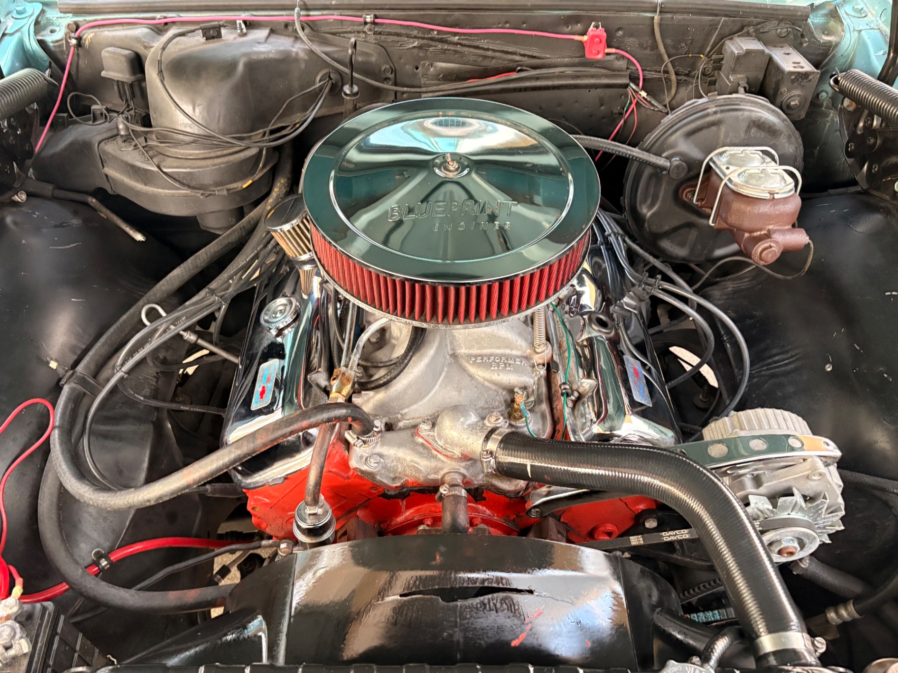 - 396 cubic inch V8 engine - Automatic transmission - SS Tribute configuration with SS hood, SS badging, and SS 396 rear badging - HARTZ black cloth power convertible top - Power front disc brakes with new calipers, new rotors, and new master cylinder - Power steering - Aluminum intake manifold with 4-barrel carburetor - Chrome open element high-flow air cleaner - Chrome valve covers - Performance distributor - New high-flow RPM thermostat - New water pump - Factory cast iron exhaust manifolds with Flowmaster mufflers - GM 10-bolt rear end - Billet Specialties wheels with black sidewall tires - Covan dash with AutoMeter gauges - Custom Auto Sound stereo system - Aftermarket steering wheel with chrome automatic shifter - Black twin front bucket seats with matching rear seat and console - Matching black vinyl door panels - Black carpets and seat belts - Clock - Teal exterior paint - Chrome front and rear bumpers - Painted and detailed engine compartment