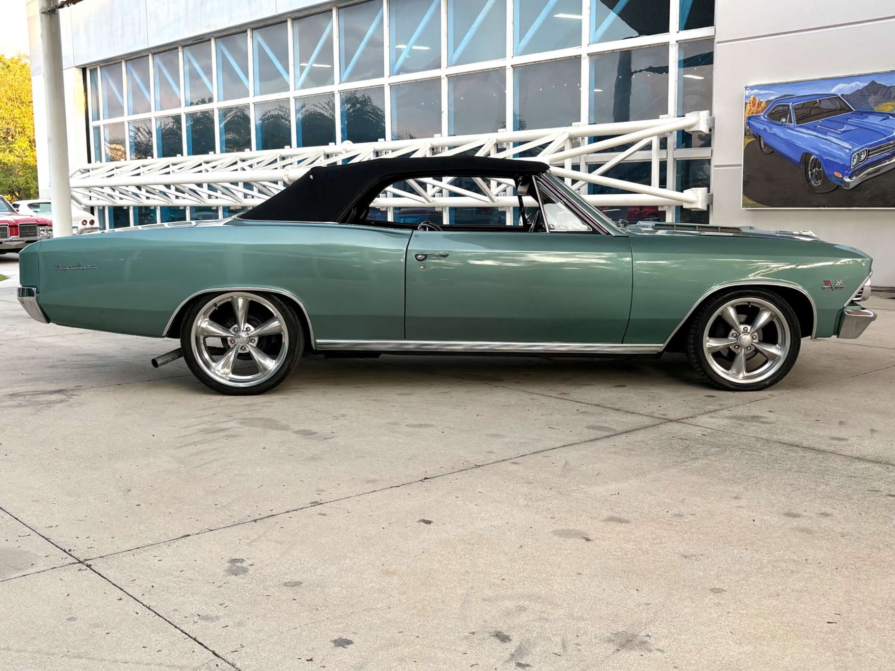 The teal paint on this 1966 Chevrolet Chevelle Convertible is a color choice that suits the car's body lines well. The 1966 Chevelle body — designed under the direction of GM's A-body studio — features a longer hood, shorter deck, and cleaner side profile than its predecessors. The convertible body amplifies the open, low-slung quality of that design.