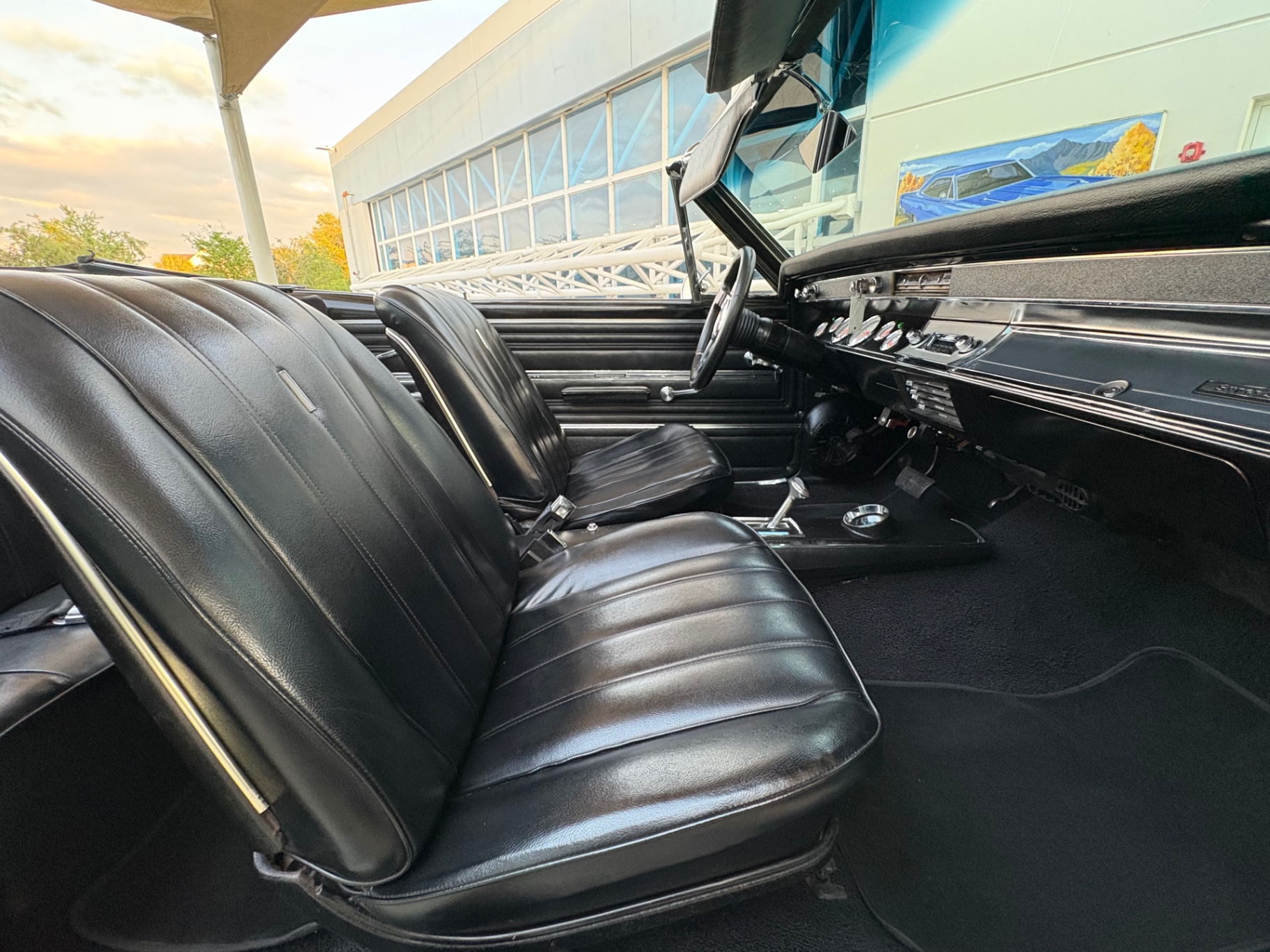 The cabin of this 1966 Chevrolet Chevelle Convertible is done in black vinyl throughout, which was a correct and popular choice on SS-optioned cars of this era. The twin front bucket seats are a signature SS feature — standard Chevelles came with a bench — and they give the interior a more purposeful appearance. The rear seat and center console match the front, creating a consistent look throughout the cabin.