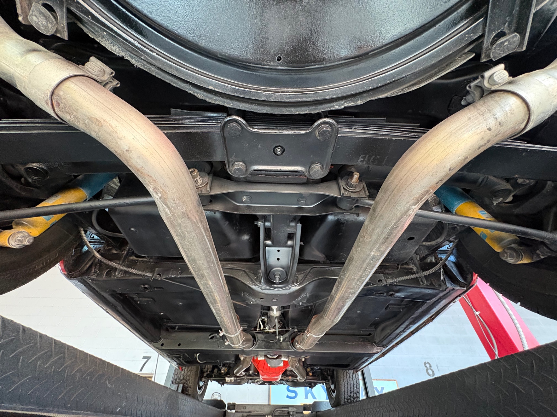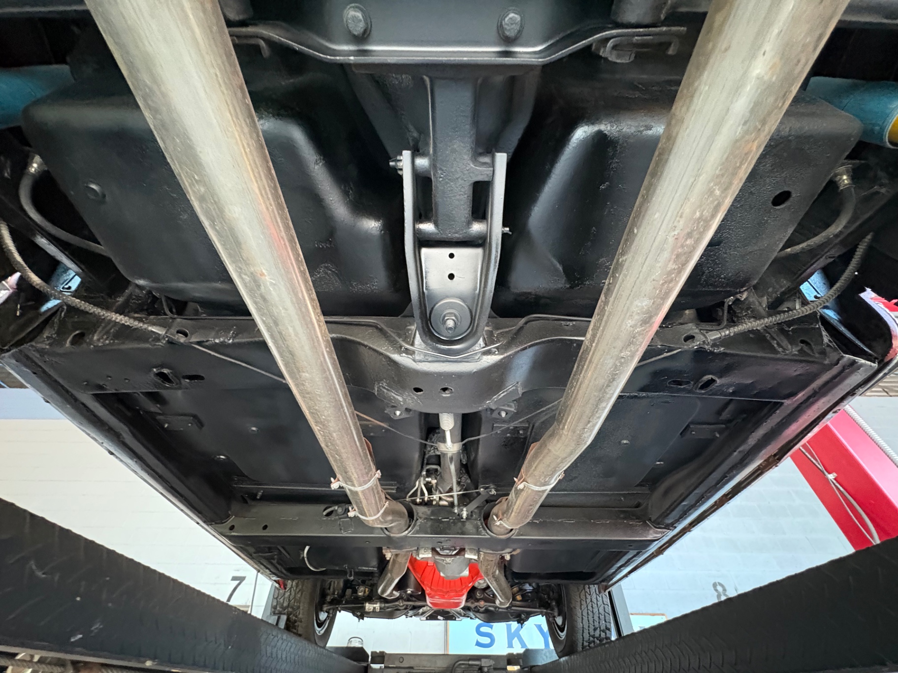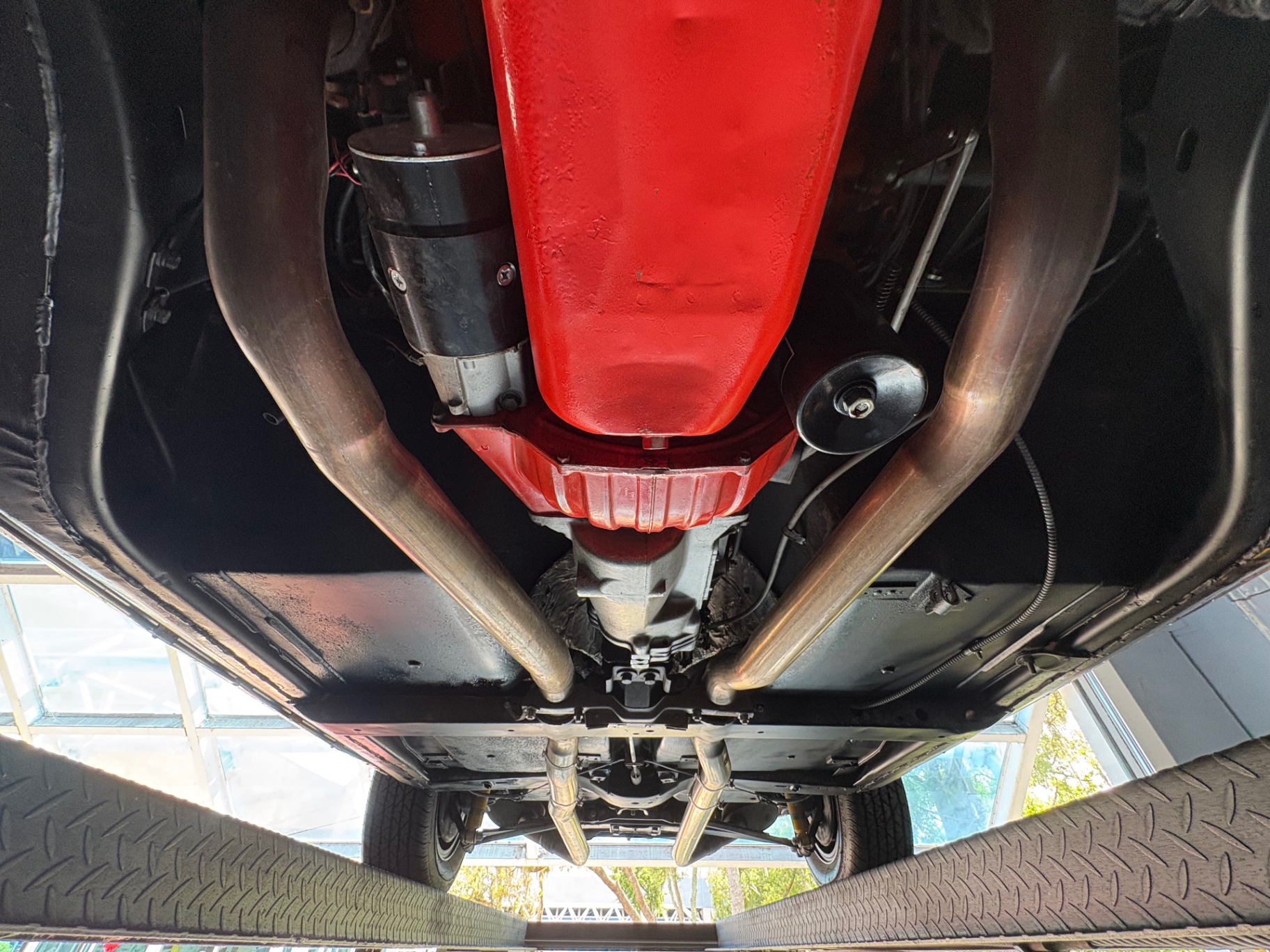 The knock-off turbine style wheels are a period-appropriate choice for a 1963 Corvette. The factory offered a genuine knock-off wire wheel option on the 1963 model — a relatively rare and expensive factory order — and turbine-style knock-off wheels have been a popular complement to this generation of Corvette for decades. They are fitted here with radial redline tires, which provide a correct visual profile while offering better handling and longevity than the original bias-ply tires the car would have left the factory wearing. The stainless steel exhaust tips exit cleanly through the rear bumper cutouts, visible in photographs from underneath the car, and show no signs of corrosion or poor fitment.