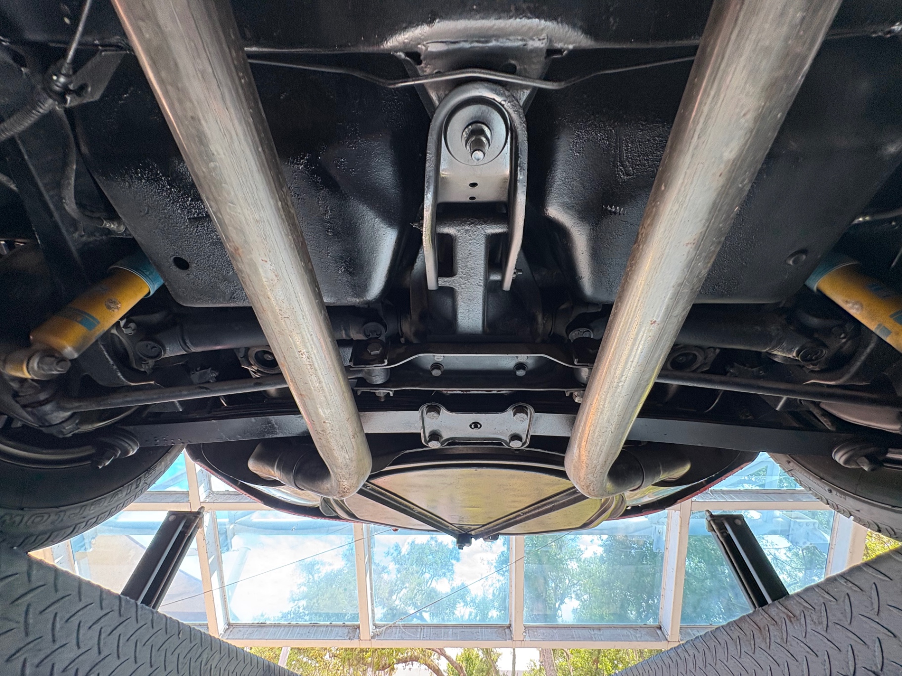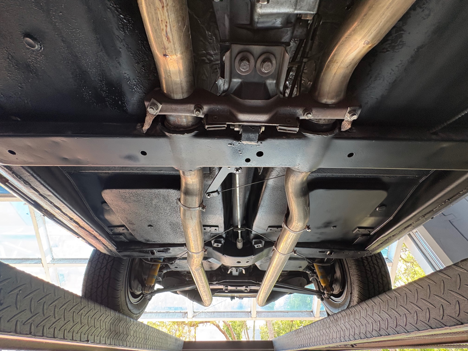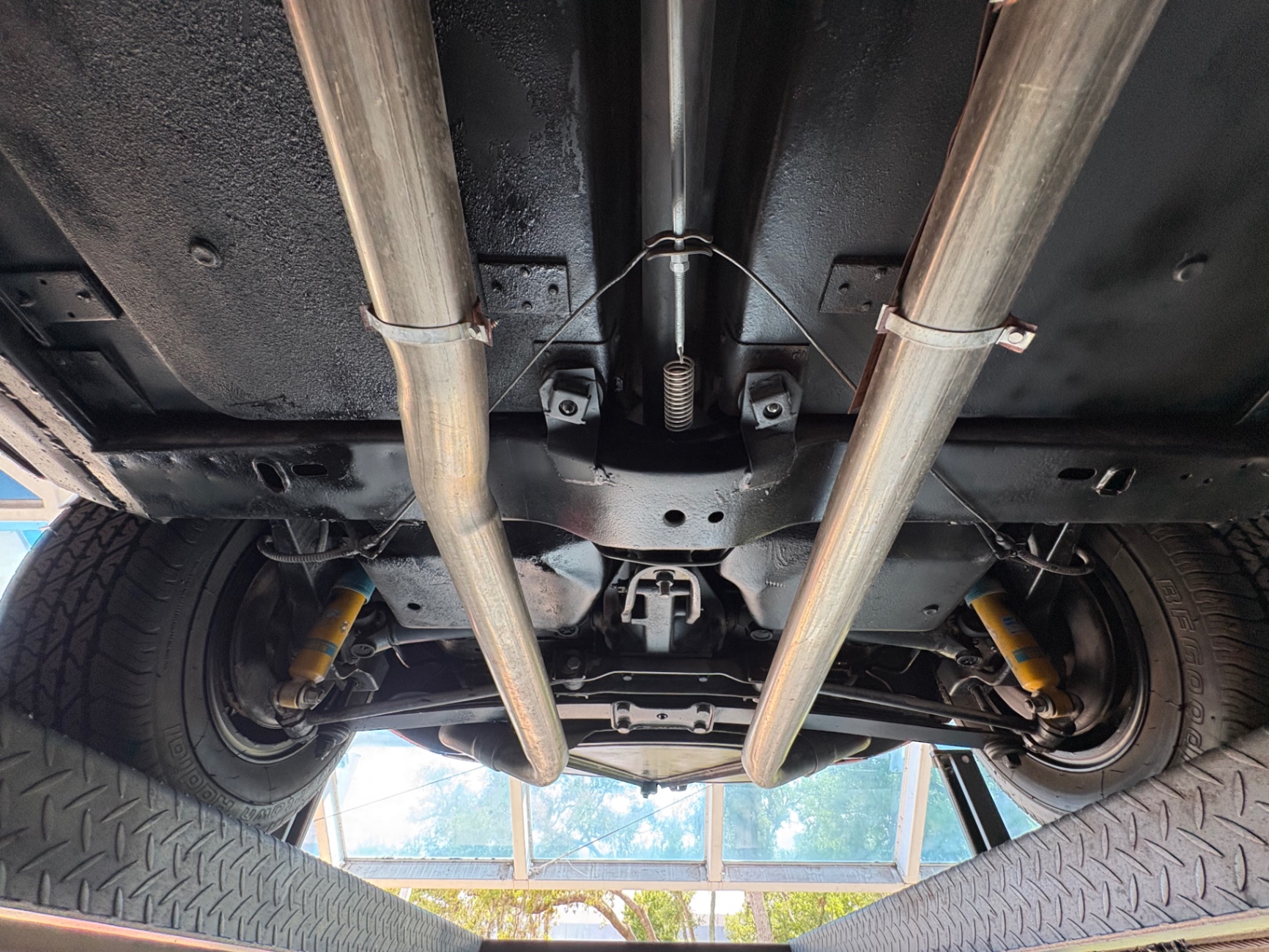 The knock-off turbine style wheels are a period-appropriate choice for a 1963 Corvette. The factory offered a genuine knock-off wire wheel option on the 1963 model — a relatively rare and expensive factory order — and turbine-style knock-off wheels have been a popular complement to this generation of Corvette for decades. They are fitted here with radial redline tires, which provide a correct visual profile while offering better handling and longevity than the original bias-ply tires the car would have left the factory wearing. The stainless steel exhaust tips exit cleanly through the rear bumper cutouts, visible in photographs from underneath the car, and show no signs of corrosion or poor fitment.