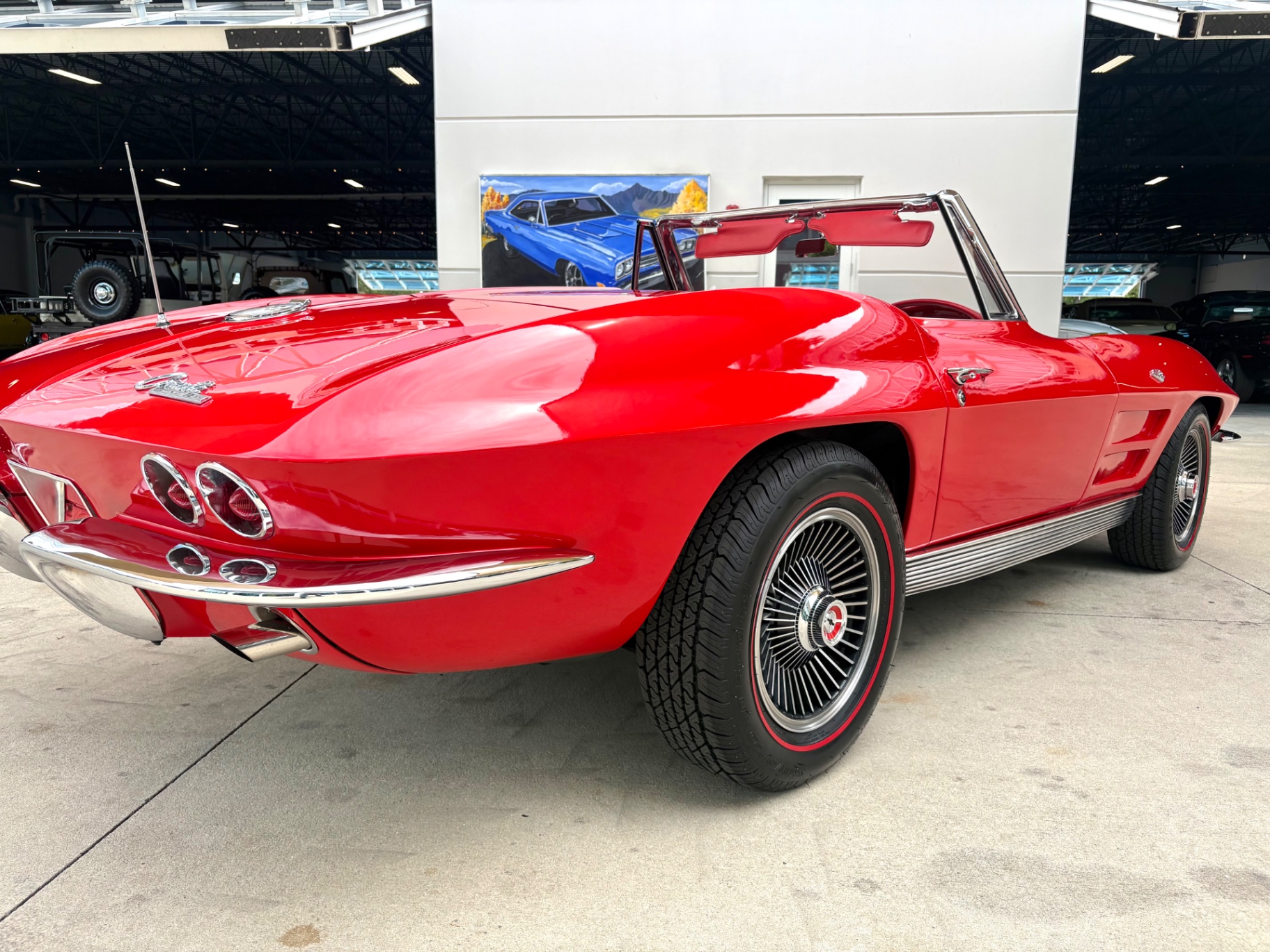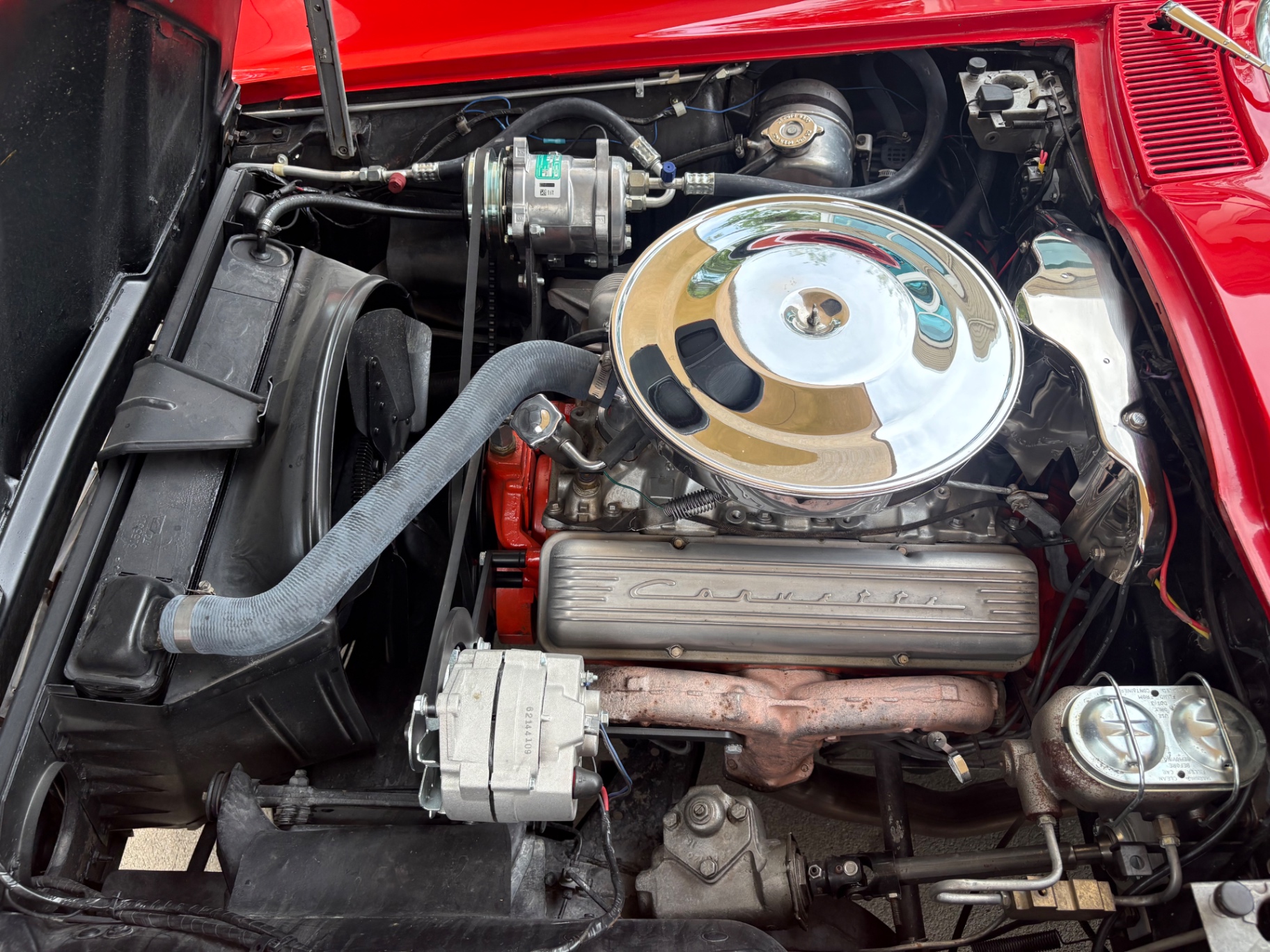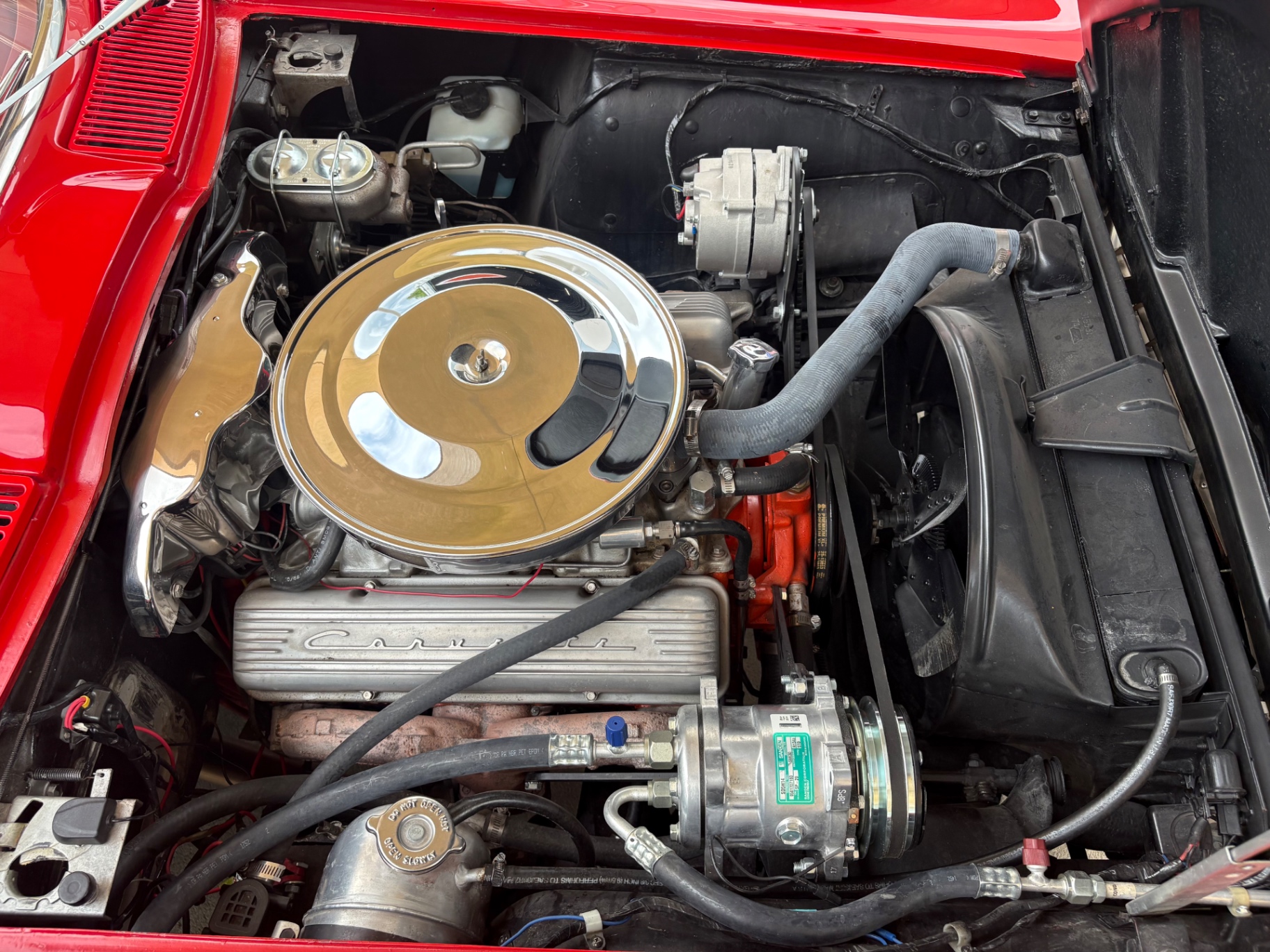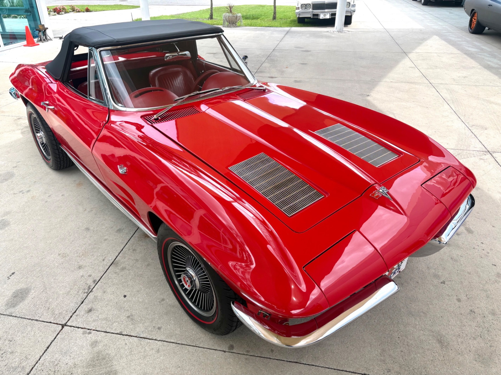 - Original numbers matching 327ci V8 engine, 340 horsepower - Original numbers matching Muncie 4-speed manual transmission - NCRS documented - Riverside Red exterior - Red leather interior - Convertible body style - New vintage-style air conditioning - New electric power steering - Stainless steel exhaust with dual outlets through the rear fascia - New convertible top - Knock-off turbine style wheels - Radial redline tires - Four wheel disc brakes - Tachometer - Chrome bumpers - Hood vents