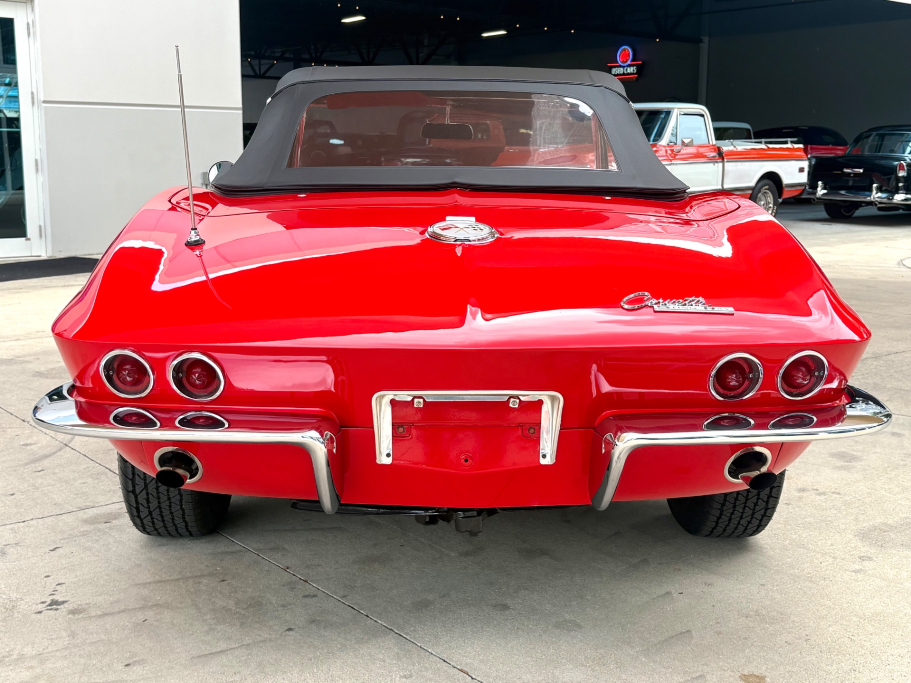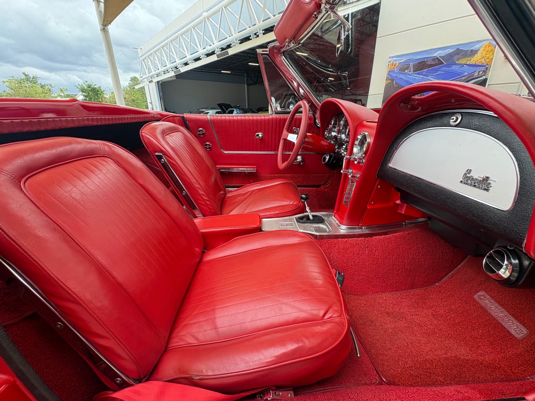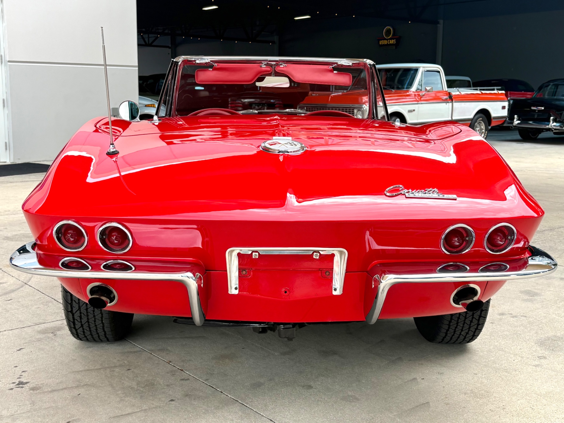 - Original numbers matching 327ci V8 engine, 340 horsepower - Original numbers matching Muncie 4-speed manual transmission - NCRS documented - Riverside Red exterior - Red leather interior - Convertible body style - New vintage-style air conditioning - New electric power steering - Stainless steel exhaust with dual outlets through the rear fascia - New convertible top - Knock-off turbine style wheels - Radial redline tires - Four wheel disc brakes - Tachometer - Chrome bumpers - Hood vents