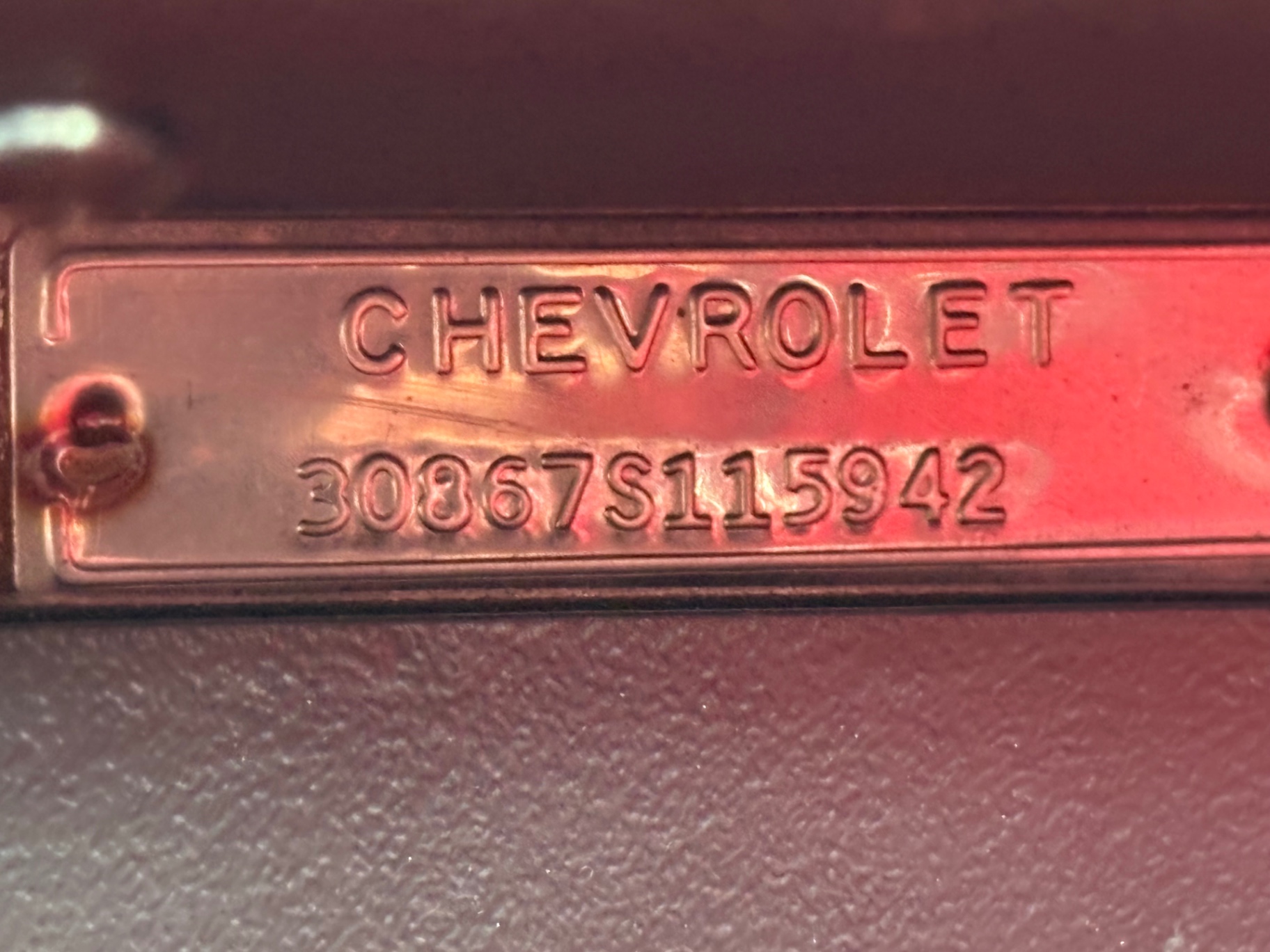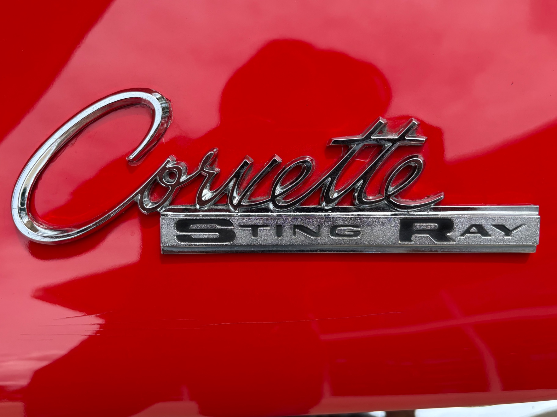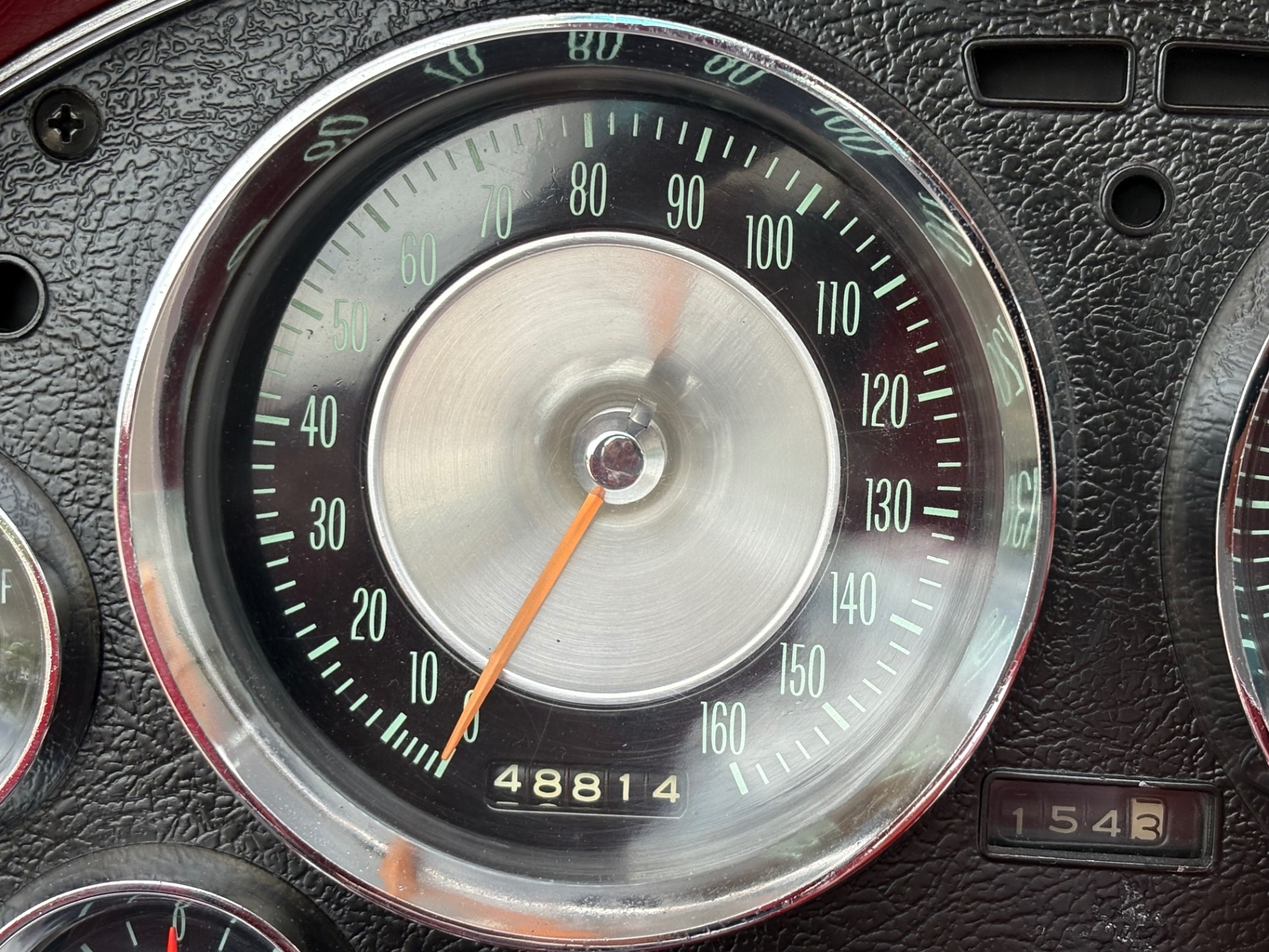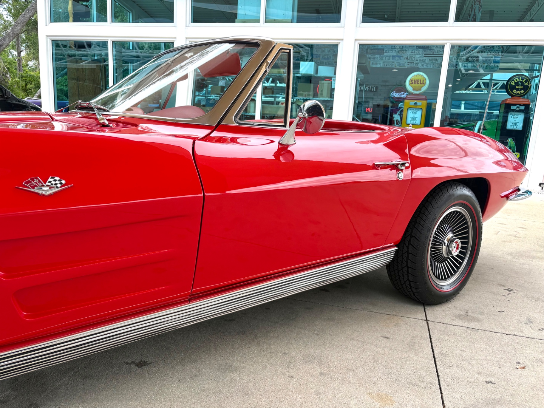 - Original numbers matching 327ci V8 engine, 340 horsepower - Original numbers matching Muncie 4-speed manual transmission - NCRS documented - Riverside Red exterior - Red leather interior - Convertible body style - New vintage-style air conditioning - New electric power steering - Stainless steel exhaust with dual outlets through the rear fascia - New convertible top - Knock-off turbine style wheels - Radial redline tires - Four wheel disc brakes - Tachometer - Chrome bumpers - Hood vents