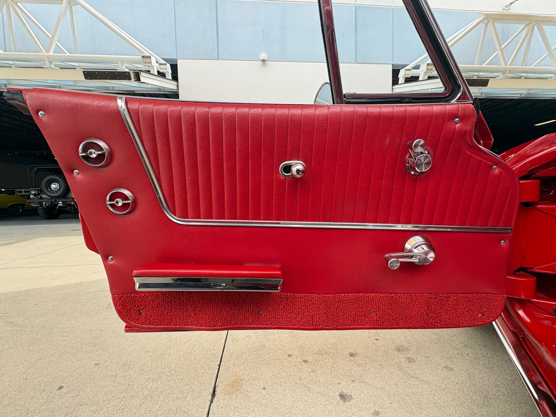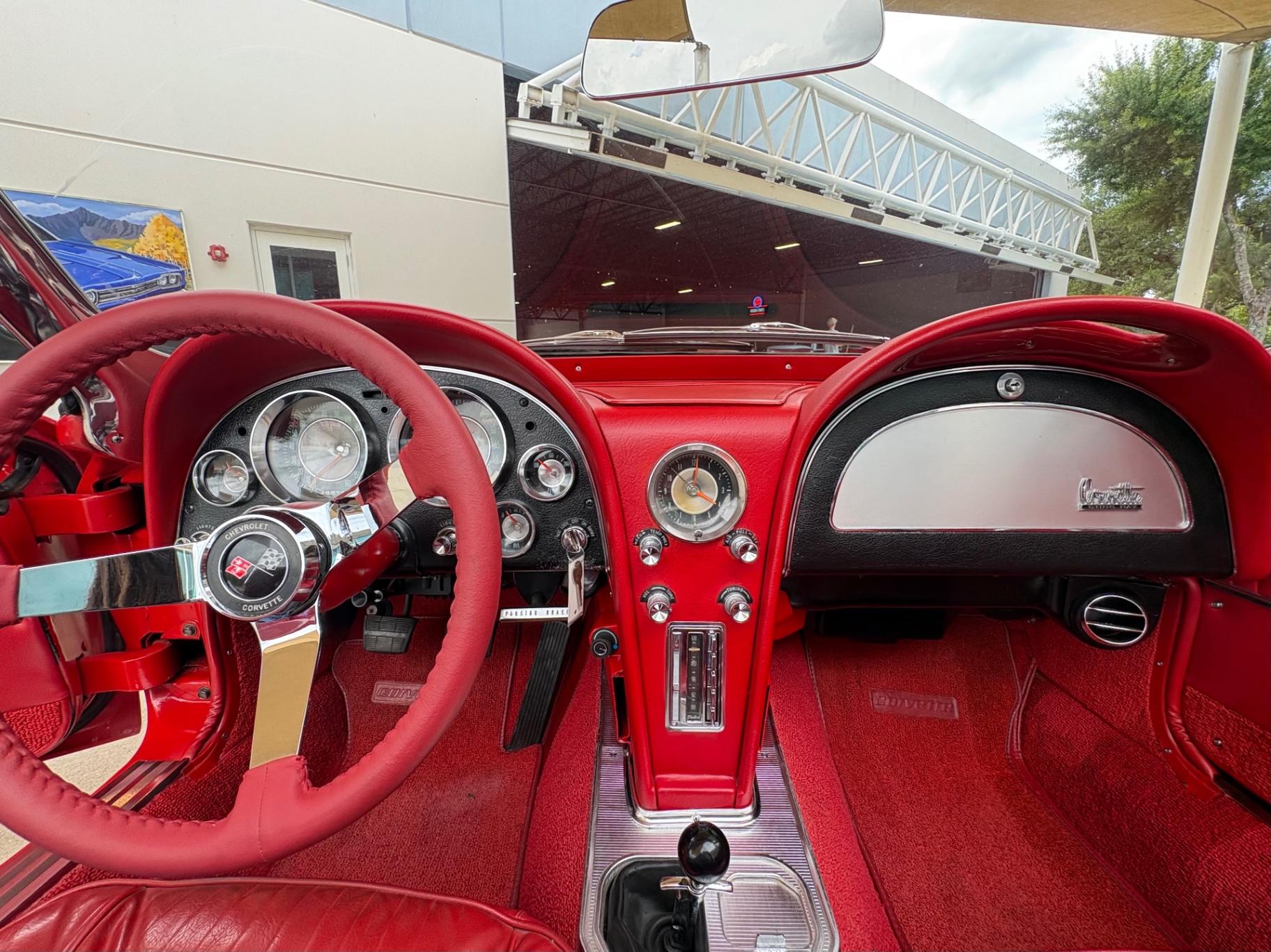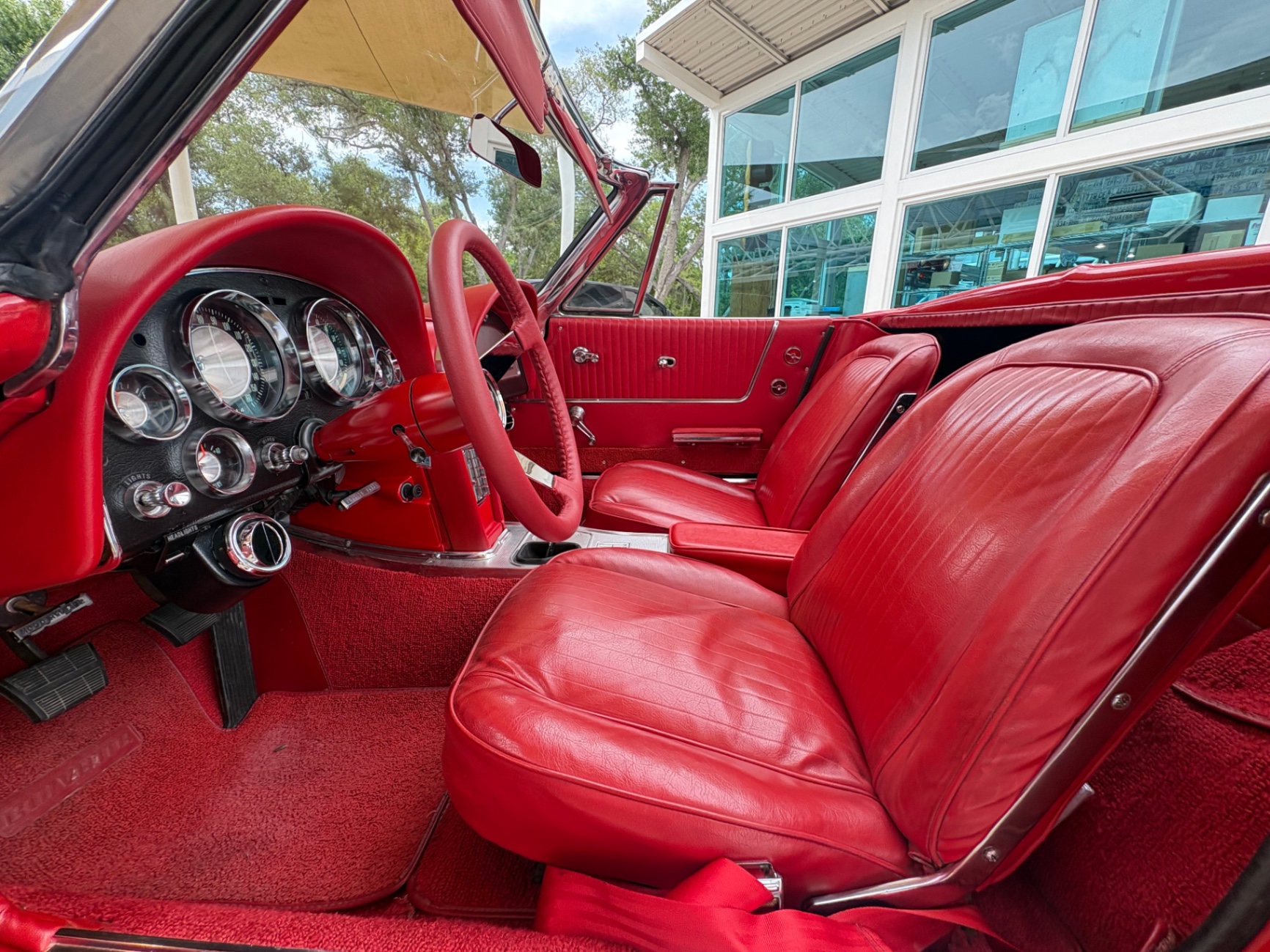 The interior of this 1963 Chevrolet Corvette Convertible is trimmed in red leather, matching the exterior color in the classic full red treatment that was a popular order combination when these cars were new. The C2 Corvette cockpit is a driver-focused space — the seating position is low, the transmission tunnel is prominent, and the instrument cluster wraps slightly toward the driver in a way that was genuinely advanced for an American production car in 1963. This car carries a tachometer, which was a factory option on the 1963 Corvette and is correctly positioned at the center of the gauge cluster. The bucket seats and center console are correctly appointed for the body style and trim level. The chrome interior hardware shows the level of detail that Chevrolet brought to the C2 interior, with polished knobs and bezels throughout the door panels and dash. A new convertible top has been installed, which is correct for a car that is driven and shown rather than simply stored.