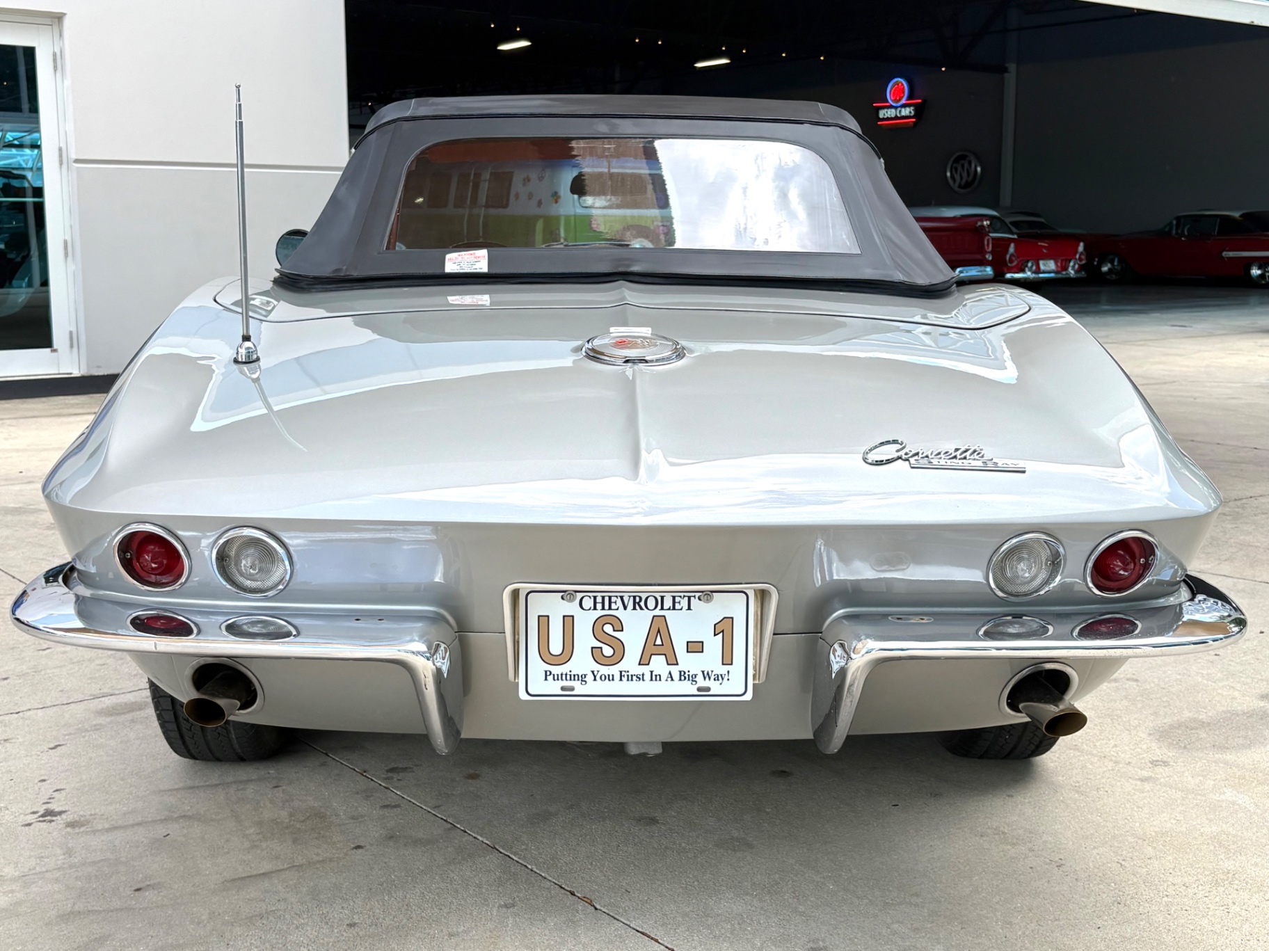 The silver exterior is a classic color on the C2 Corvette — it works with the body's long, horizontal lines and the chrome detailing without competing against either. The white convertible top pairs well and is correct for the color combination. The knock-off wheels give the car a competition-influenced stance that was very much in keeping with the racing culture Chevrolet was cultivating around the Corvette in the mid-1960s. The rear luggage rack, mounted at the tail of the car, is the kind of detail that rewards closer inspection. It is a period accessory that was correct for the era, fits the proportions of the car well, and tells you something about how this Corvette was originally configured and cared for. The dual exhaust exits are visible in the photos and are correct for the body style, exiting through the rear bumper tips in the signature 1964 Corvette configuration.