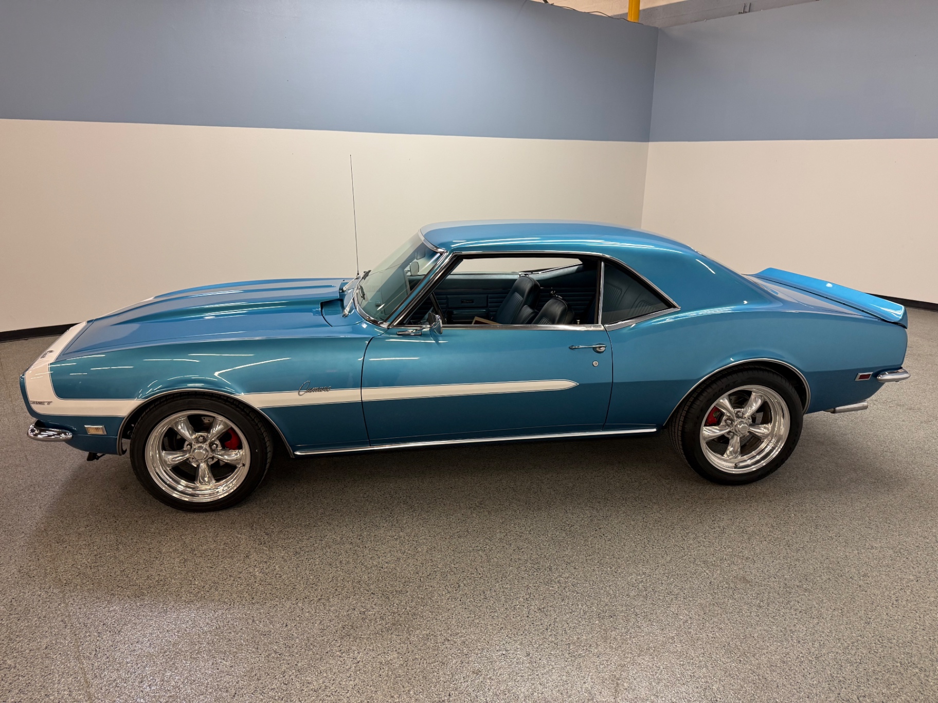 This 1968 Camaro boasts a striking blue paint finish that's sure to catch the eye of passersby. The paint is well-preserved, reflecting its garage-kept status and meticulous care from previous owners. The classic styling cues like the aggressive front grille and sleek lines are in excellent condition, emphasizing the vehicle's sporty pedigree. The chrome accents and brightwork add a touch of elegance, making this Camaro a truly desirable piece from every angle.