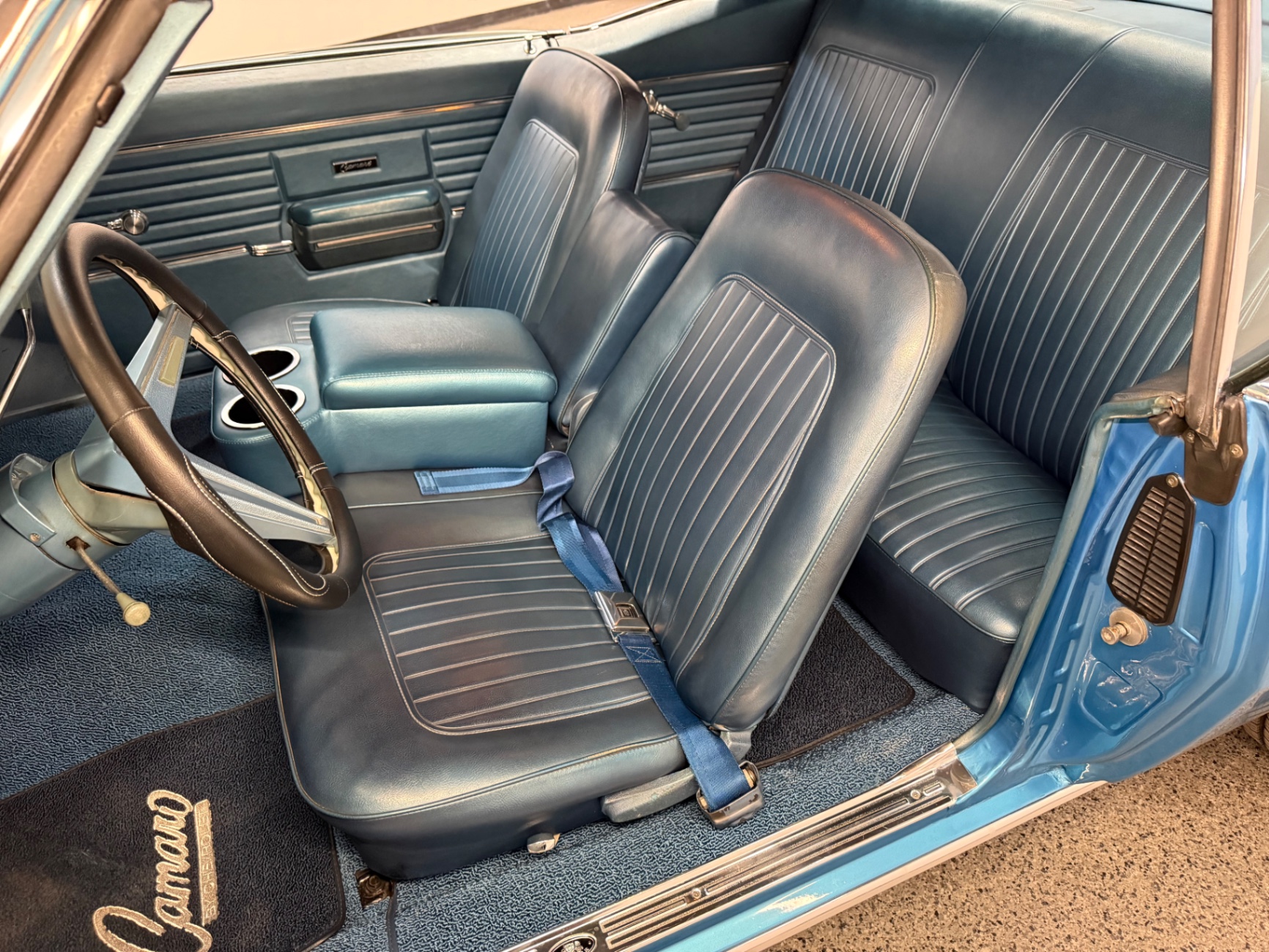 The interior of this Camaro is just as impressive as its mechanical credentials. The blue leather upholstery provides a comfortable and luxurious feel, perfectly complementing the exterior. The all-vinyl bucket seats are both stylish and supportive, ideally suited for both spirited driving and leisurely cruises. The vehicle also features the innovative Astro Ventilation system, a unique addition that eliminates the need for side vent windows and provides passengers with fresh air without drafts, maintaining comfort in all driving conditions.