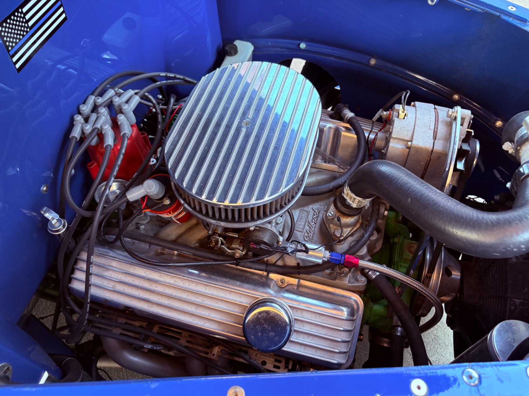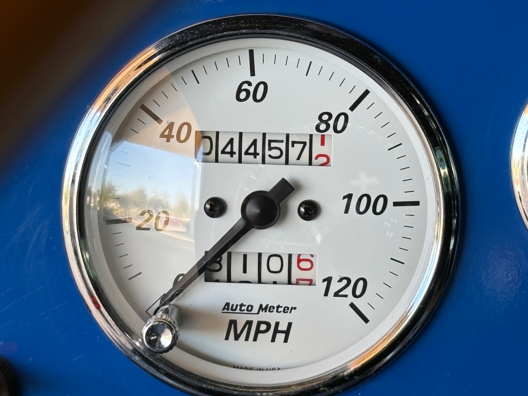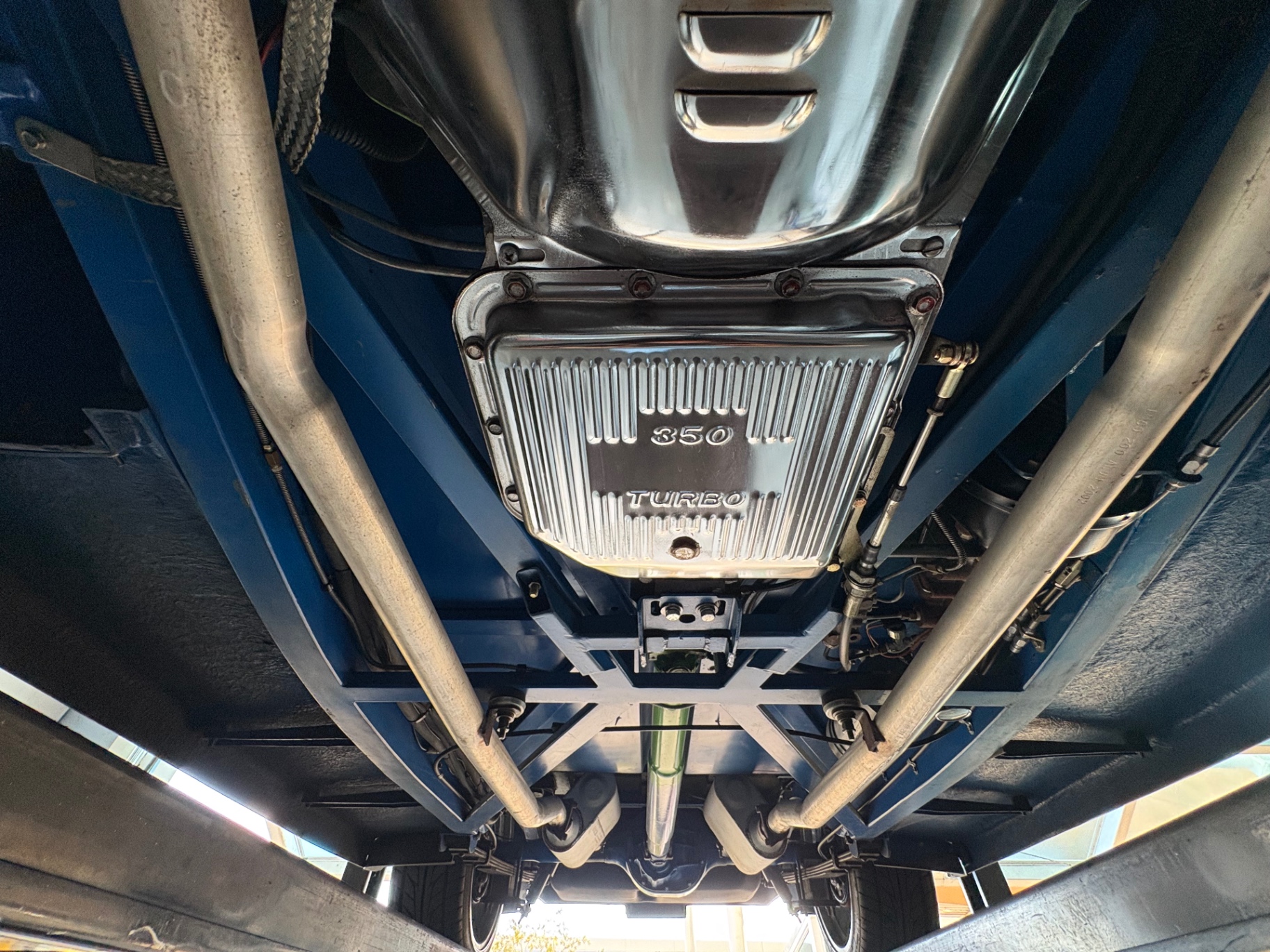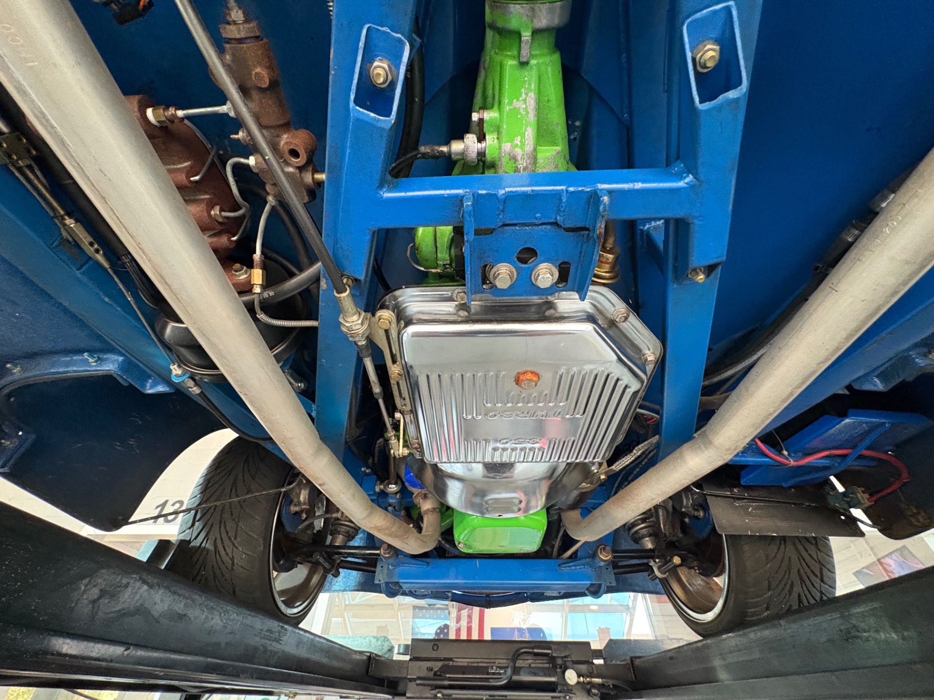 Stepping inside, the custom leather interior bathes you in luxury, with every element tailored for comfort and elegance. The power windows, tilt steering wheel, and custom console add layers of modern convenience, while the LOKAR shifter and classic gauges nod to its vintage roots. Entertainment is premium with a custom stereo system equipped with Bluetooth and Sirius XM connectivity, ensuring enjoyable rides. The billet pedals and Le Carra steering wheel not only enhance functionality but also the aesthetic appeal of the cabin.