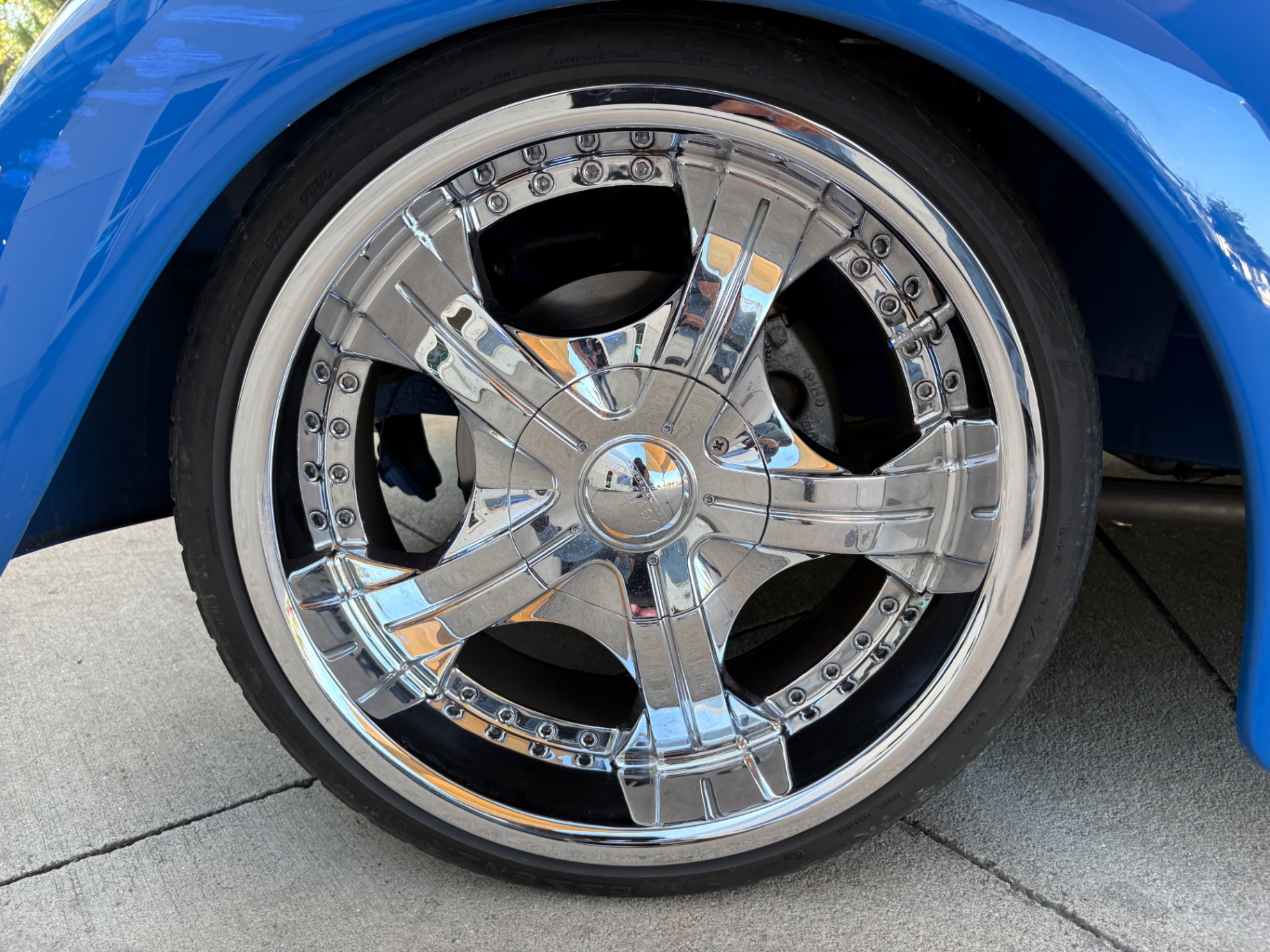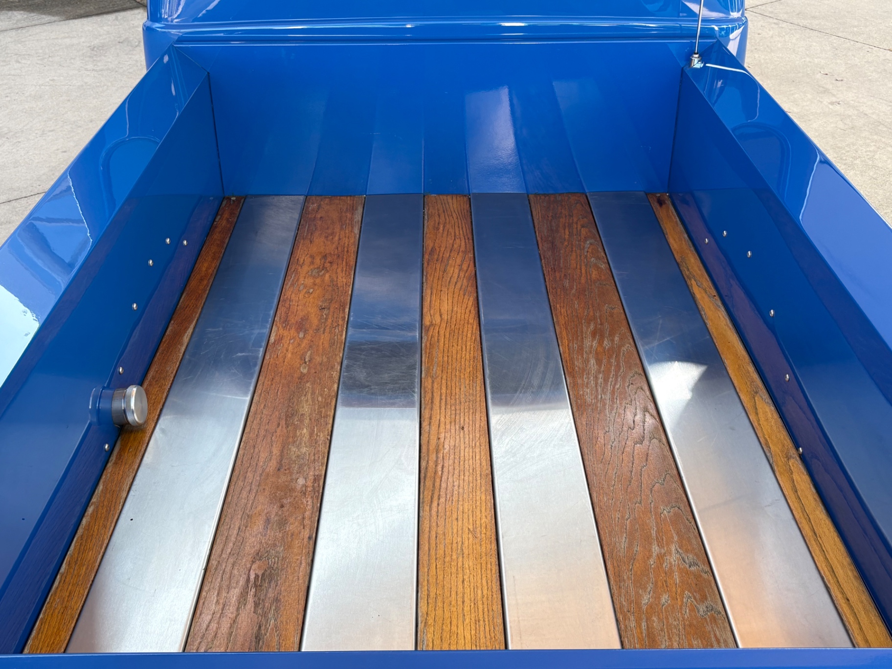 The striking blue exterior is expertly finished with PPG base coat clear coat paint, giving it a brilliant shine that commands attention. The 20-inch Devino Chrome wheels add a touch of sophistication and modern flair, perfectly complementing the vehicle's vintage charm. Detailing such as electric doors and a custom LMC wooden bed kit underscore the exclusivity and custom craftsmanship invested in this street rod.