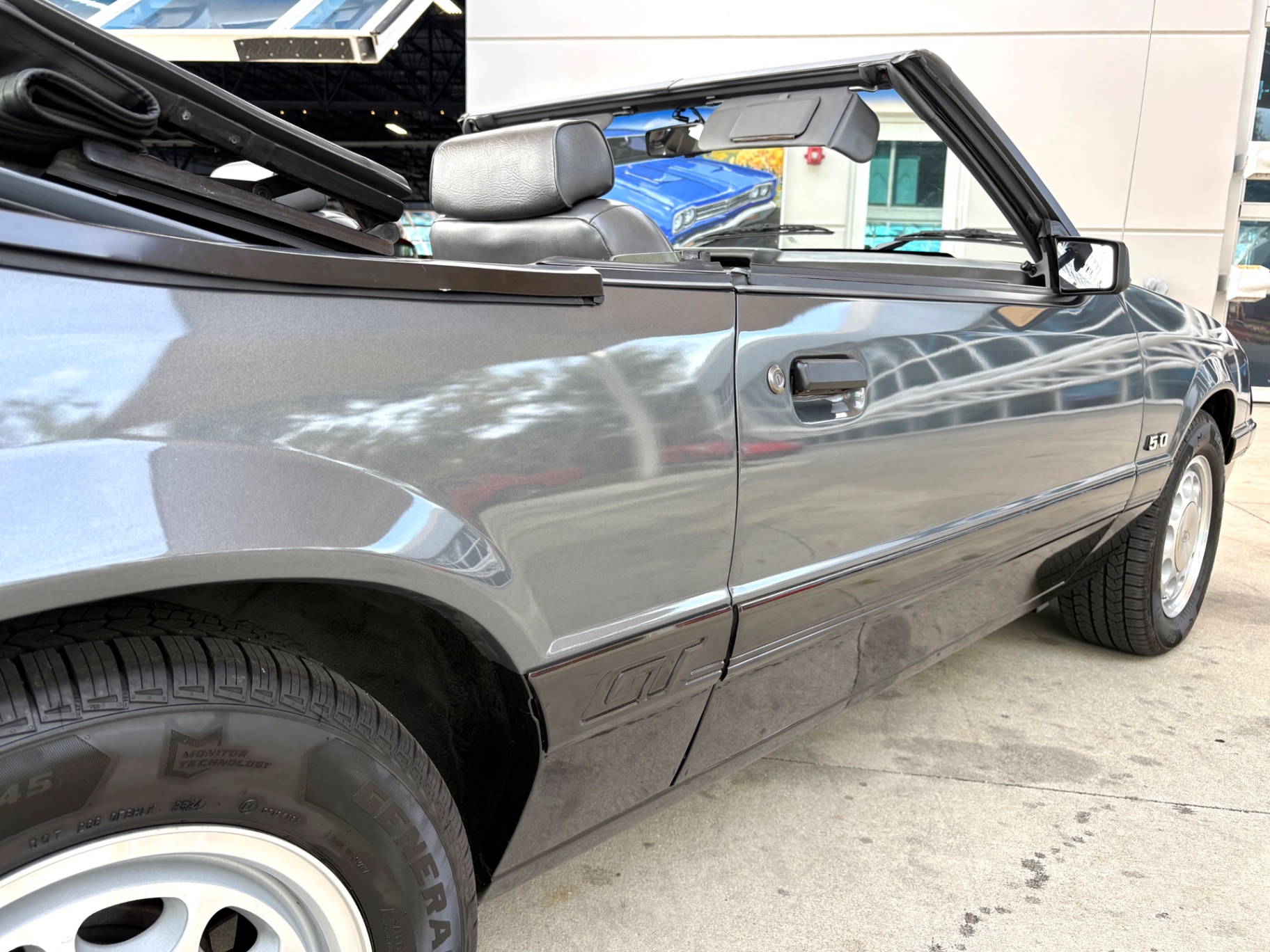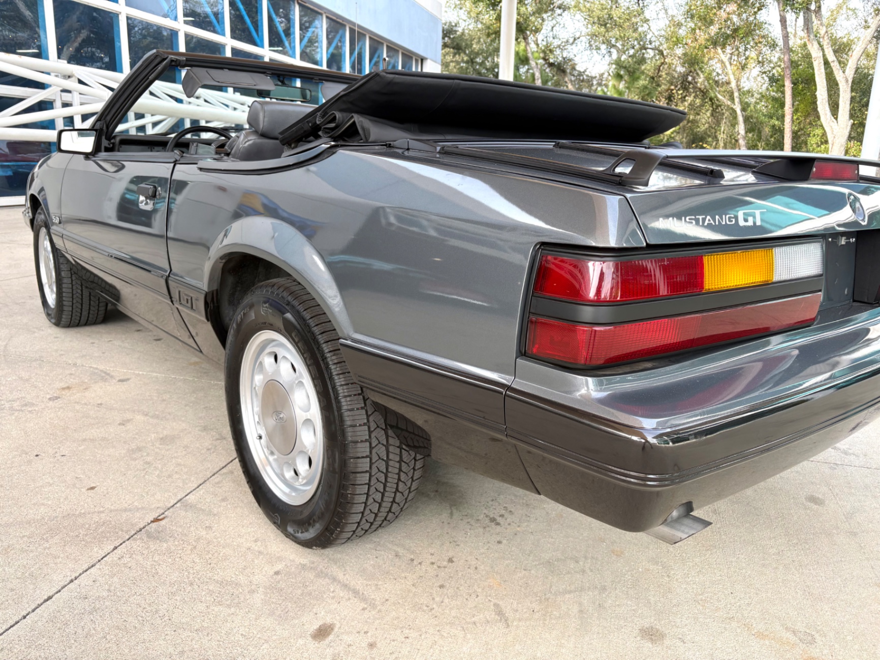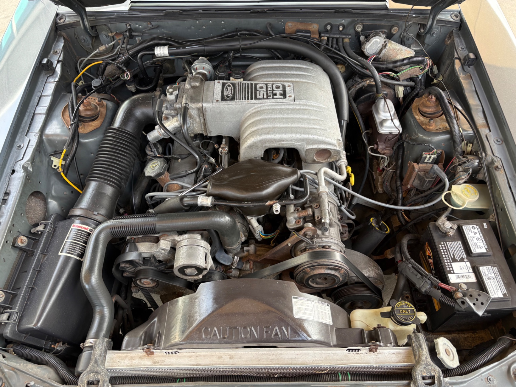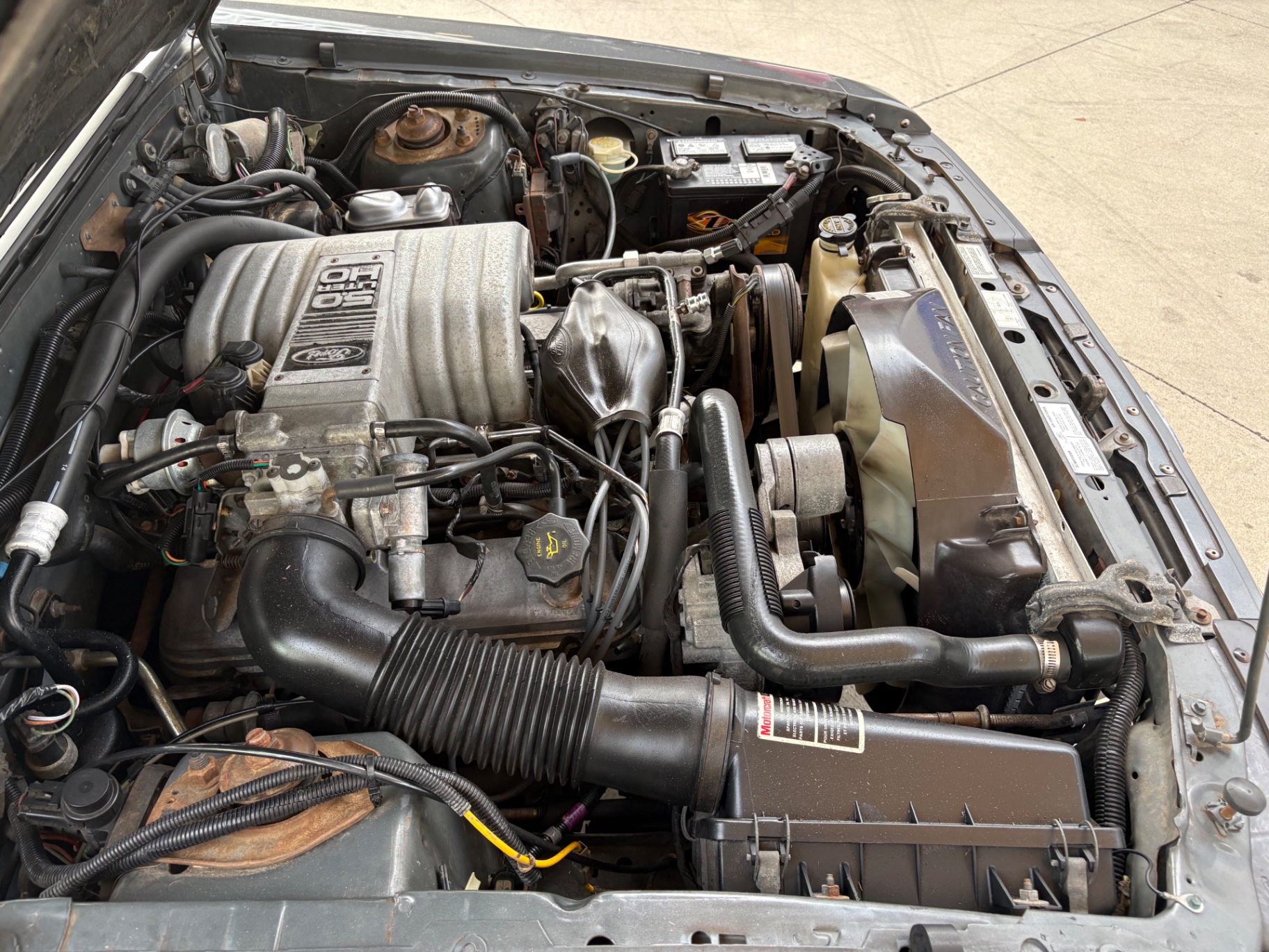 - 5.0-liter High Output (HO) V8 engine - Standard 5-speed Borg-Warner T-5 manual transmission - Sequential electronic fuel injection (SEFI) system - Flowmaster exhaust system - 8.8-inch rear axle with Traction-Lok limited slip differential - Heavy-duty suspension with independent coil springs in front and four-link coil-sprung in rear - Power-assisted front disc brakes and rear drum brakes - Power rack-and-pinion steering - Quad headlights and Marchal fog lights - final year for “four eyes” - Power convertible top mechanism - High-back articulated front sports seats - Air conditioning, power windows, and power steering - AM/FM cassette stereo with premium sound system option - Forged pistons and hydraulic roller lifters - Aftermarket Kenwood radio