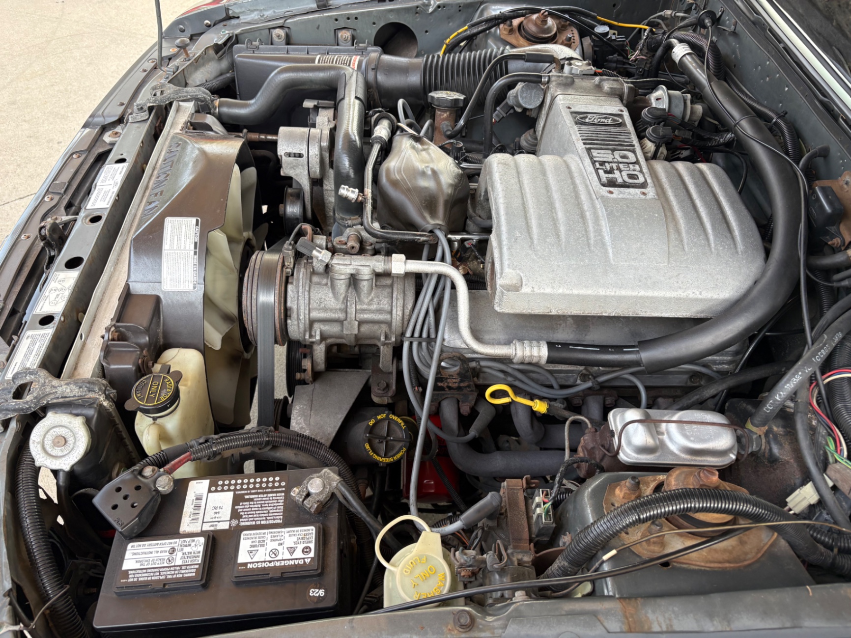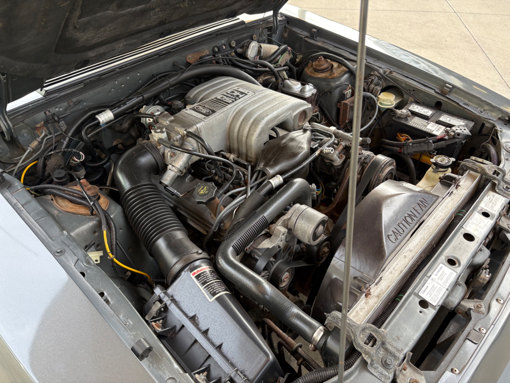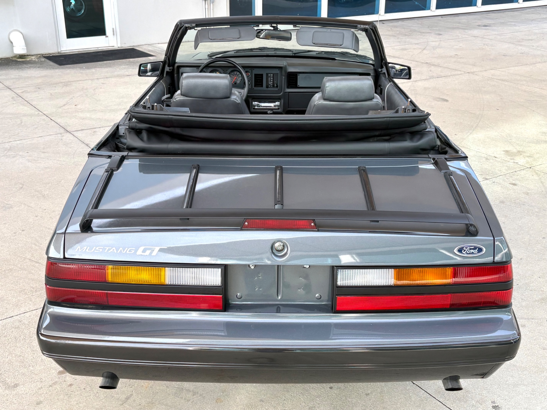 - 5.0-liter High Output (HO) V8 engine - Standard 5-speed Borg-Warner T-5 manual transmission - Sequential electronic fuel injection (SEFI) system - Flowmaster exhaust system - 8.8-inch rear axle with Traction-Lok limited slip differential - Heavy-duty suspension with independent coil springs in front and four-link coil-sprung in rear - Power-assisted front disc brakes and rear drum brakes - Power rack-and-pinion steering - Quad headlights and Marchal fog lights - final year for “four eyes” - Power convertible top mechanism - High-back articulated front sports seats - Air conditioning, power windows, and power steering - AM/FM cassette stereo with premium sound system option - Forged pistons and hydraulic roller lifters - Aftermarket Kenwood radio