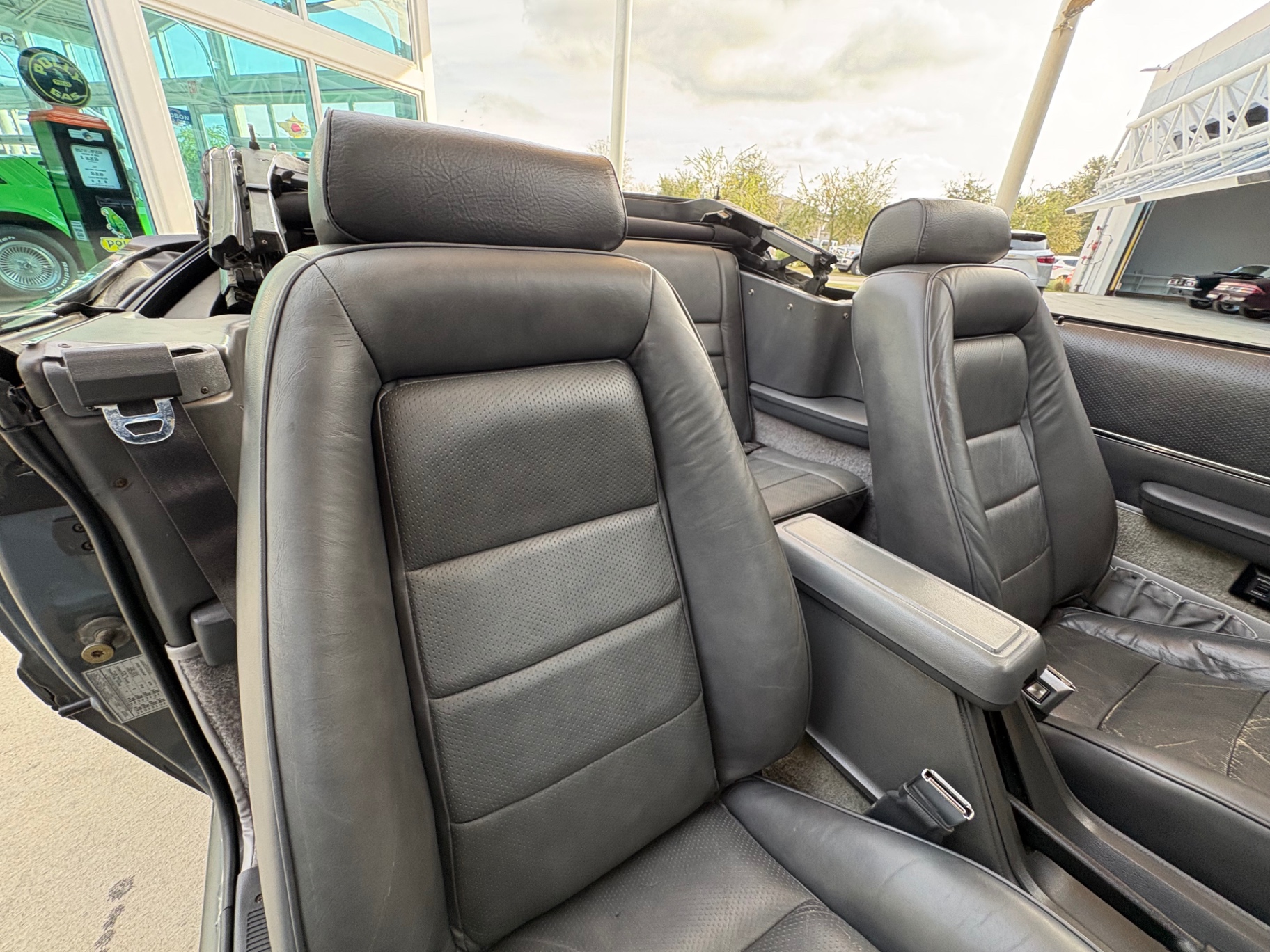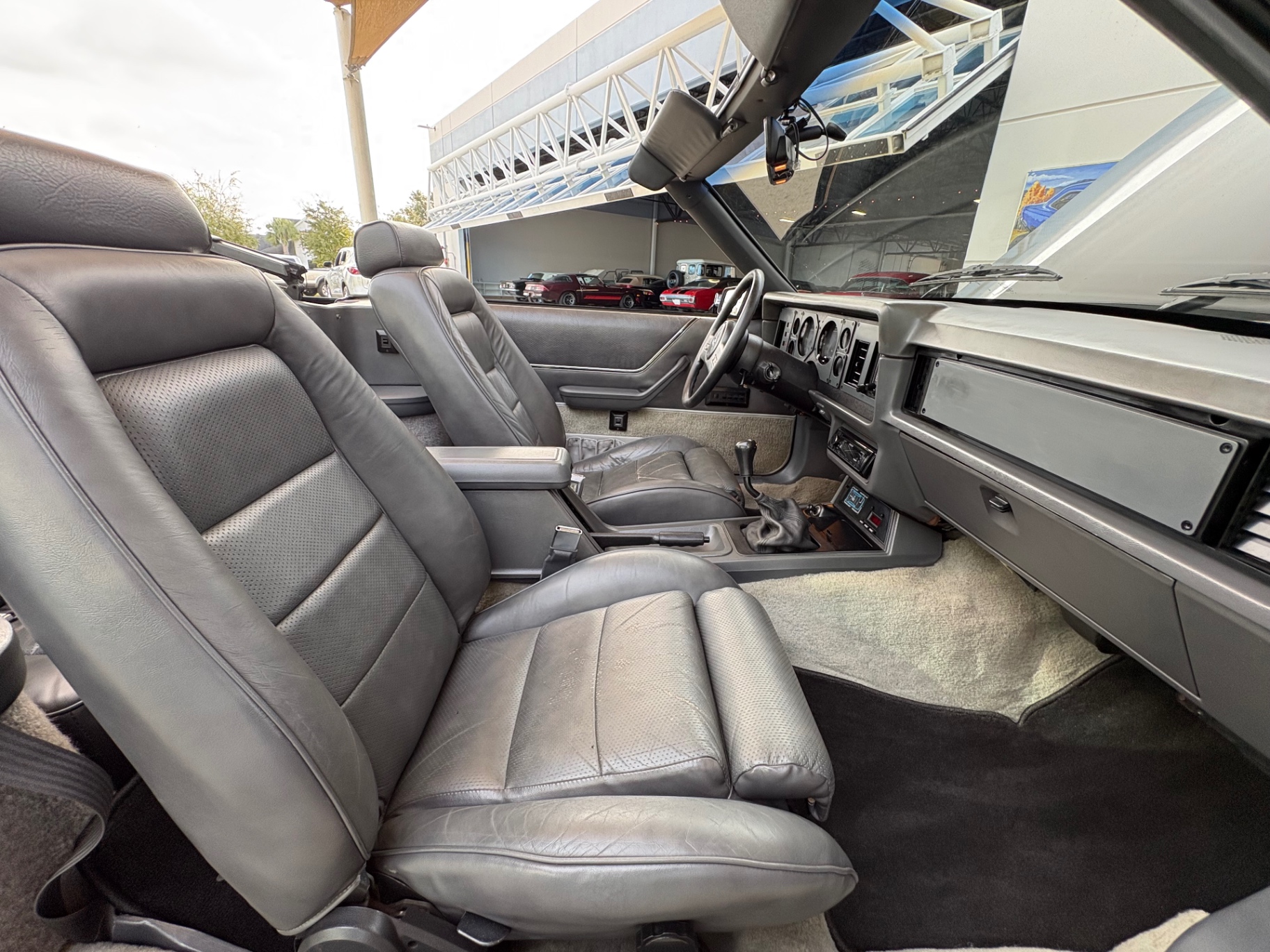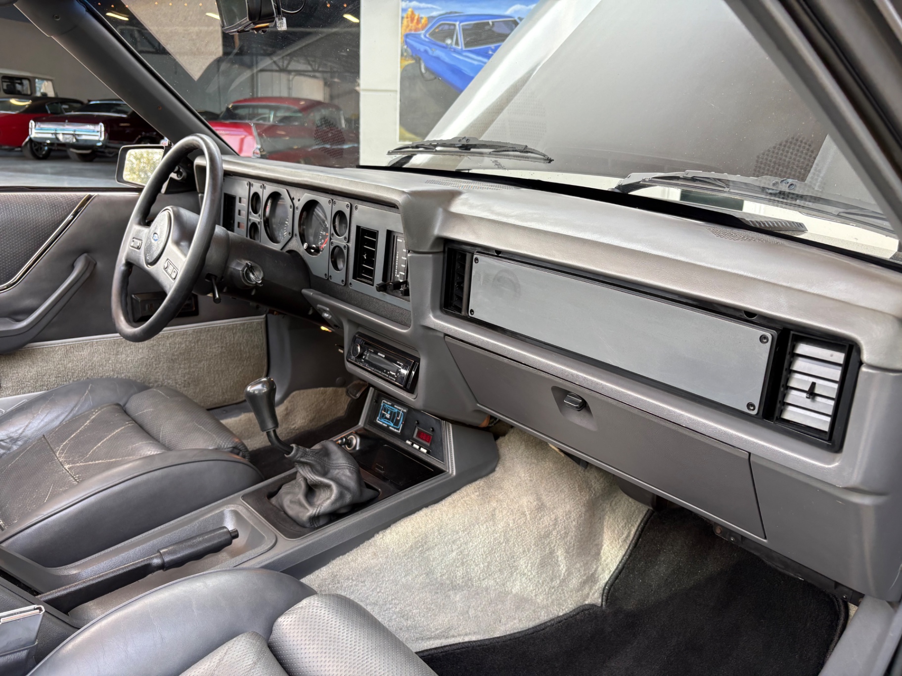 Stepping inside the Mustang, the grey leather interior immediately welcomes you with a blend of sportiness and comfort. High-back front sports seats offer excellent support and positioning for both spirited drives and leisurely cruises. Modern conveniences such as air conditioning, power windows, and an upgraded Kenwood radio system with AM/FM cassette provide a comfortable and enjoyable driving experience. Every element, from the dashboard layout to the door panels, reflects a thoughtful attention to driver and passenger needs during its era.