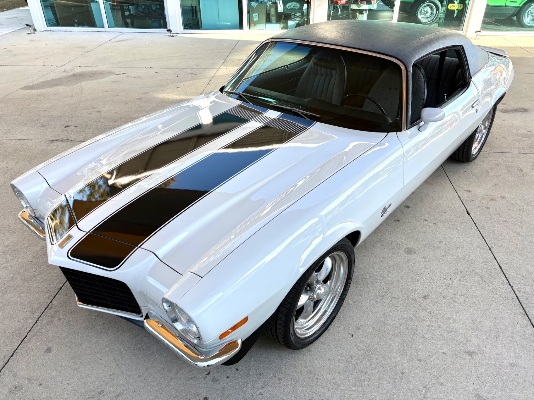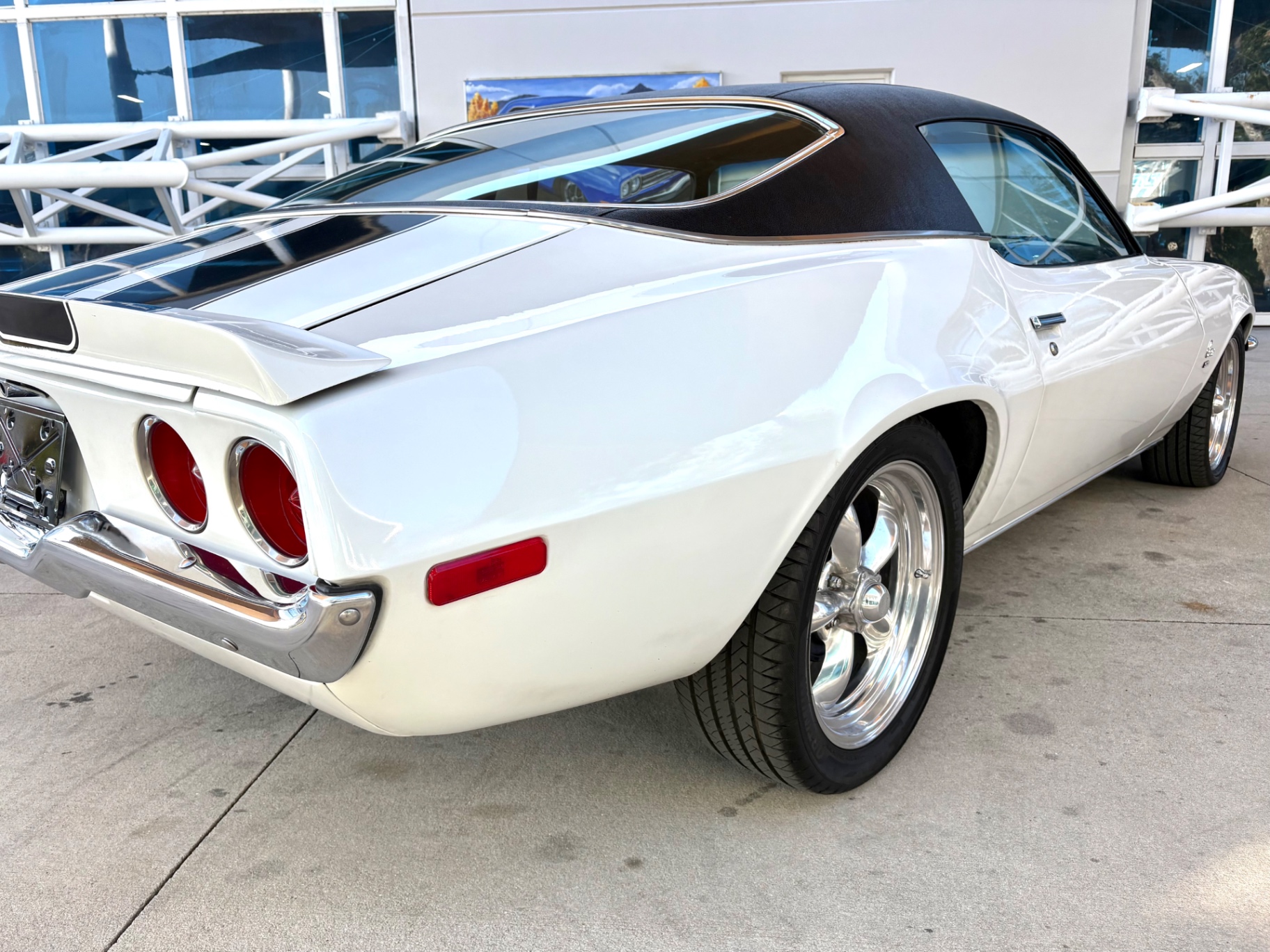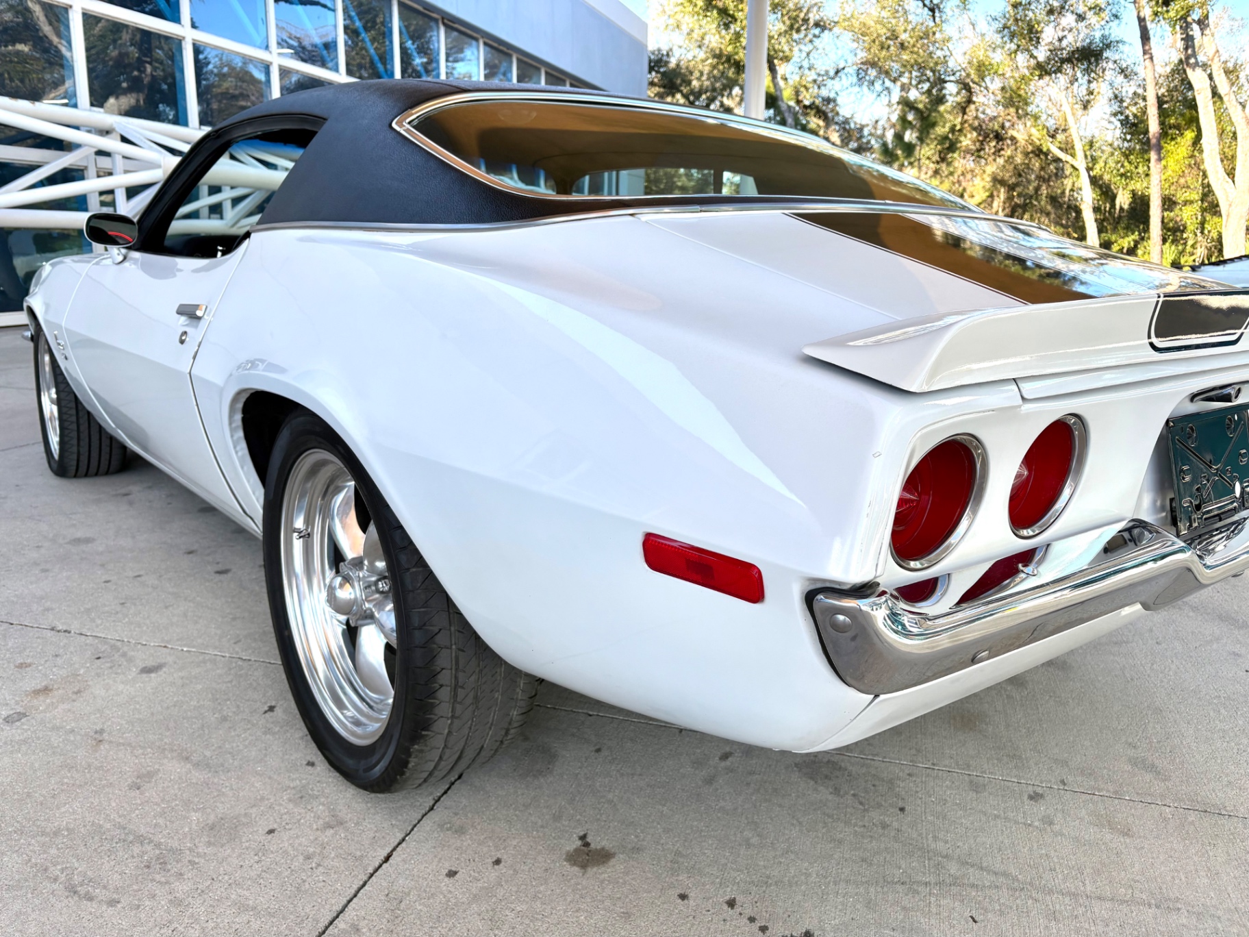 The exterior of this 1972 Chevrolet Camaro is striking, showcasing a clean, white finish that enhances its muscular stance. The split bumper design serves as a key hallmark of the RS trim, offering a unique flair that differentiates it from standard models. The car sits on 18-inch American Torque Thrust wheels, showcasing a polished look that enhances its sporty character while providing optimum traction. A short rear spoiler contributes to the improved aerodynamics and adds to its aggressive profile, combining form with function. The overall condition of the body is solid, indicating careful owner stewardship and maintenance over the years.