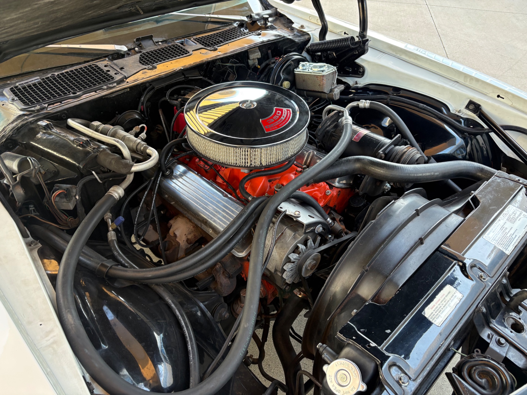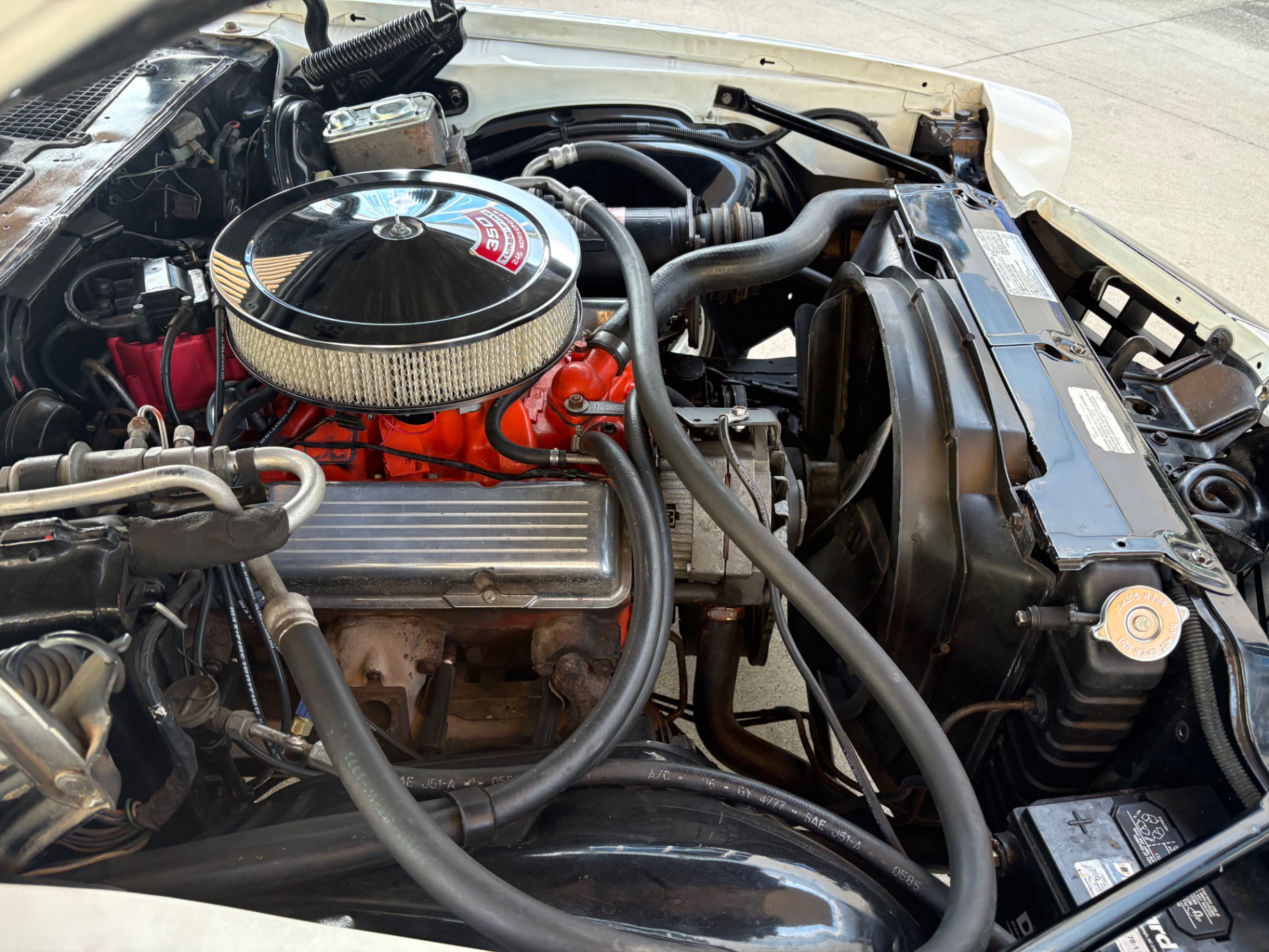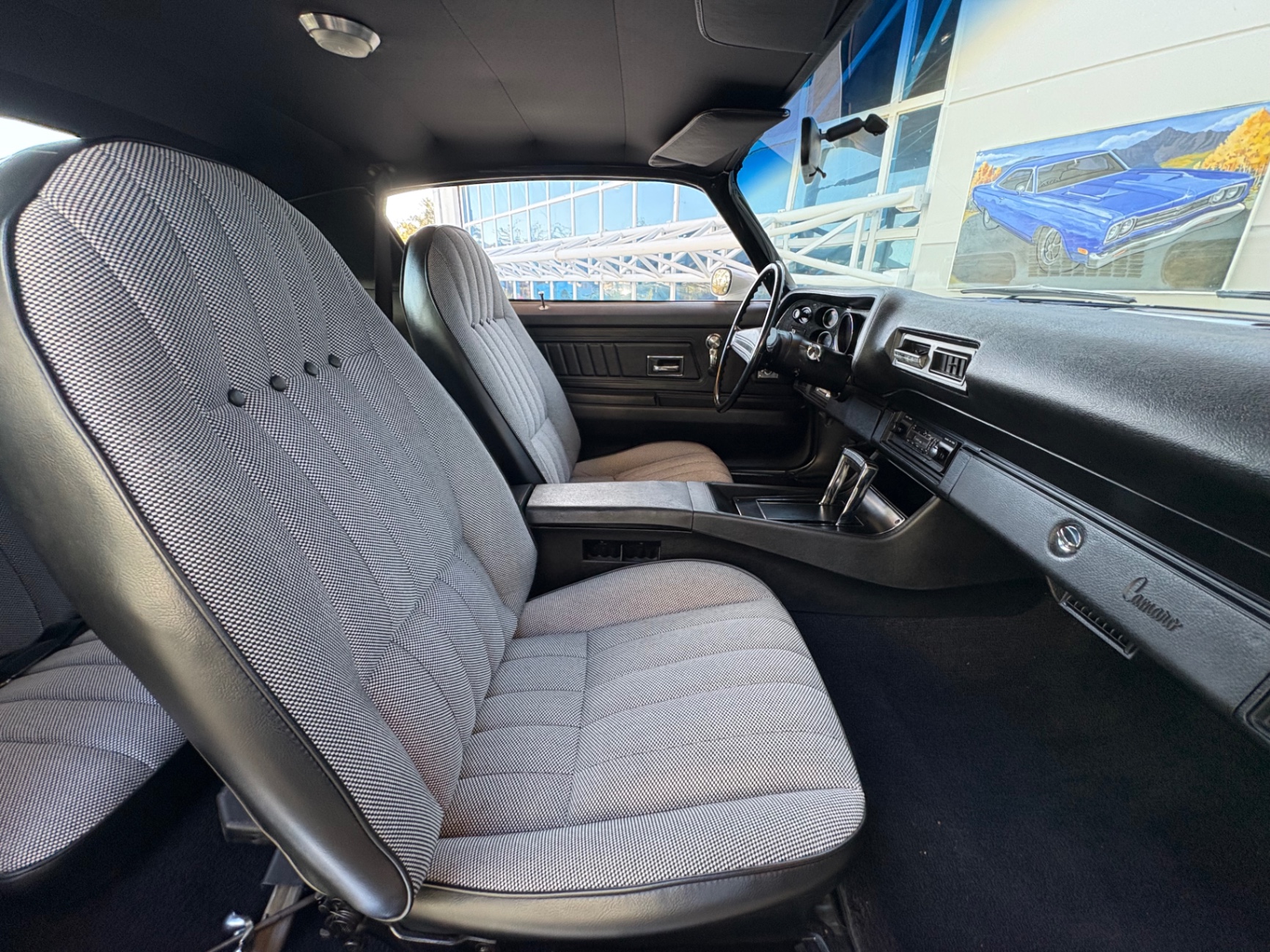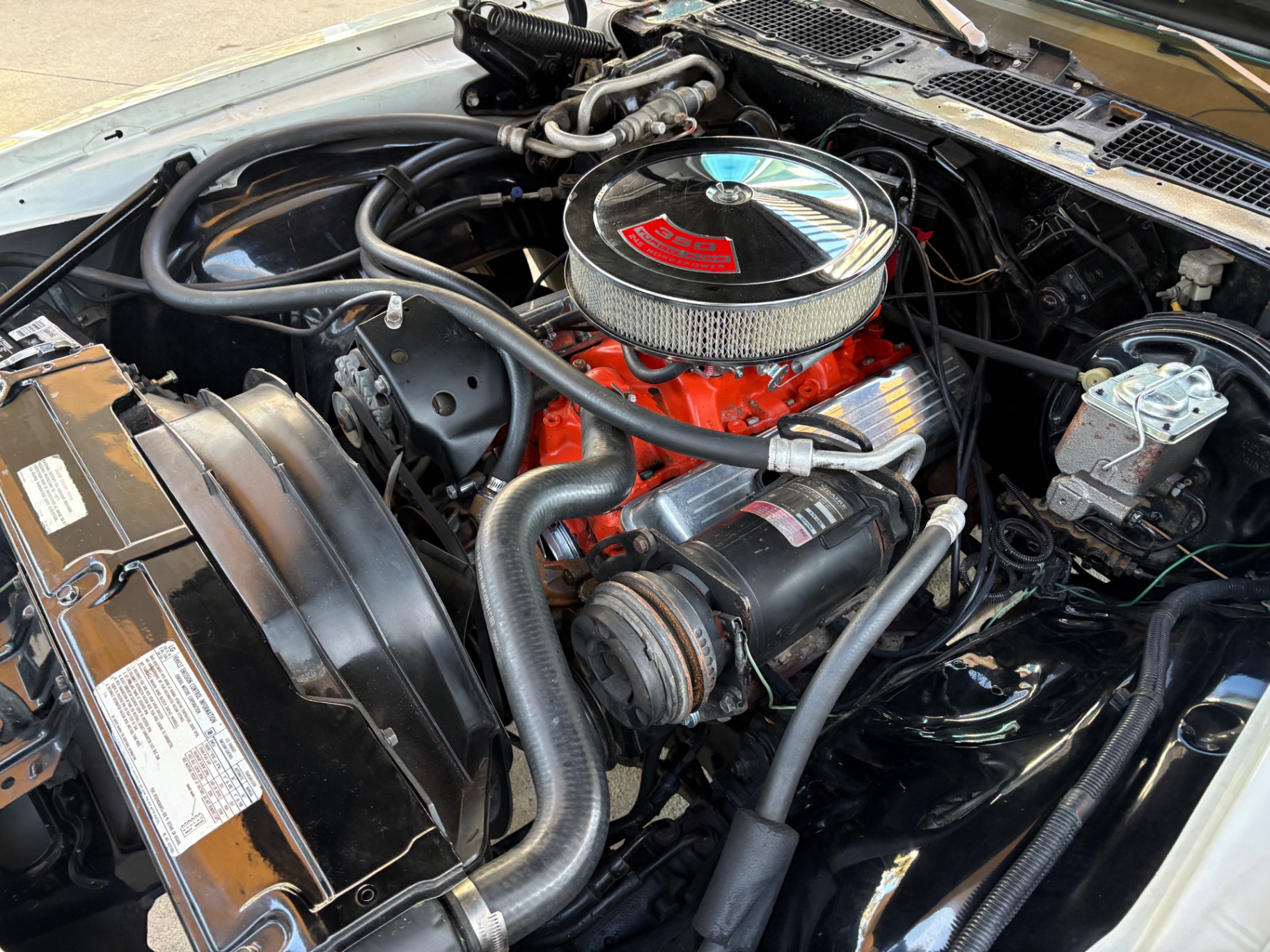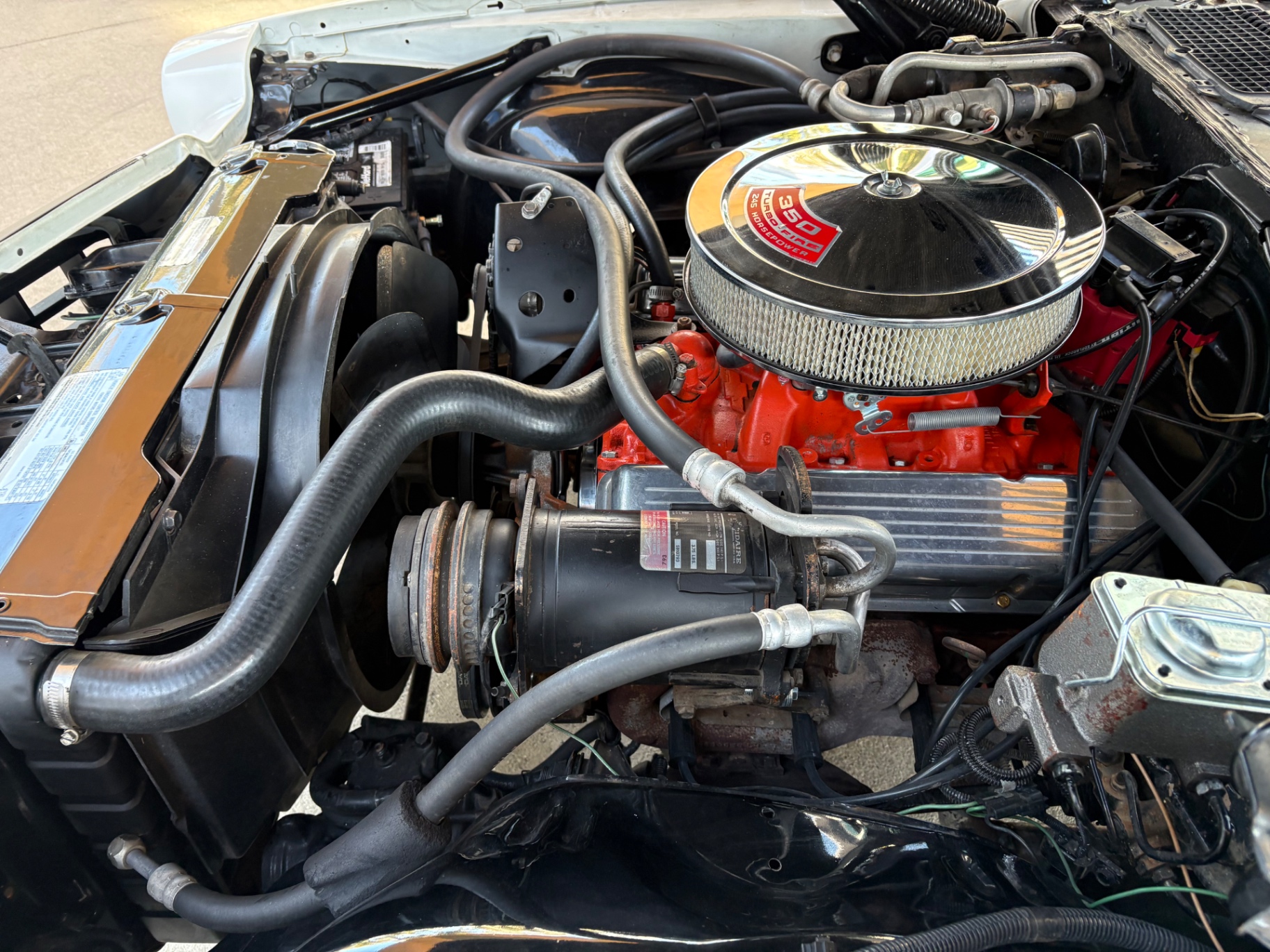 350 Turbo-Fire V8 engine 3-speed automatic transmission Power steering Power disc brakes Bucket seats with custom Houndstooth material A-arm front independent suspension Rear leaf spring suspension Simulated wood-grain instrument cluster Console featuring comfortable cupholders Flow-through ventilation system Aftermarket stereo for modern sound quality Short rear spoiler enhancing aerodynamics 18-inch American Torque Thrust wheels for a sporty look Flowmaster exhaust system providing a distinct sound and performance Clean and solid condition, ready for daily driving and shows
