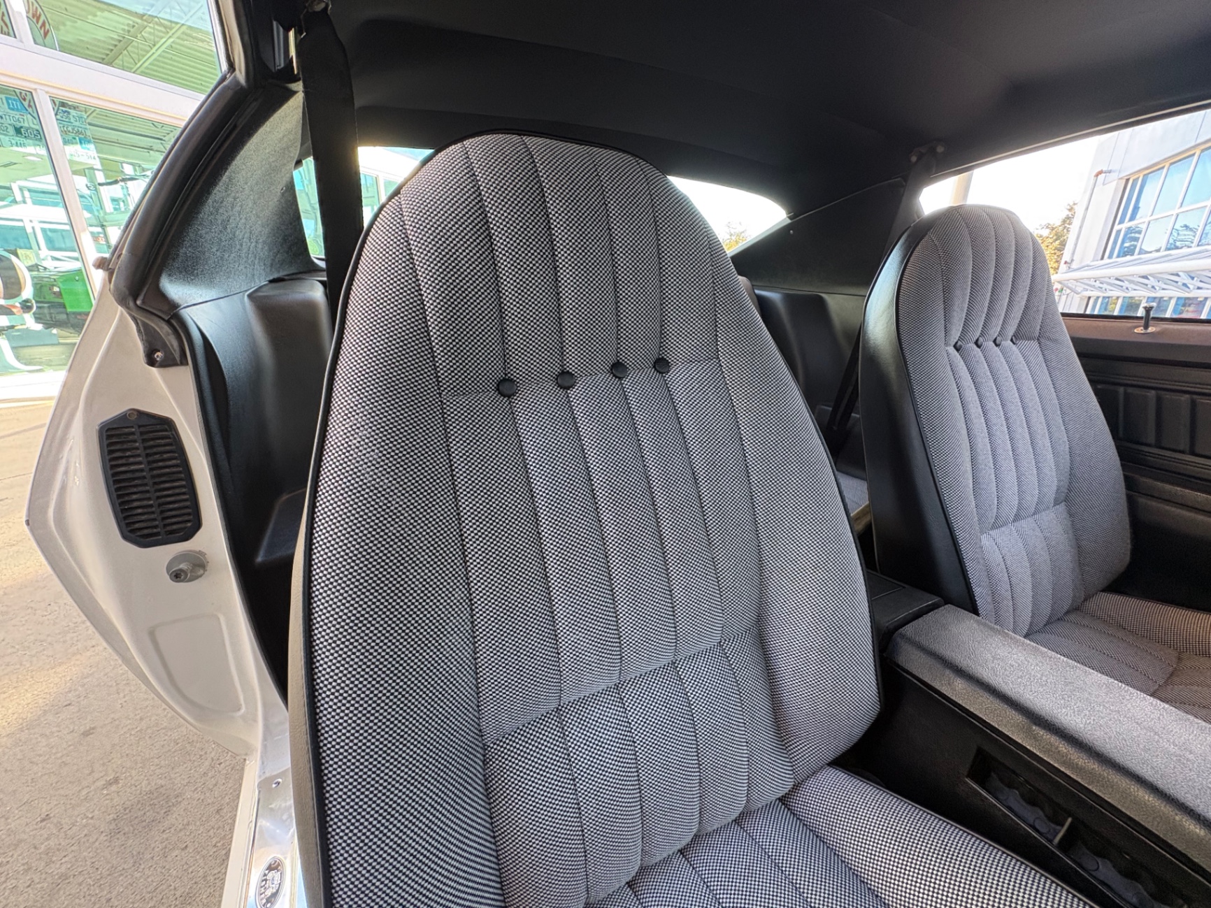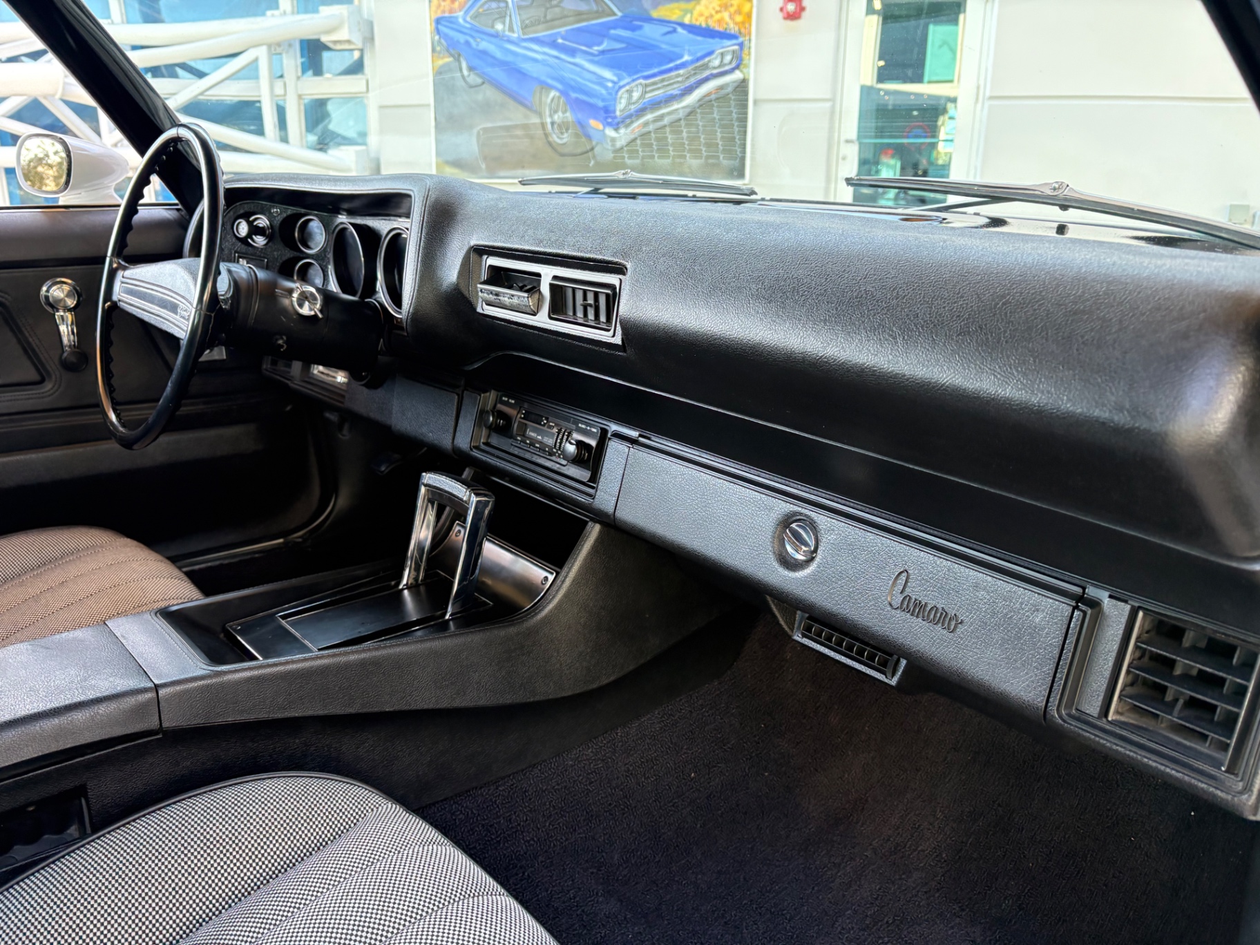 Stepping inside the Camaro reveals a well-maintained interior that blends classic styling with modern touches. The black and gray cockpit features bucket seats dressed in custom Houndstooth material, providing both comfort and a classic aesthetic that appeals to vintage car enthusiasts. The simulated wood-grain instrument cluster adds a touch of class and is both functional and stylish, housing essential gauges for monitoring performance. Amenities like a flow-through ventilation system ensure passenger comfort on long drives. An aftermarket stereo allows you to enjoy your favorite tunes while you cruise, updating the driving experience to meet contemporary expectations without sacrificing classic appeal.