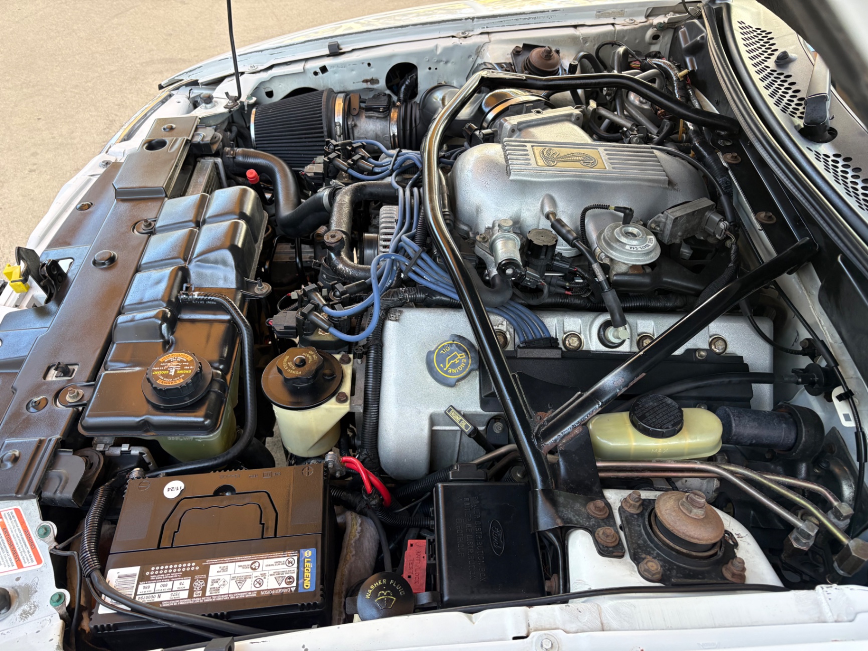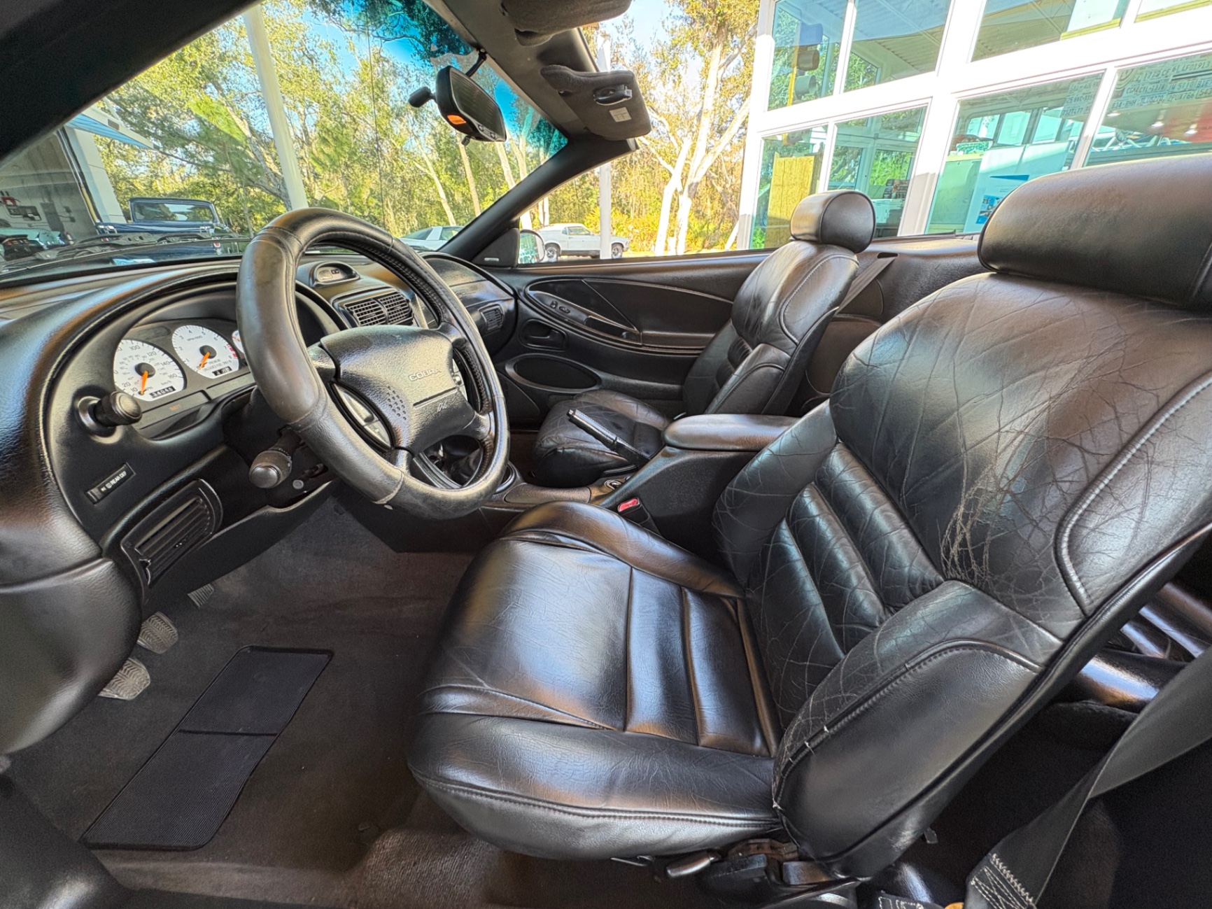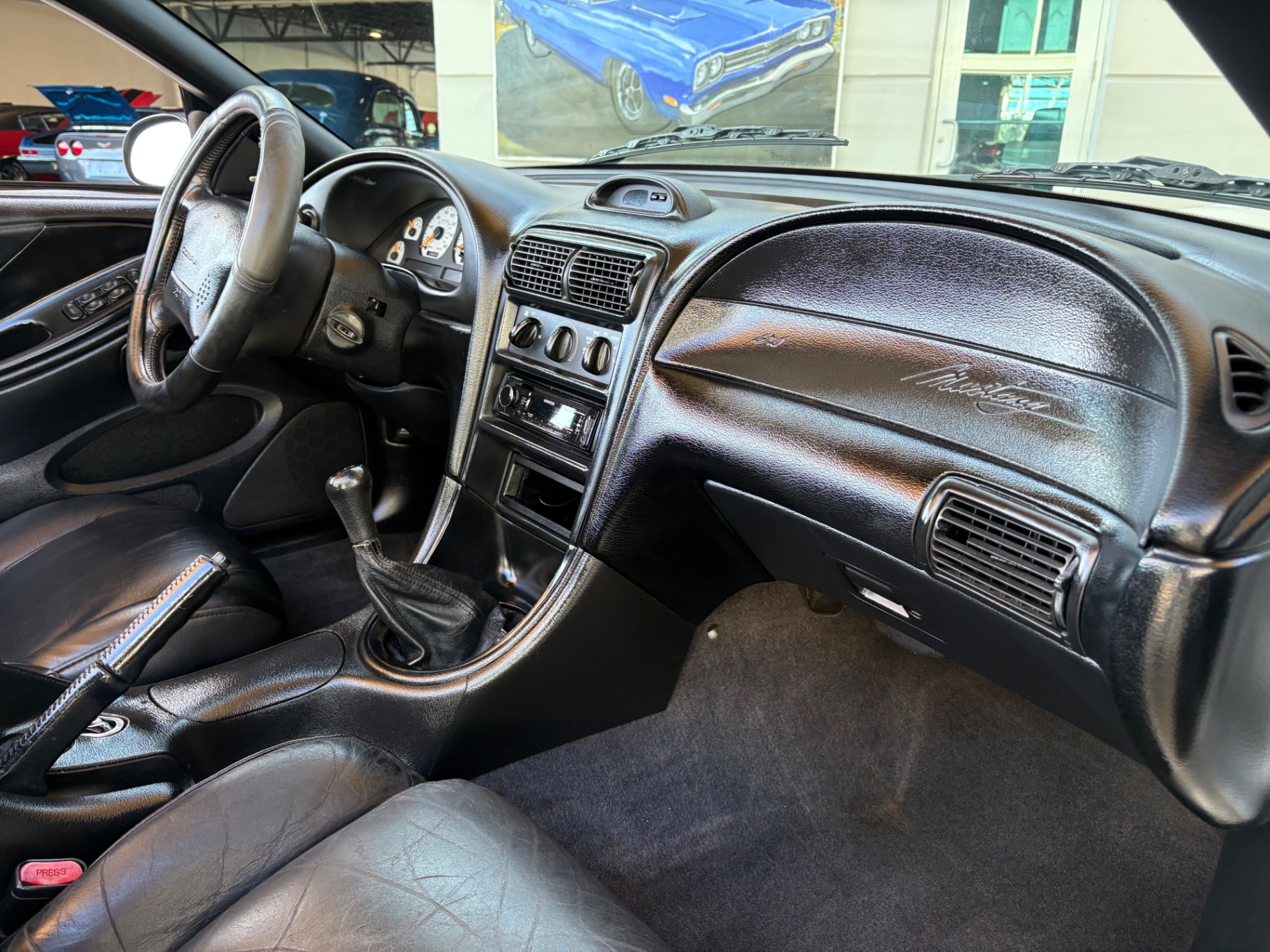 4.6-liter SOHC 2-valve V8 engine Borg-Warner T-45 5-speed manual transmission Traction-Lok limited-slip rear differential 3.27 rear axle ratio Rear-wheel drive Dual exhaust with stainless steel tips Heavy-duty front and rear stabilizer bars Gas-pressurized front struts and rear shocks Power rack-and-pinion steering Four-wheel power disc brakes Anti-lock braking system (ABS) GT-specific front fascia and integrated fog lamps Rear spoiler Power side mirrors Variable interval windshield wipers Articulated front bucket seats Leather seating 50/50 split-folding rear seat Leather-wrapped steering wheel Tilt steering column Cruise control Power windows and locks Air conditioning Passive Anti-Theft System (PATS)