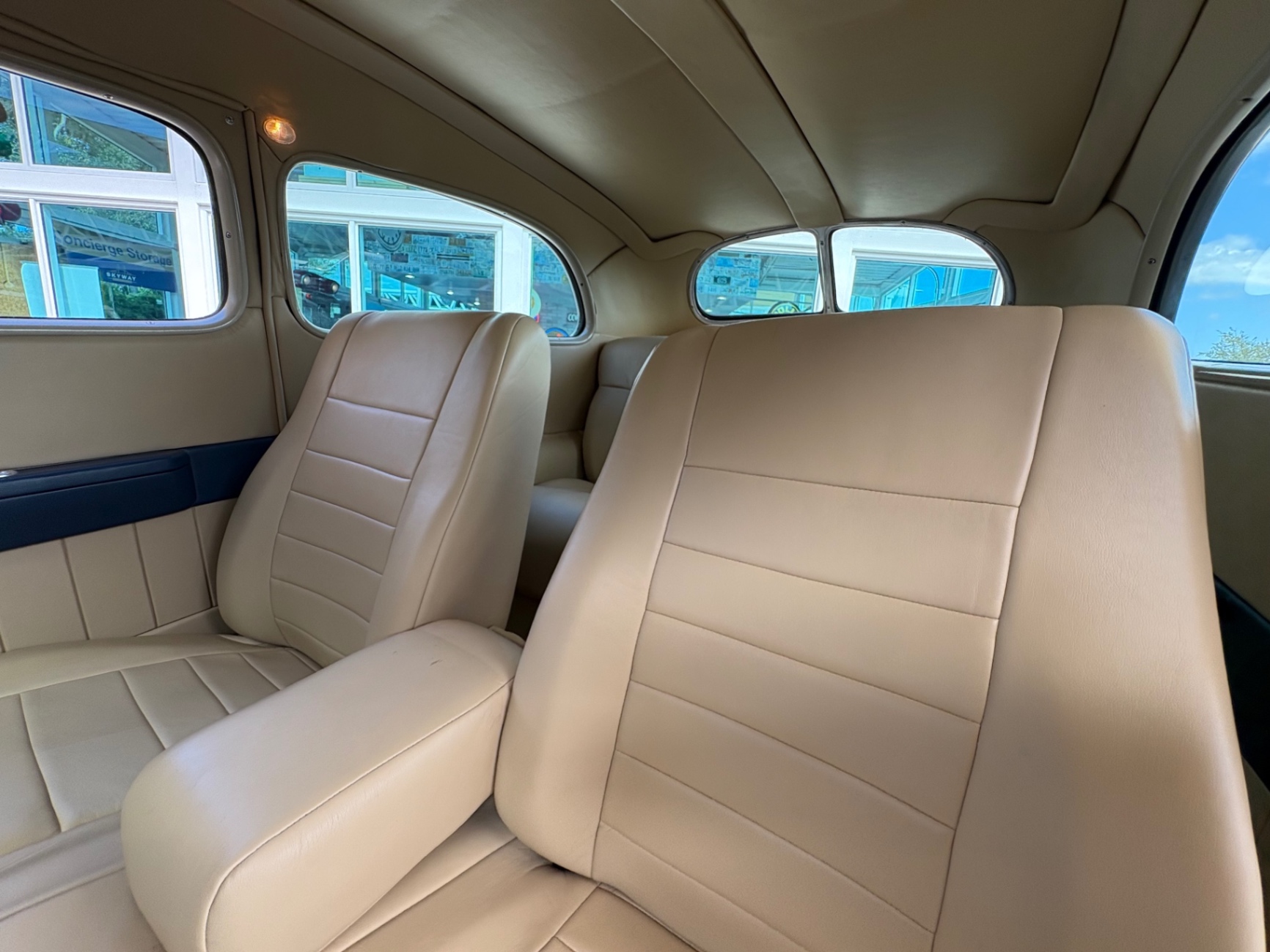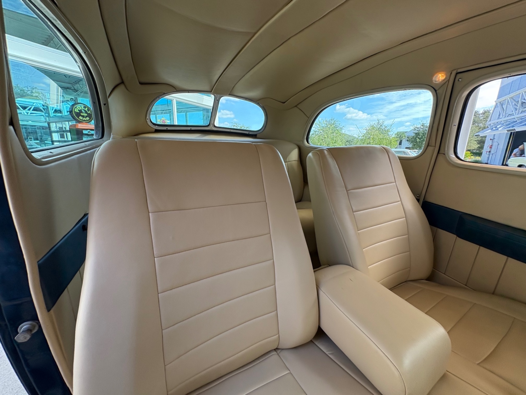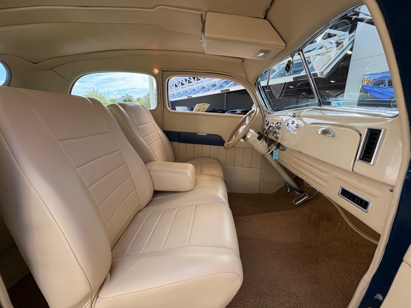 Step inside this Slantback, and you are greeted by a sanctuary of luxury, showcasing a complete leather interior in a sophisticated tan hue. Reclining seats offer comfort on long drives, while the Banjo steering wheel adds a classic touch to the well-appointed design. Classic instrument gauges keep you informed of your vehicle's performance, while modern conveniences, such as a JVC stereo and electric wipers, ensure that this car is not just a showpiece but a driver-friendly classic. The attention to detail extends throughout, with an overhead console that houses features like a LOKAR gas pedal for added ease. The blend of the classic aesthetic with modern functionality makes this interior not only inviting but also practical for everyday use.