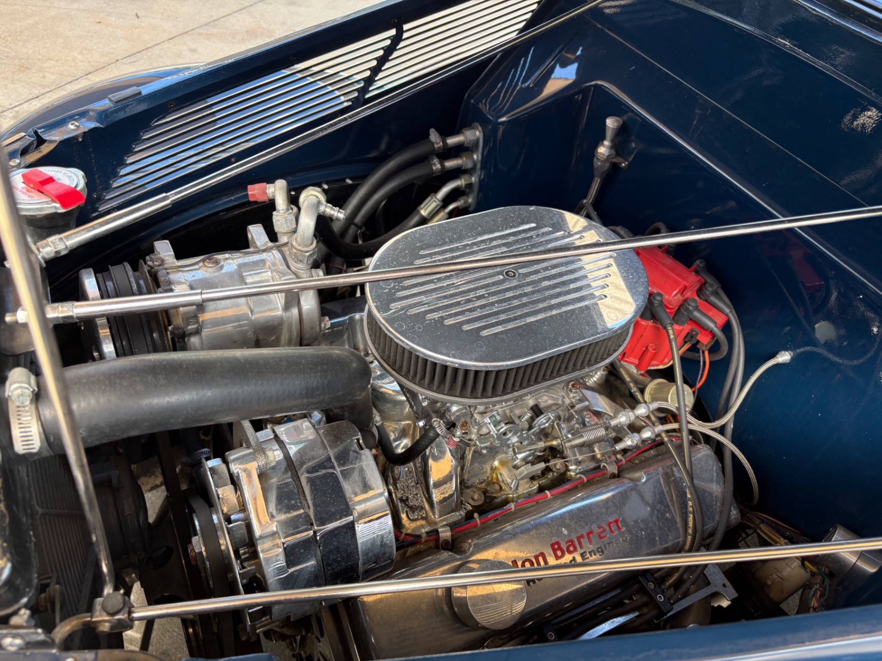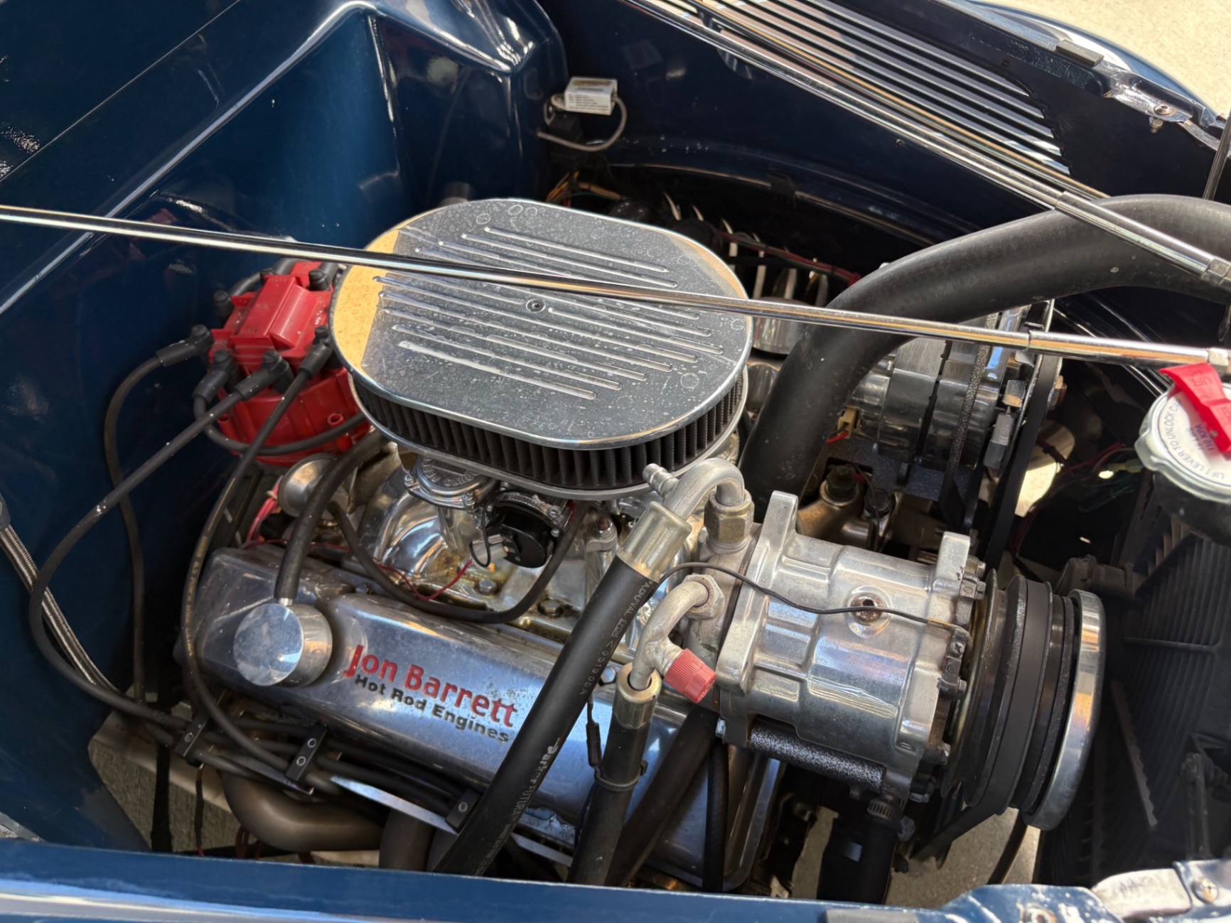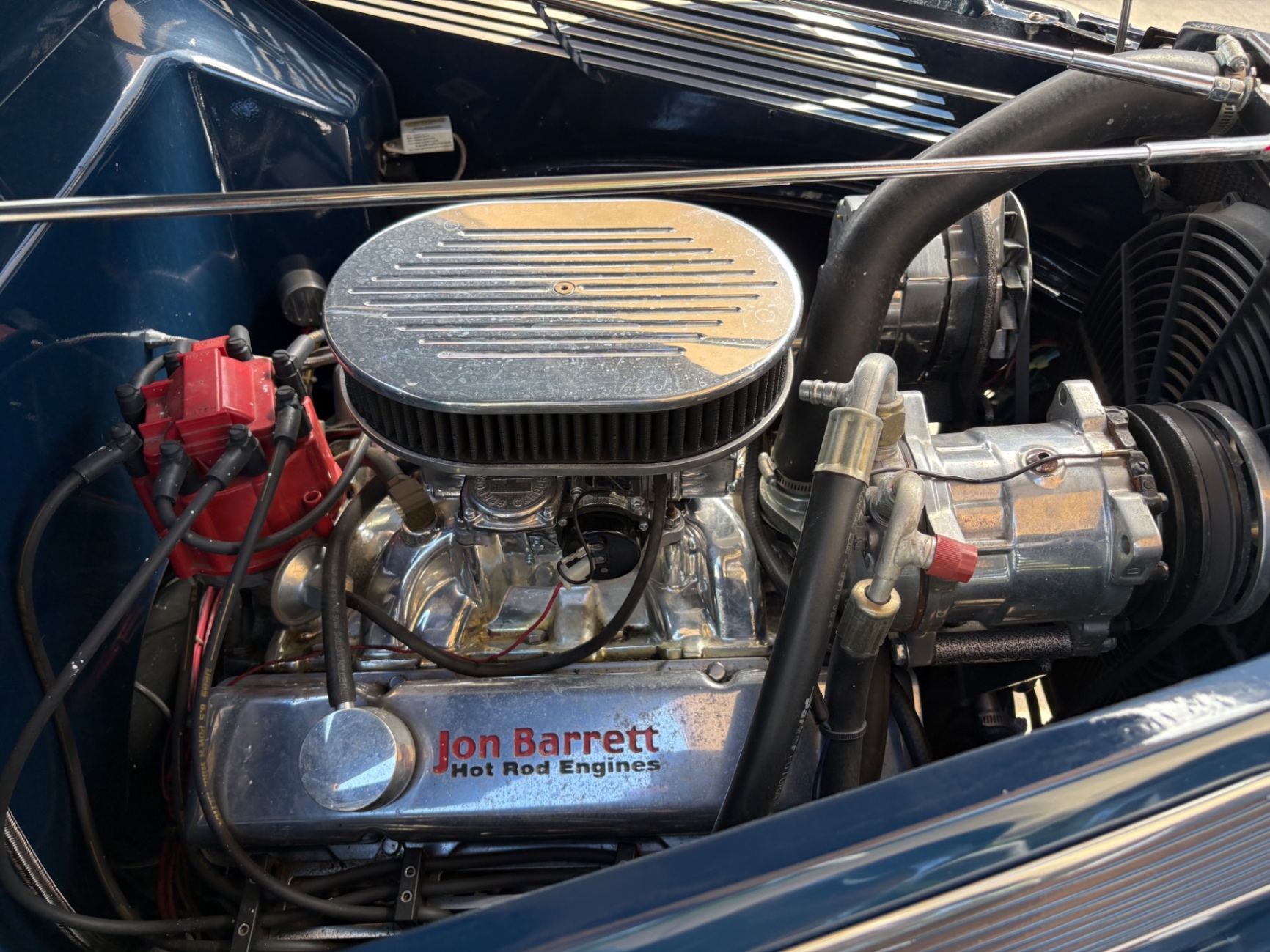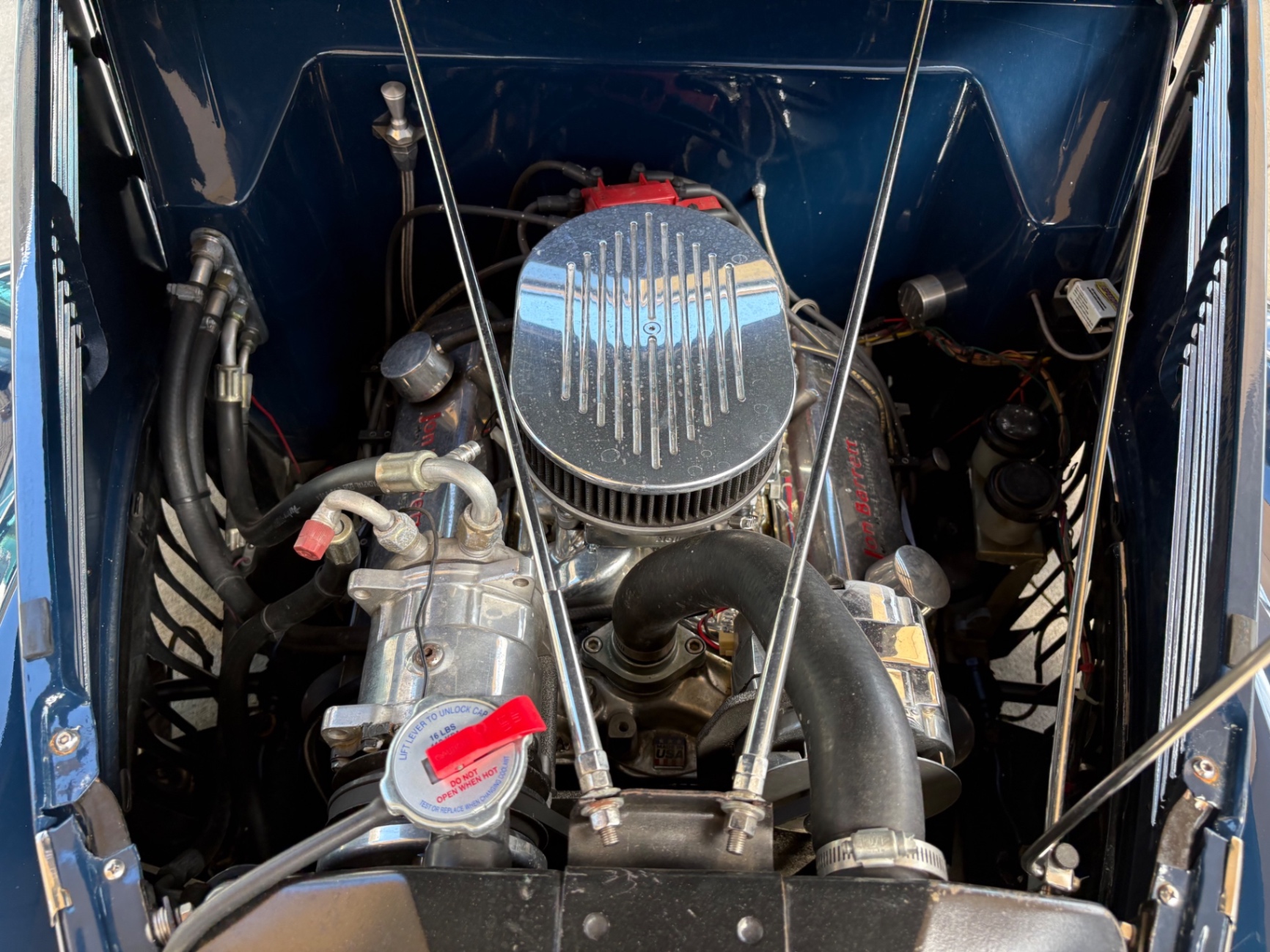 Steel Body GM Jon Barrett 350-325 hp Crate Engine 700R4 Transmission Heidts Front End Rack-N-Pinion Steering Tubular A Arms Disc Brakes Hooker Ceramic Coated Headers LOKAR Dip Sticks and Cables Walker Radiator Vintage A/C Speedway Stainless Hood Hinges and Prop Electric Wipers Tee's Leather Interior Reclining Seats Complete Leather Interior Banjo Steering Wheel Classic Instrument Gauges Tilt Wheel JVC Stereo Overhead Console LOKAR Gas Pedal Smooth 3rd Brake Light LED Tail Lights 9 Inch Ford Rear End 3:31 Ratio American Torque Thrust Wheels PPG Base Coat Clear Coat Paint Tinted Glass Tanks Inc. Gas Tank