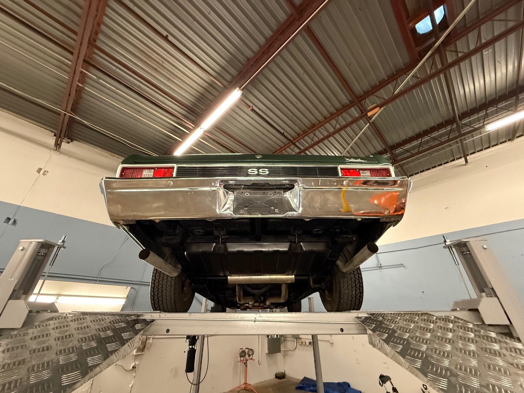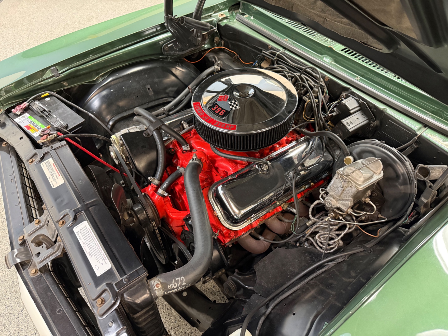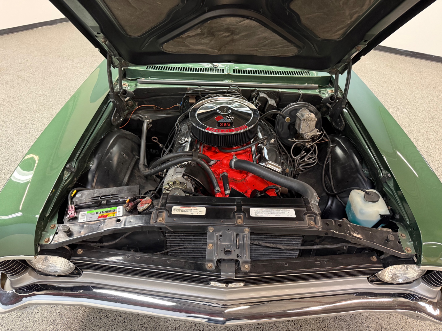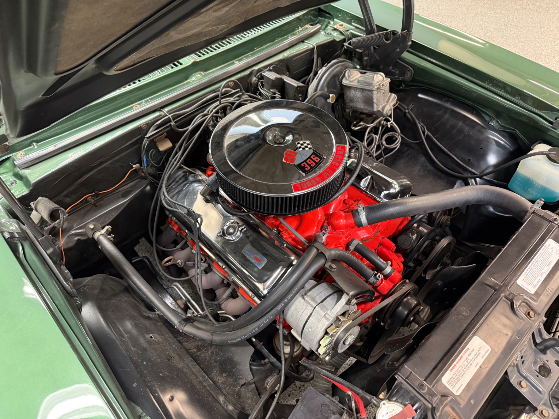 396 cubic inch V8 engine 4-speed manual transmission Power steering Power brakes Forest Green Poly exterior paint Matching green leather interior SS badge confirmation on front grille Aftermarket performance exhaust system High-speed tuned suspension Rally-style wheels with raised white lettering tires AM/FM radio with stereo system Front bucket seats for maximized comfort