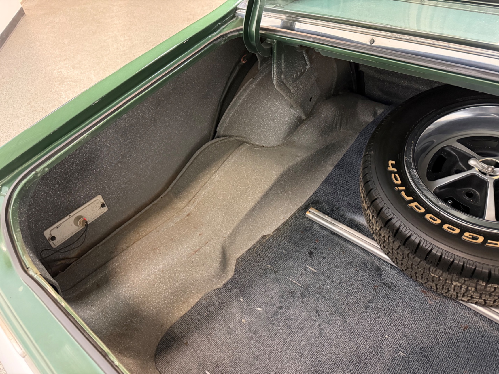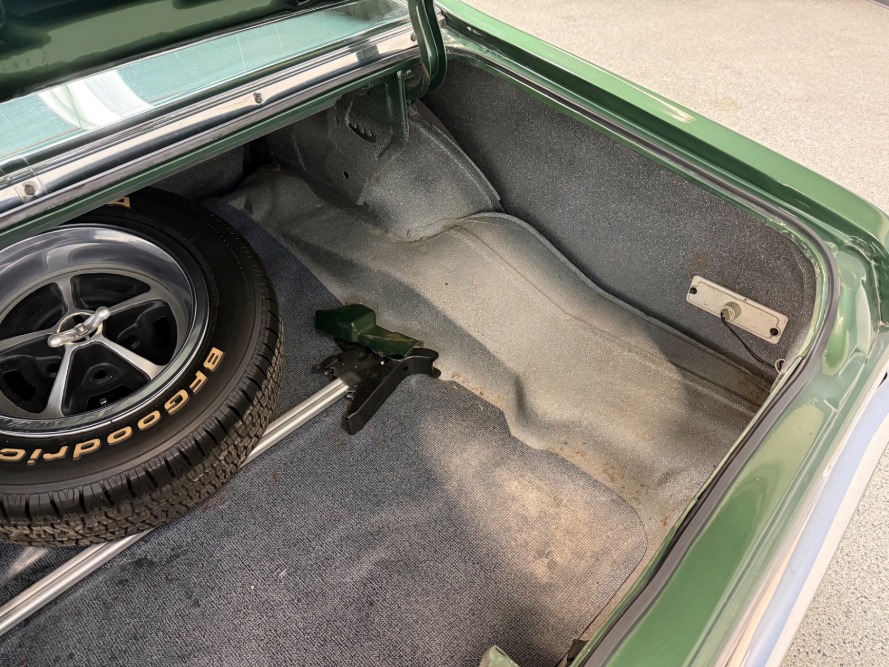 Additionally, the car features rally-style wheels fitted with raised white lettering tires, adding a sporty aesthetic that complements the strong lines of the vehicle. The chrome bumpers are in excellent condition, ensuring that the car retains its classic appeal while adding an elegant touch. Overall, the exterior is a blend of rugged masculinity and refined style, making it a perfect showcase of American muscle.