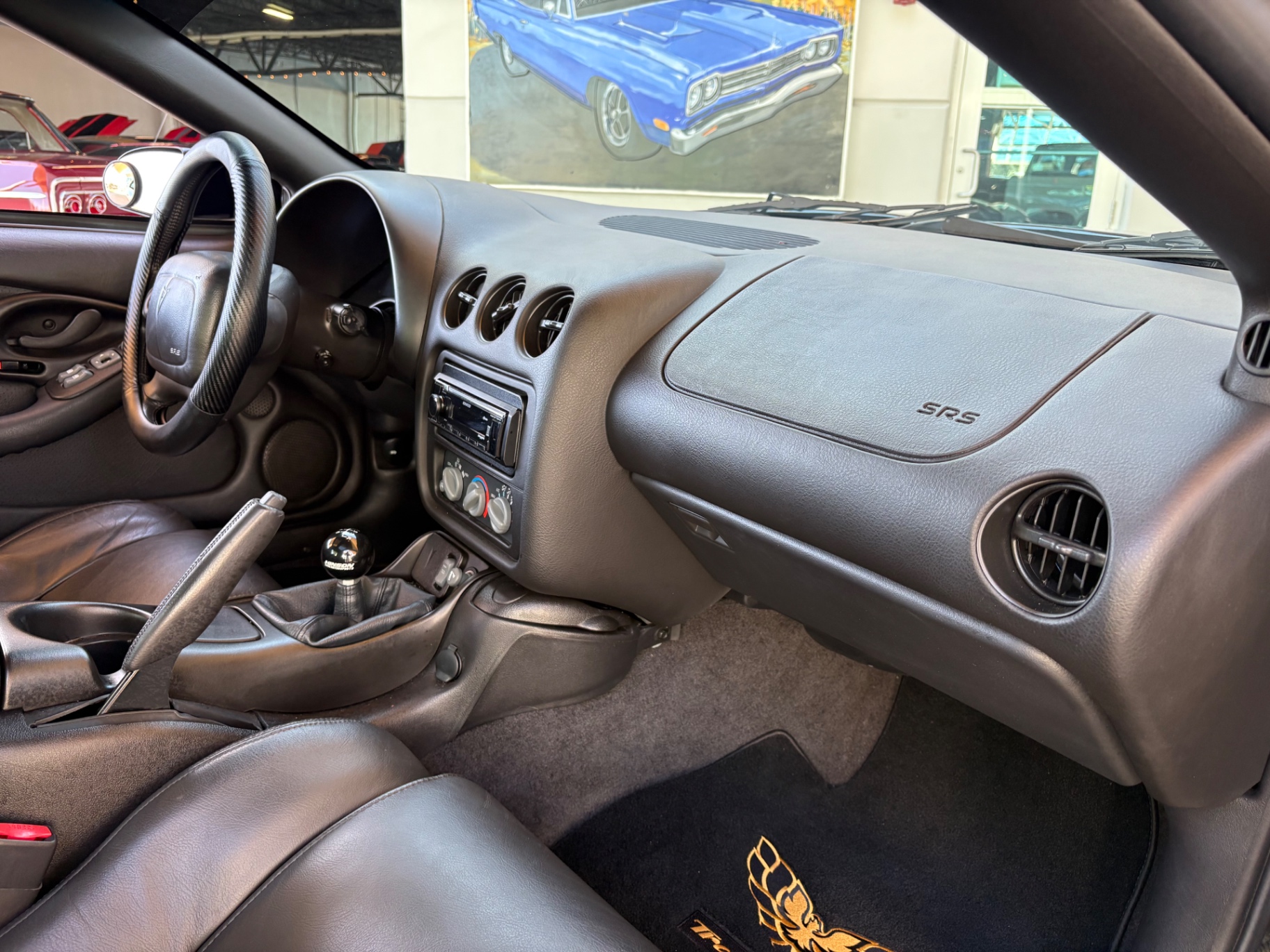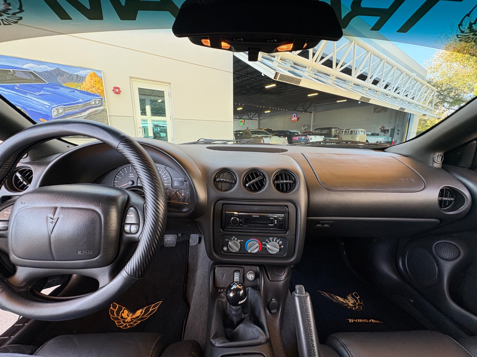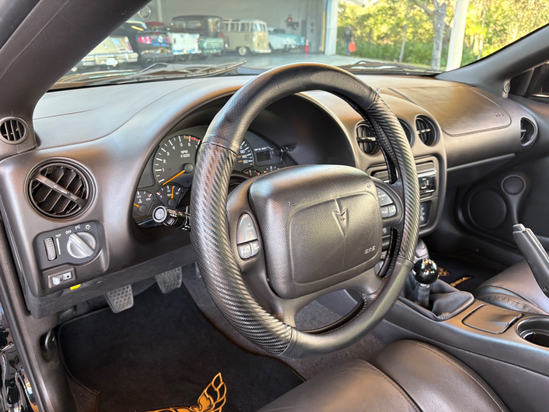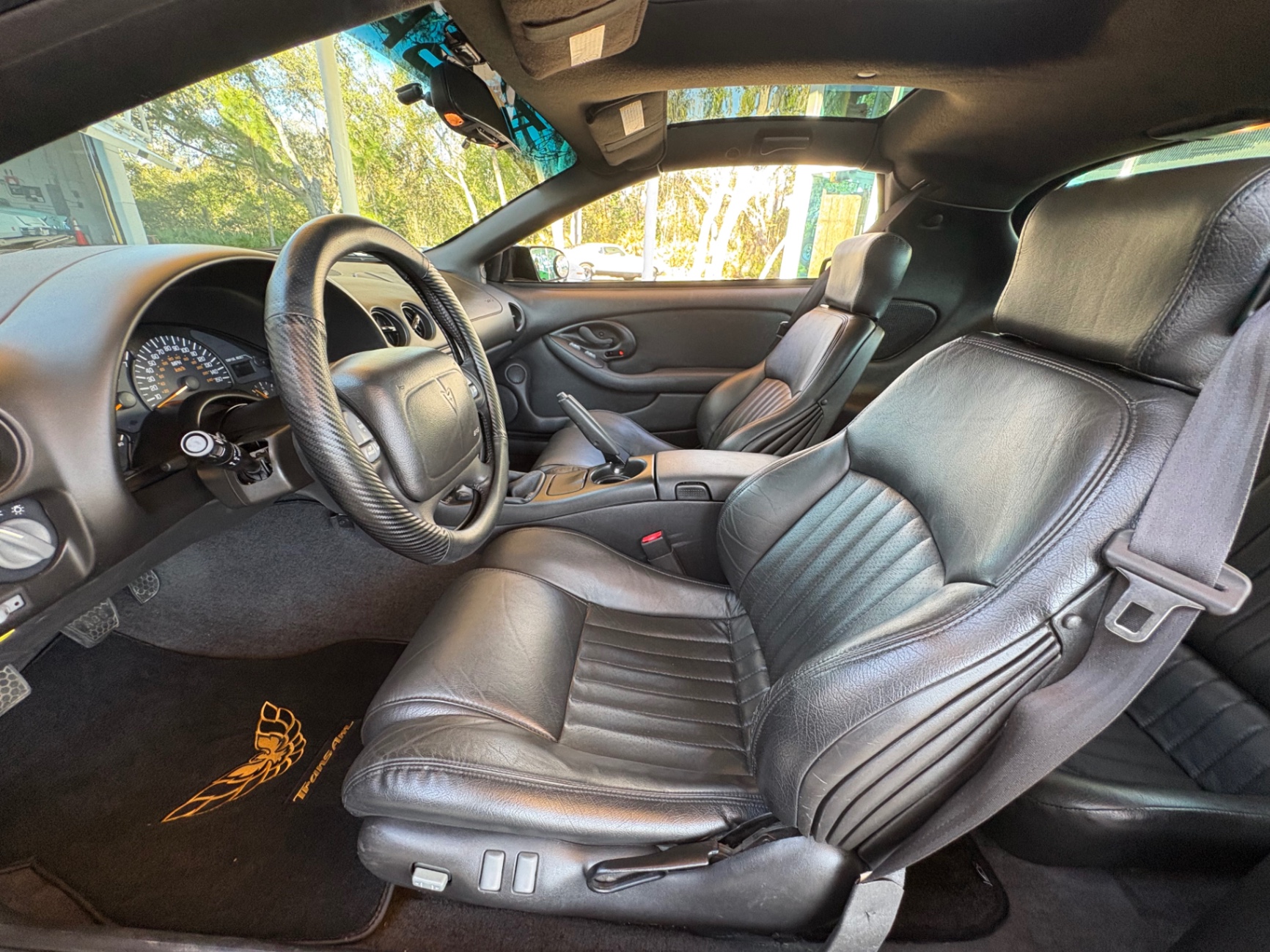 Inside, the Trans Am's black leather interior has been preserved impeccably, with the plastic still covering the factory carpet. The layout is driver-focused, featuring a clean and functional design. The manual short throw shifter offers a sportier feel while shifting through the six gears. Modern upgrades, including a Bluetooth/CD system and sound system enhancements, bring a contemporary touch to an otherwise classic cabin. Multiple features contribute to the car's overall comfort, while the T-top roof lets in fresh air and sunlight, transforming it into an open-air cruiser whenever you desire.