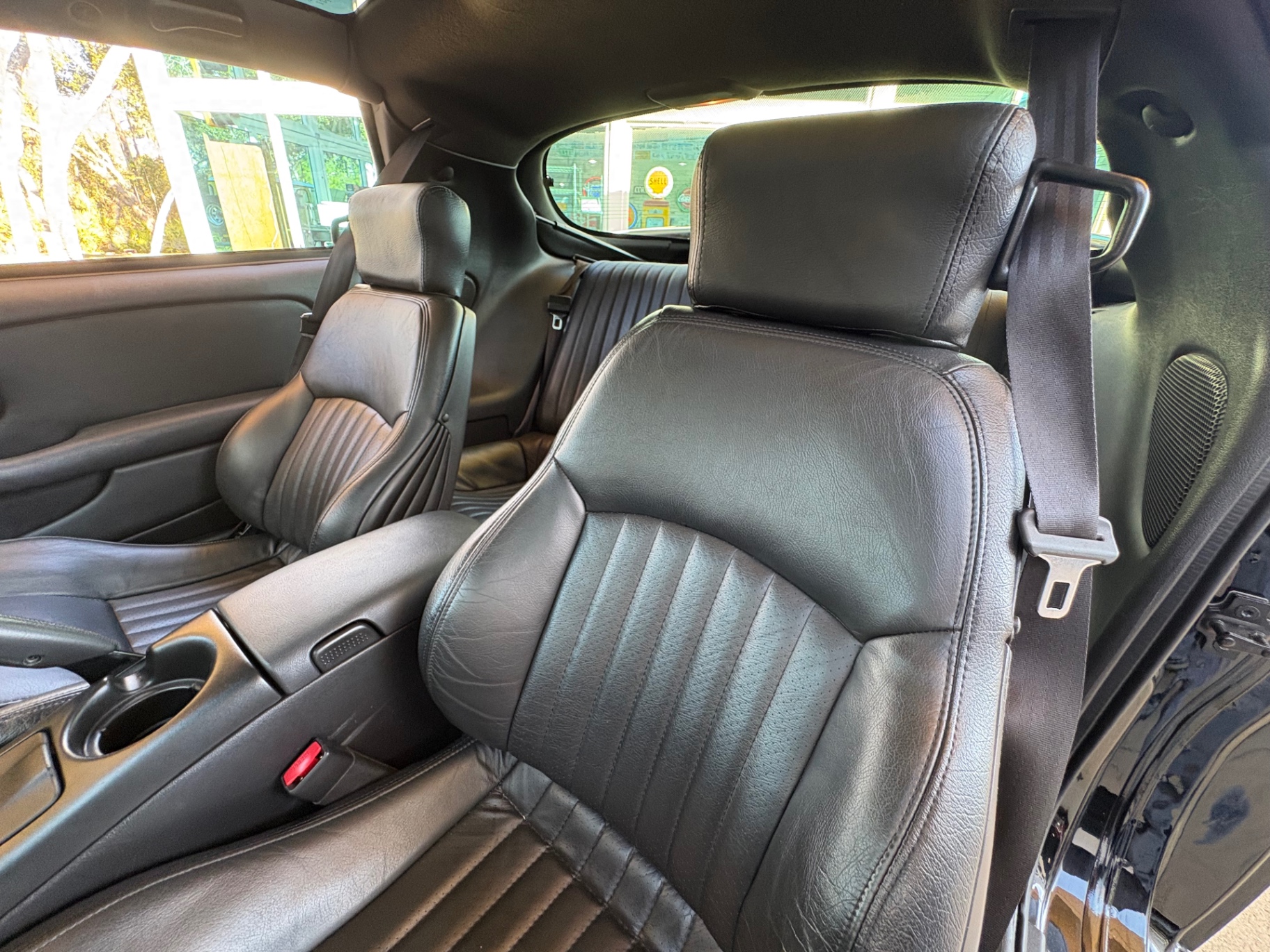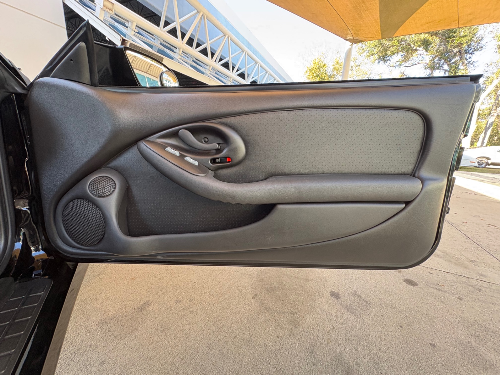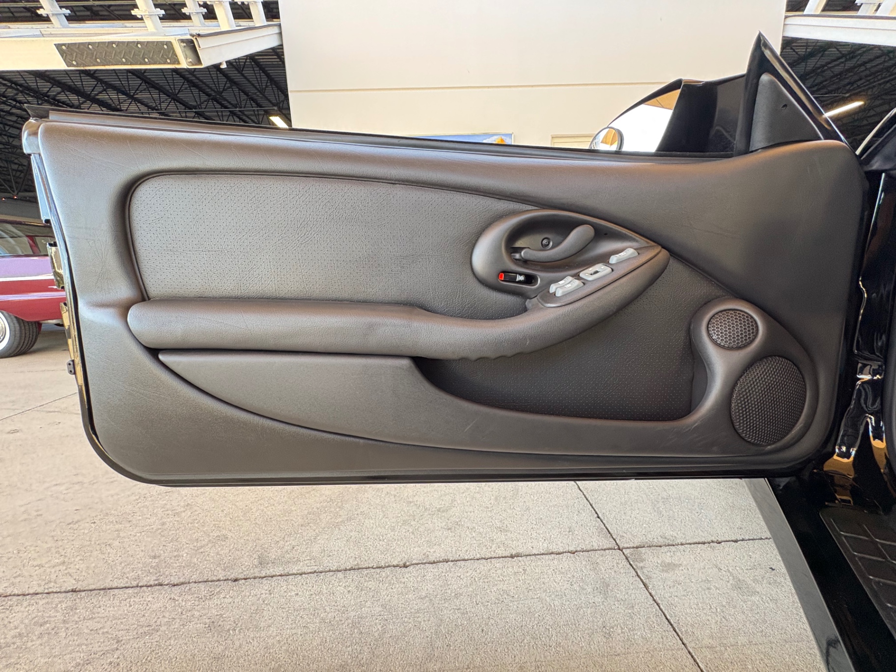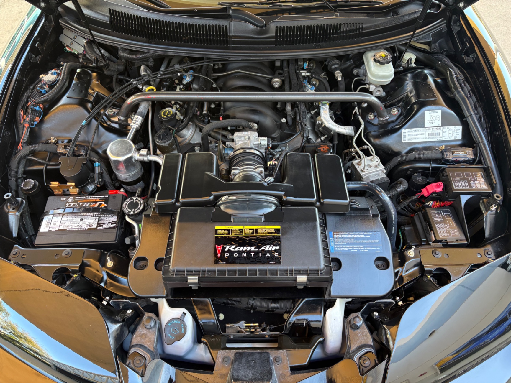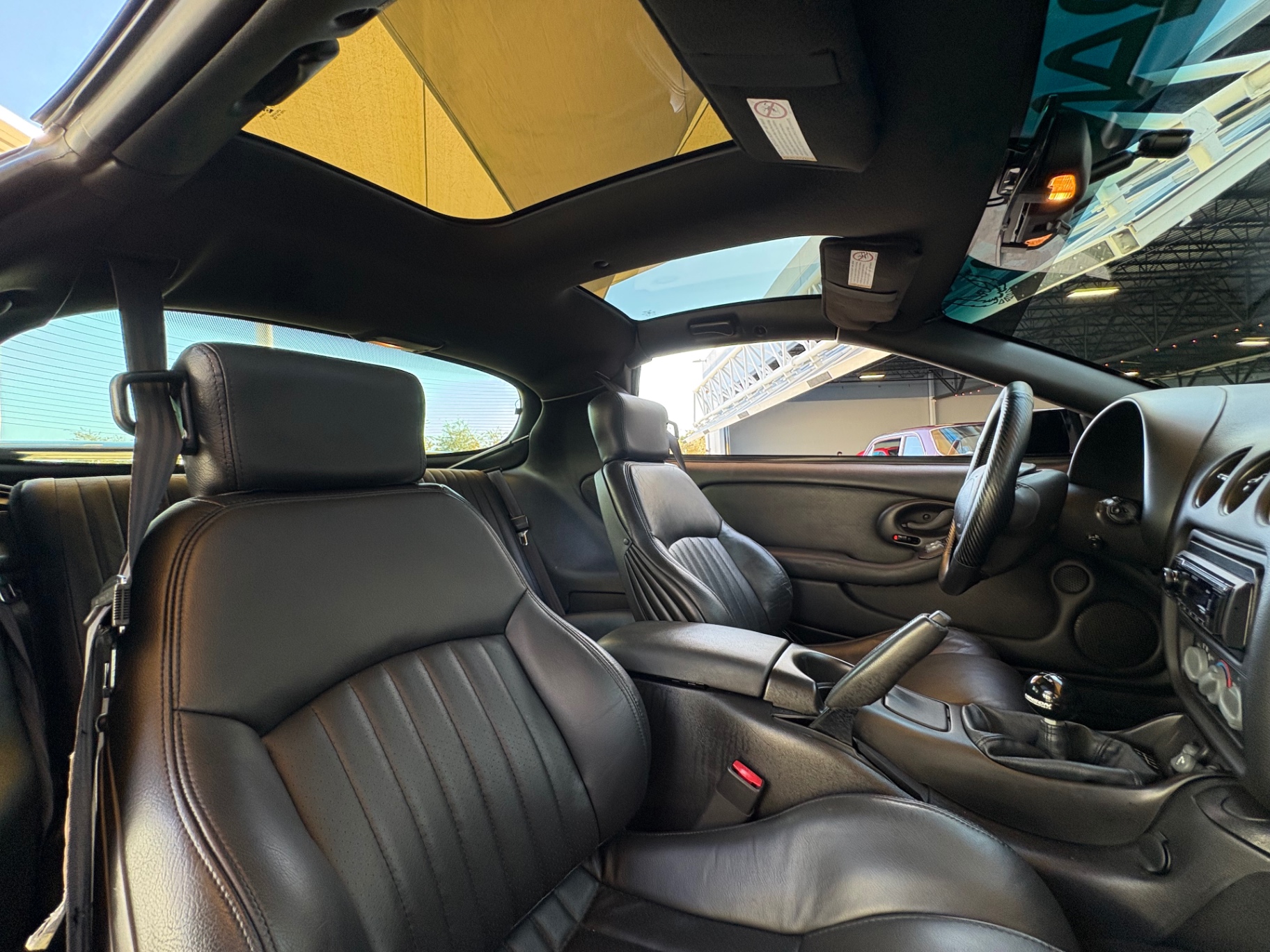 Inside, the Trans Am's black leather interior has been preserved impeccably, with the plastic still covering the factory carpet. The layout is driver-focused, featuring a clean and functional design. The manual short throw shifter offers a sportier feel while shifting through the six gears. Modern upgrades, including a Bluetooth/CD system and sound system enhancements, bring a contemporary touch to an otherwise classic cabin. Multiple features contribute to the car's overall comfort, while the T-top roof lets in fresh air and sunlight, transforming it into an open-air cruiser whenever you desire.