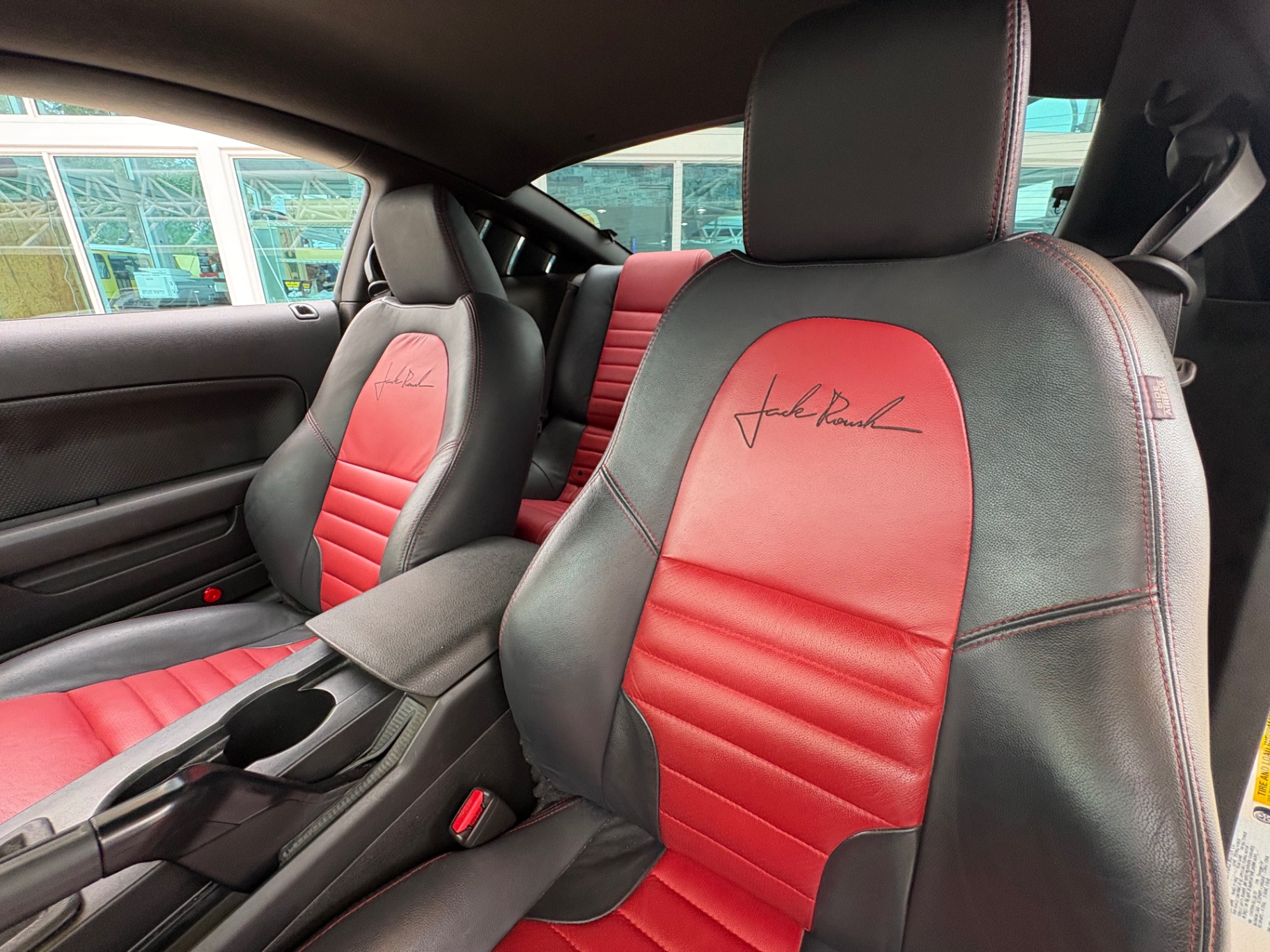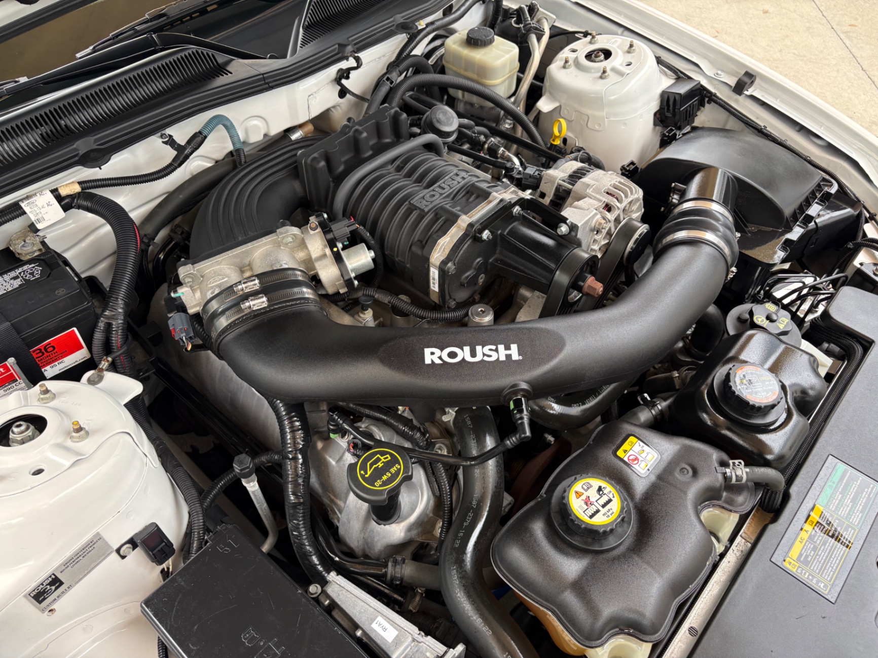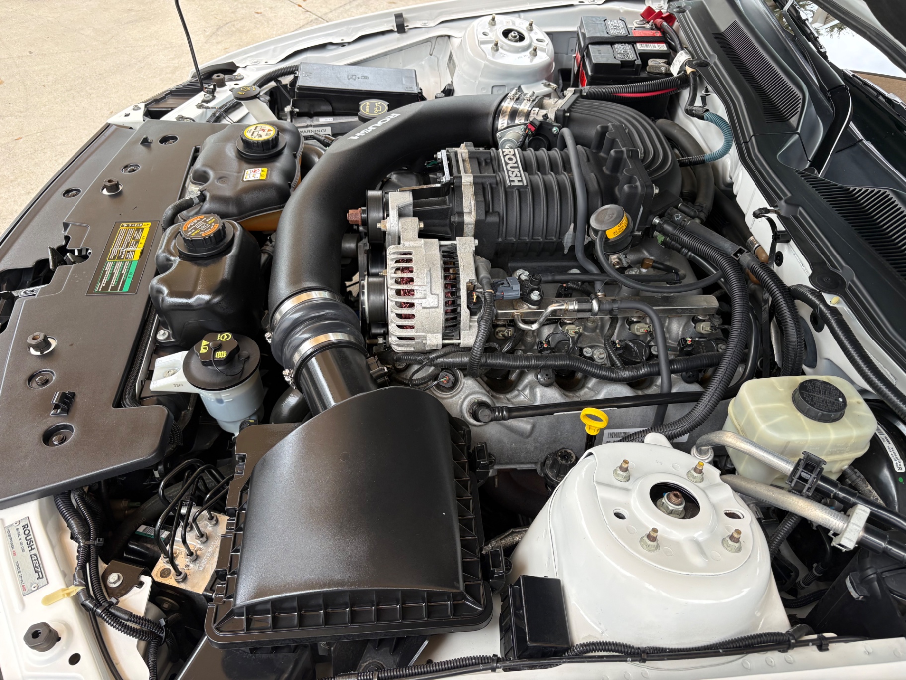 4.6L SOHC 3-valve V8 supercharged engine ROUSHcharger with intercooled Eaton Roots-style supercharger Roush intake manifold and intercooler Roush-calibrated ECM 5-speed manual transmission (Tremec TR-3650) with short-throw shifter Limited-slip differential with a 3.55:1 gear ratio Roush performance suspension system Upgraded front struts and rear shocks Progressive-rate lowering springs Larger front and rear sway bars Roush high-performance cat-back exhaust Leather interior with red and black color scheme