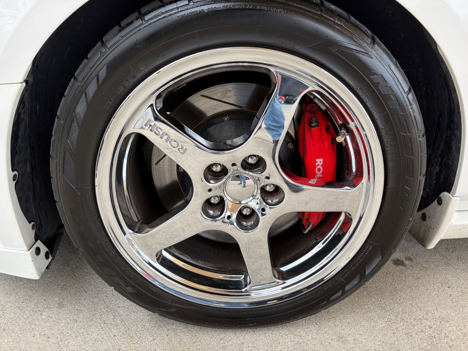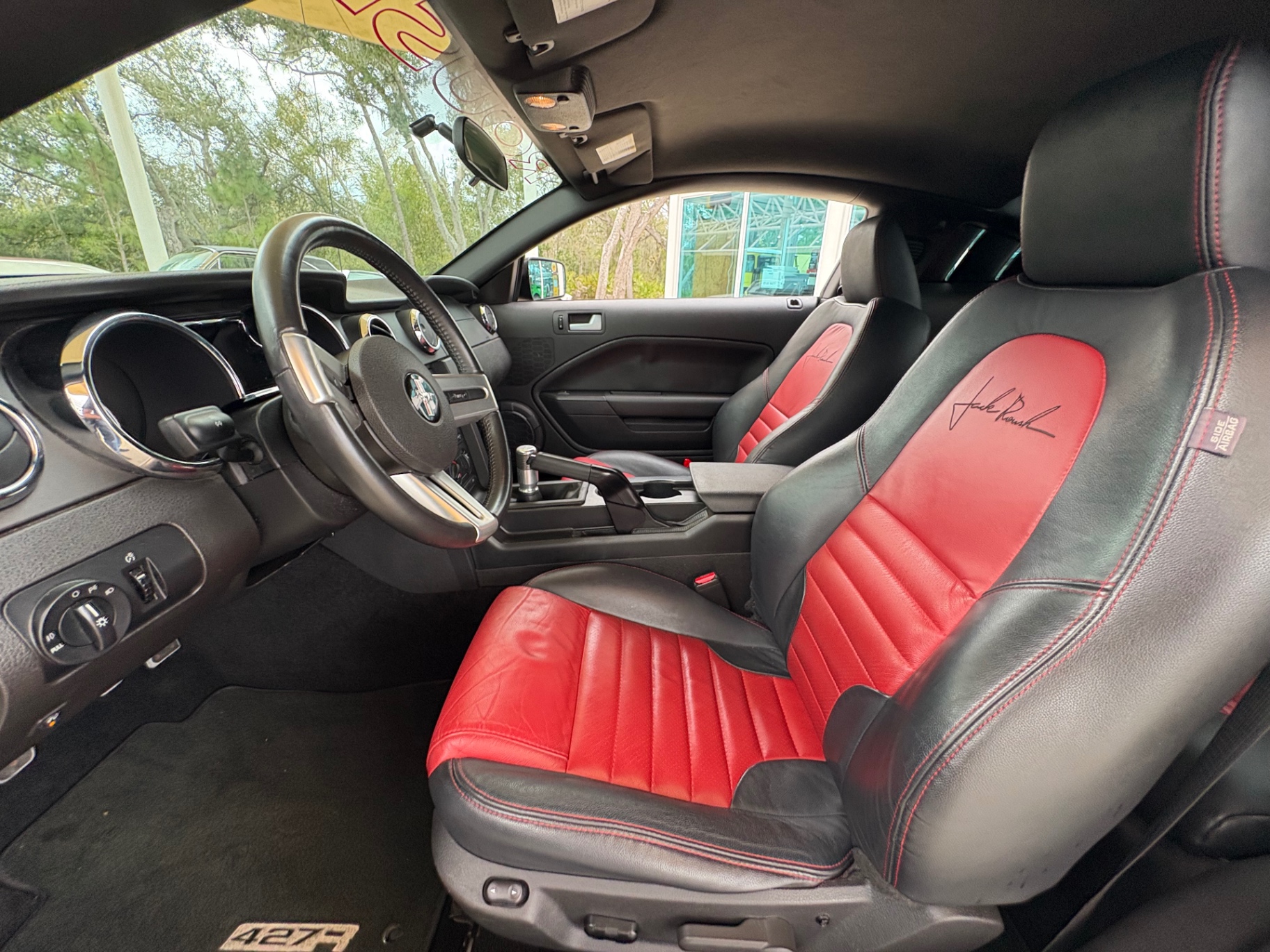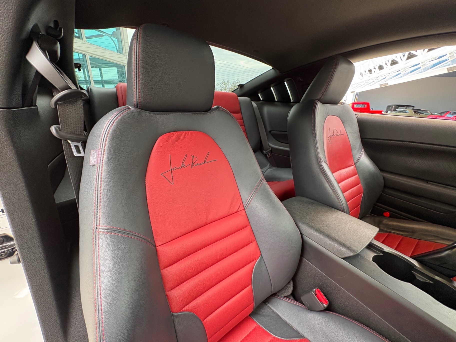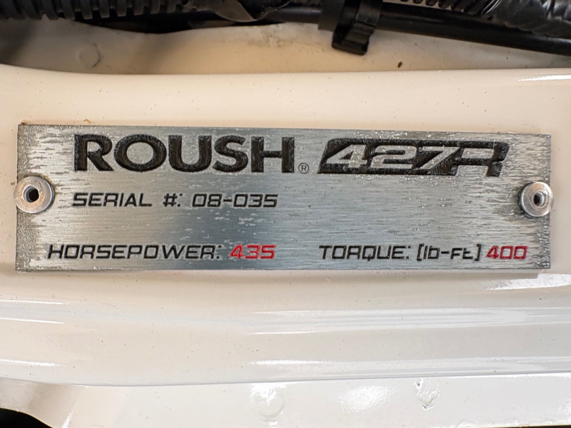 4.6L SOHC 3-valve V8 supercharged engine ROUSHcharger with intercooled Eaton Roots-style supercharger Roush intake manifold and intercooler Roush-calibrated ECM 5-speed manual transmission (Tremec TR-3650) with short-throw shifter Limited-slip differential with a 3.55:1 gear ratio Roush performance suspension system Upgraded front struts and rear shocks Progressive-rate lowering springs Larger front and rear sway bars Roush high-performance cat-back exhaust Leather interior with red and black color scheme