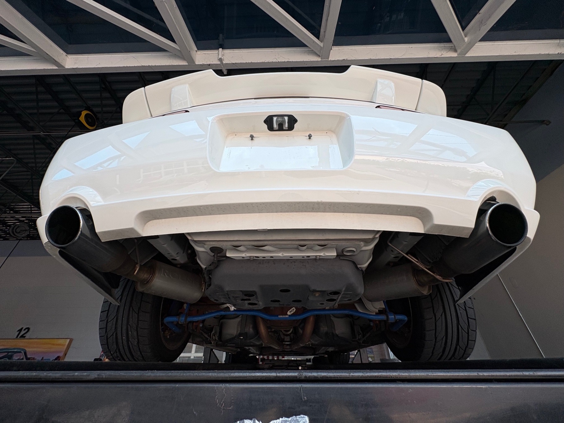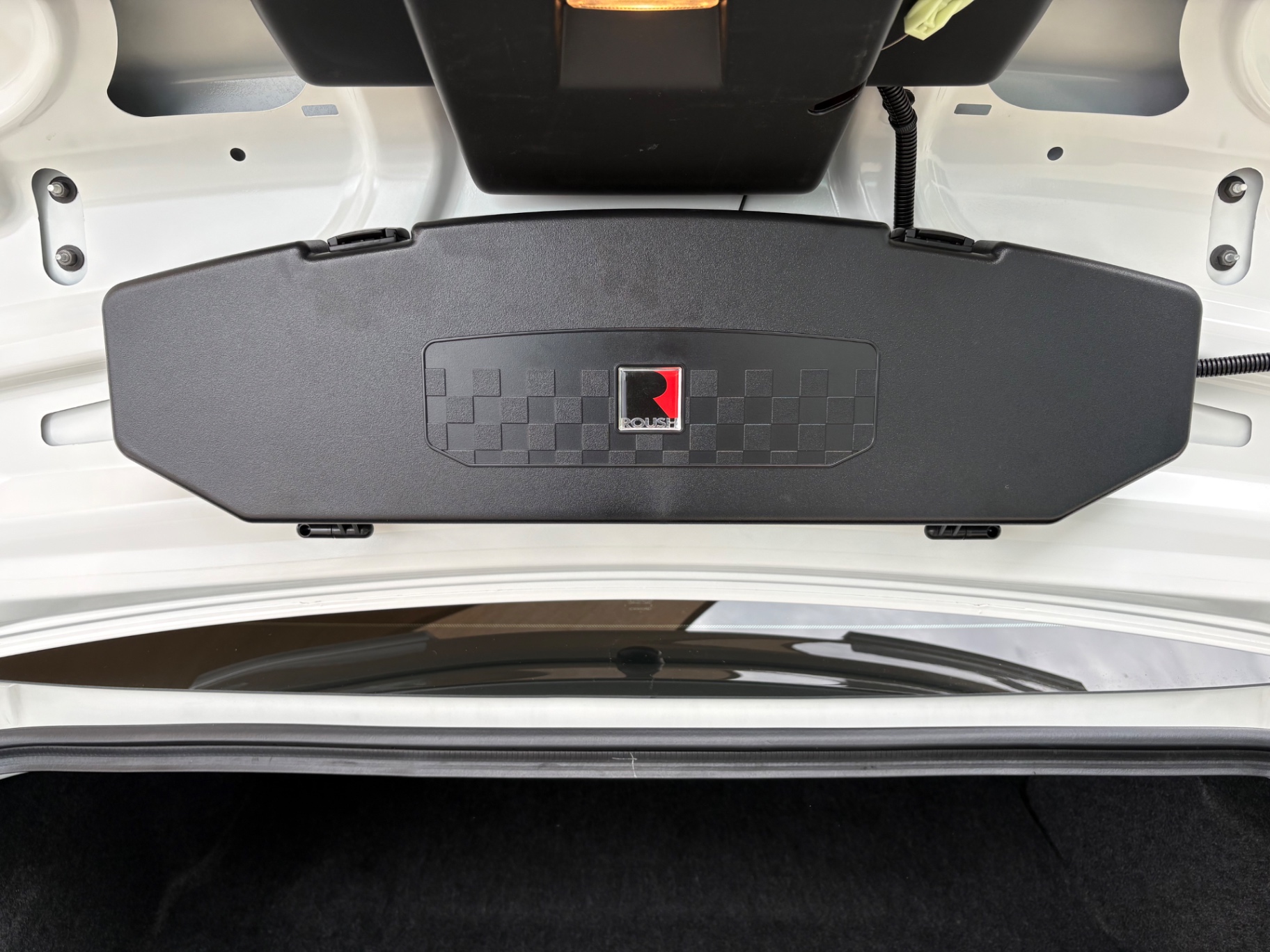 With its bright white exterior and bold red stripes, this Mustang exudes charisma even when sitting still. The classic Mustang silhouette is enhanced by modern touches, creating a muscular presence on the road. The front fascia is accentuated by unique ROUSH styling, including signature headlights that provide a modernized touch while maintaining the Mustang’s historical roots. The high-performance tires paired with aftermarket wheels offer not just aesthetic appeal, but also improved handling and grip. From the rear, the stylish exhaust tips hint at the power within, providing a glimpse of the performance that awaits.