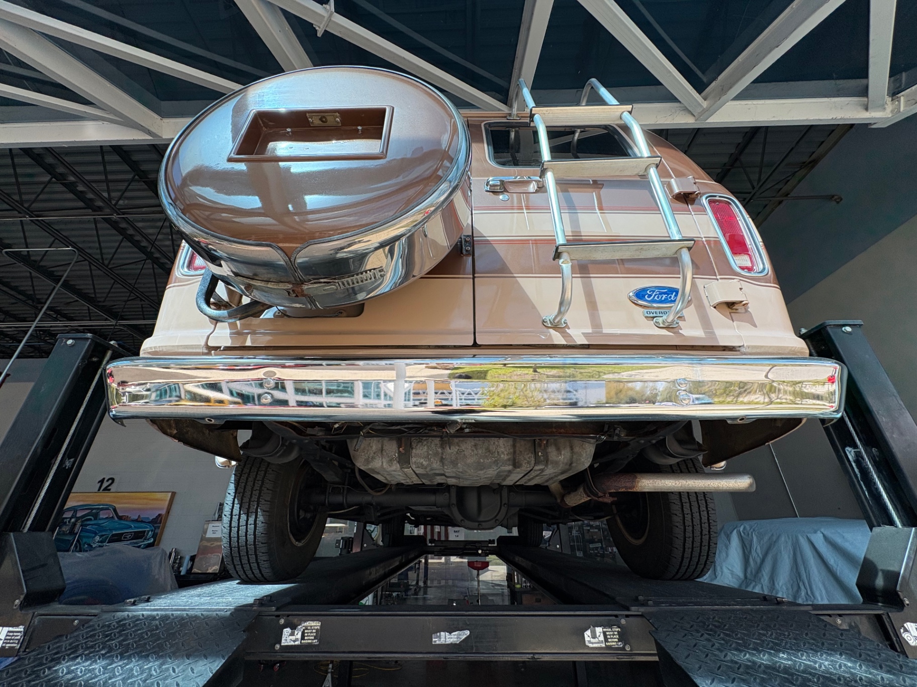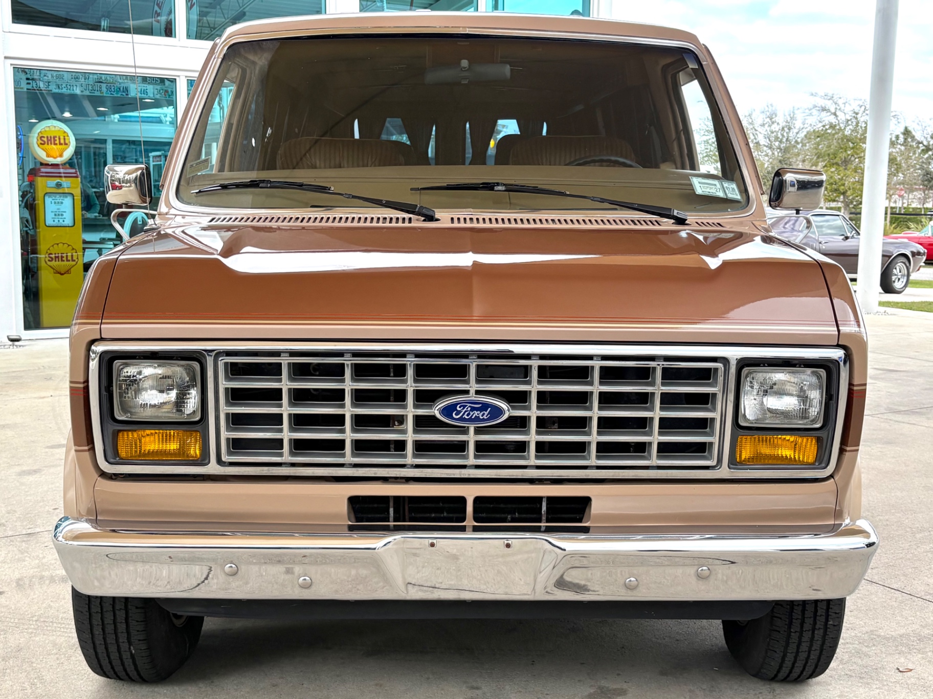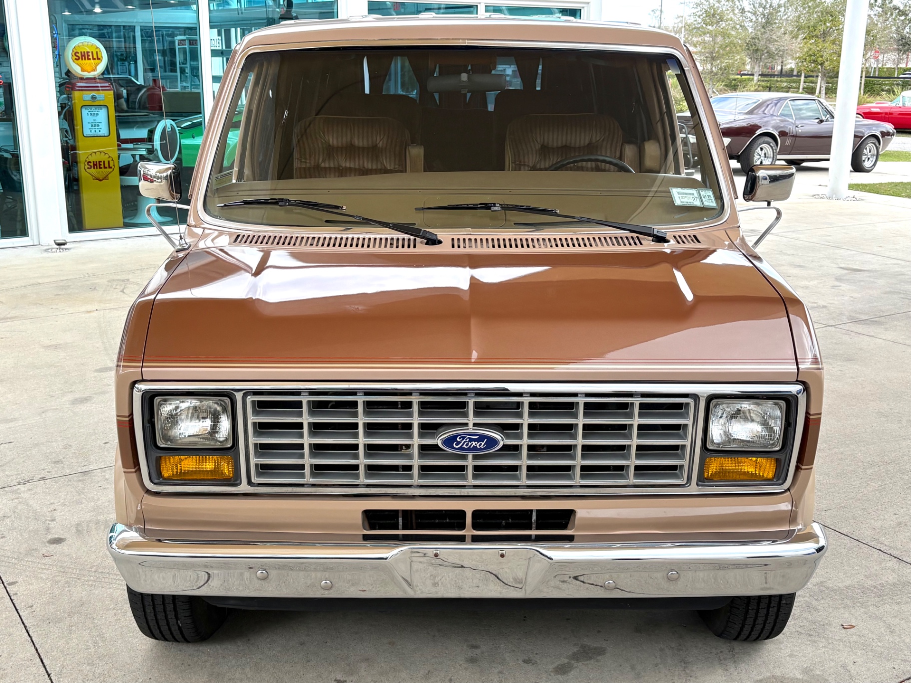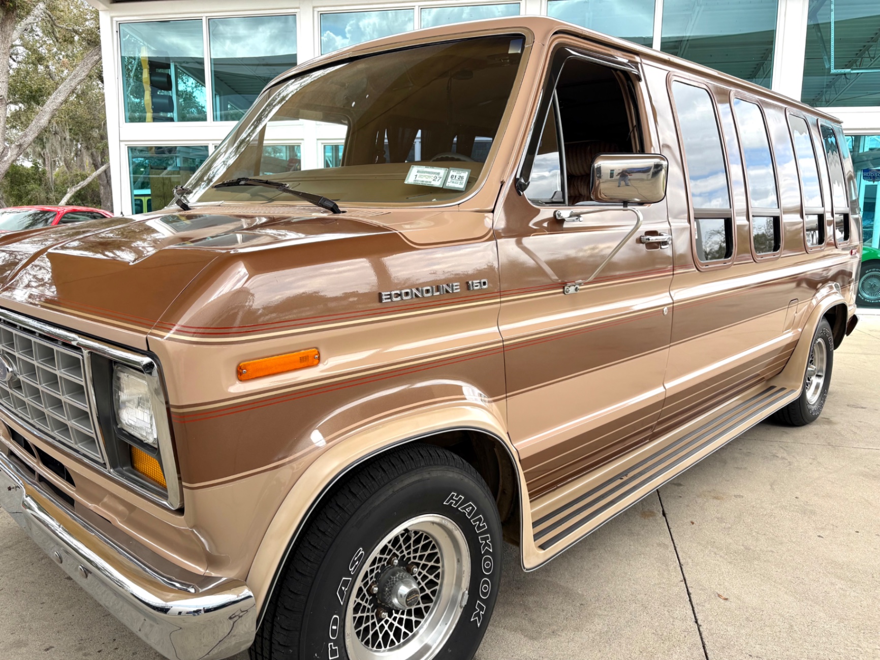 Visually, this Econoline stands out with its striking tan exterior accentuated by two-tone stripe graphics. The chrome bumpers and wire spoke wheels provide a classic look that pays homage to the vehicle's era. Additionally, the roof rack equipped with a spare tire enhances its utility, making it a perfect choice for those who enjoy outdoor adventures. The overall condition of the exterior shows the care it has received over the years, with the finish still gleaming and free from significant blemishes that could detract from its appearance.