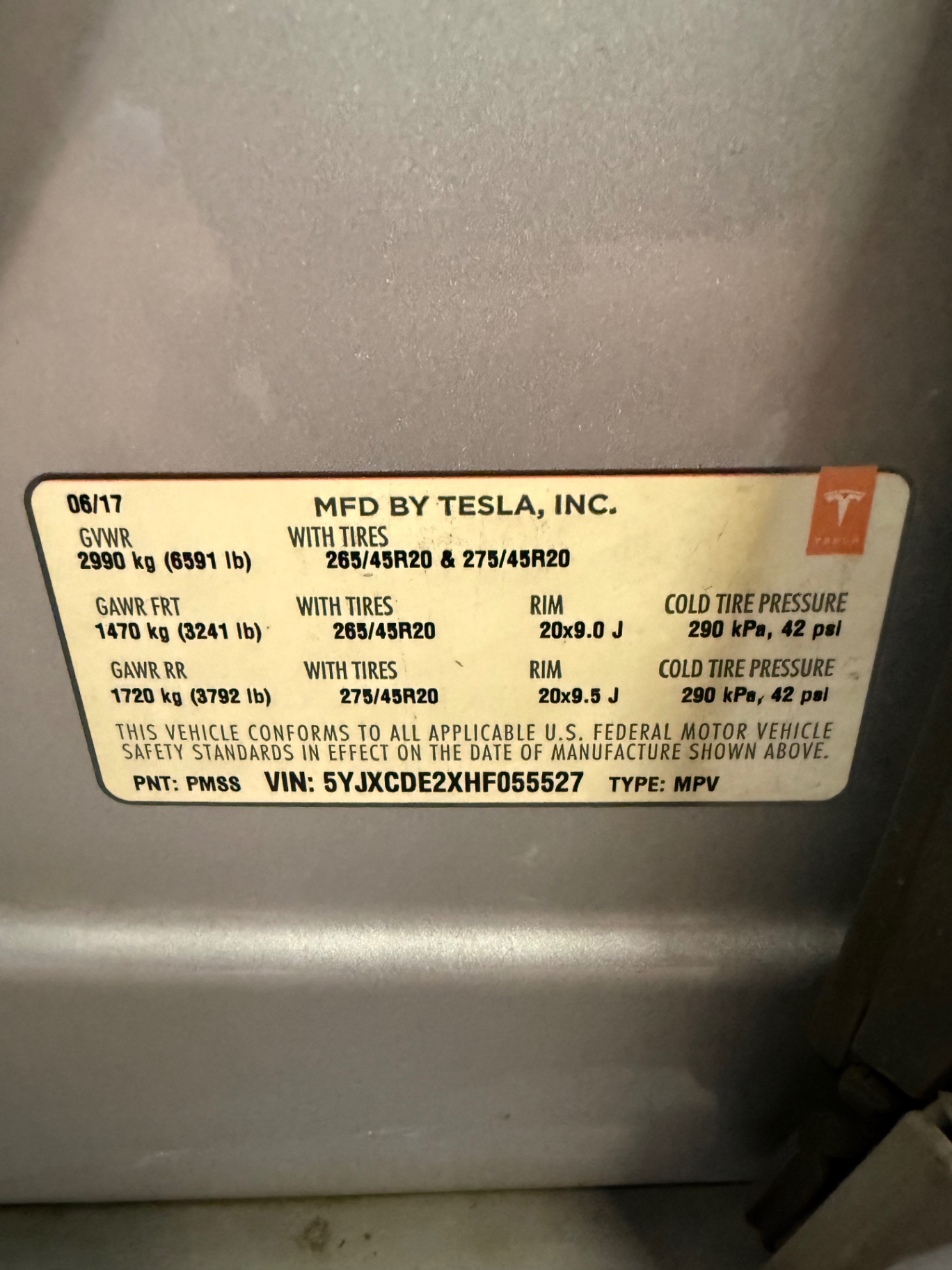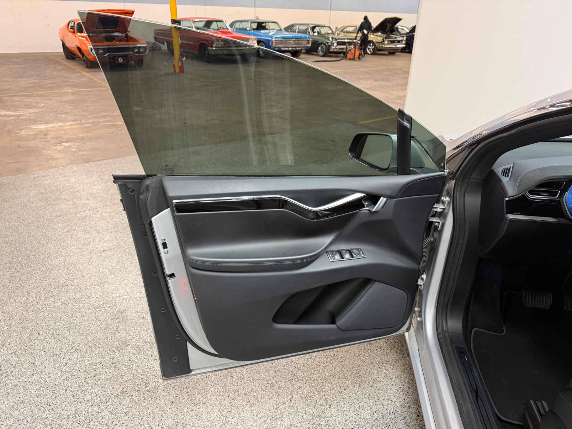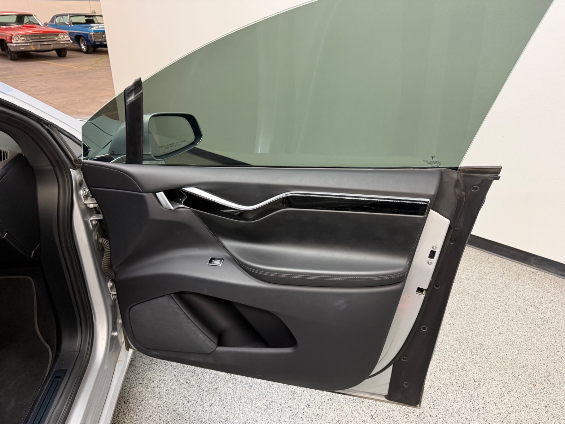 90 kWh battery Dual Motor All-Wheel Drive (AWD) 155 mph top speed 257-mile EPA-estimated range Smart Air Suspension with GPS memory Falcon Wing rear doors Panoramic glass windshield 17-inch vertical touchscreen command center Autopilot Hardware 2.0 with 8 cameras and 12 sensors Premium Upgrades Package Self-presenting driver's door Medical-grade HEPA air filtration with Bioweapon Defense Mode Ultra High Fidelity Sound System Subzero Weather Package Heated front and rear seats Heated steering wheel Wiper blade defrosters 12 airbags Automatic emergency braking Blind-spot monitoring Lane departure warning Power liftgate Front trunk (frunk) 20-inch alloy wheels LED headlamps with auto-leveling Free over-the-air software updates Unlimited lifetime free supercharging