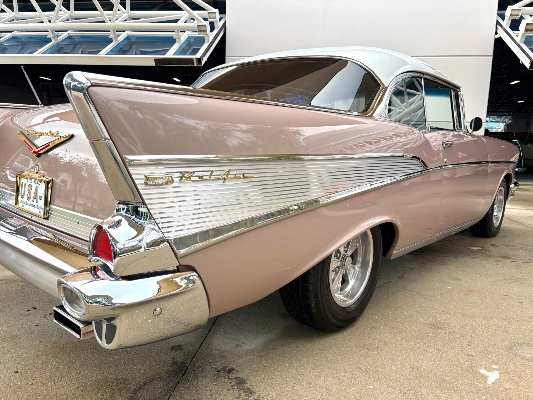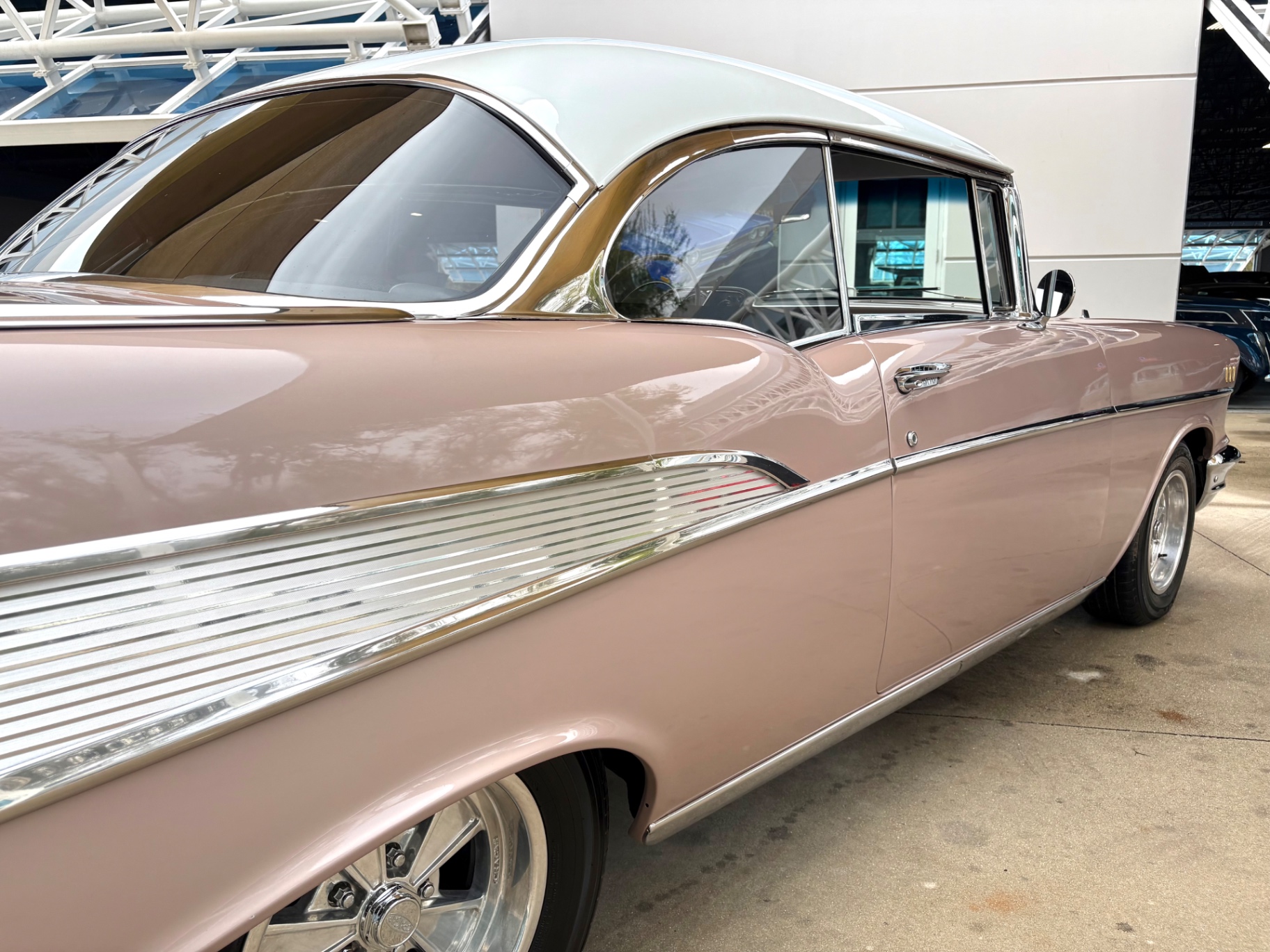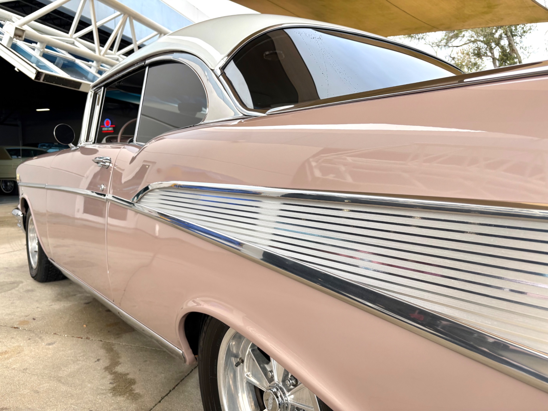 The Pearl Metallic finish on this 1957 Chevrolet Bel Air reads as a soft, warm tone in natural light — it sits in a range that complements the original design language of the car rather than working against it. The 1957 Bel Air was designed by a team working under GM design chief Harley Earl, and its combination of chrome trim, sculpted side spears, and modest tailfins represented the height of late-1950s American styling. The rocker panel moldings on this car are correct to the Bel Air trim level, which is worth noting — the full-length rocker trim was one of the visual distinctions between the Bel Air and the lower Two-Ten trim, and using the correct pieces keeps the car honest.