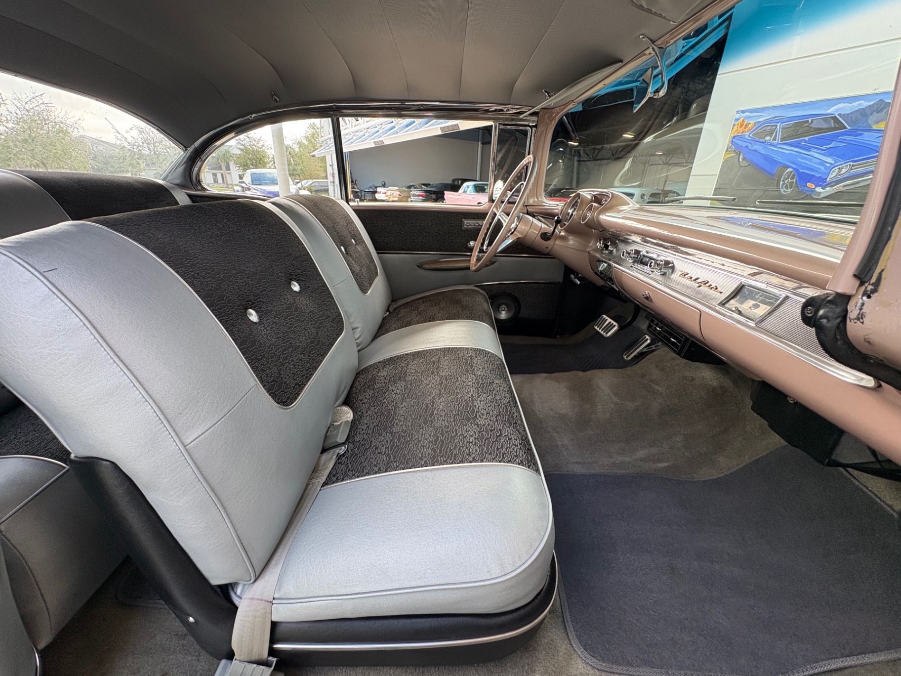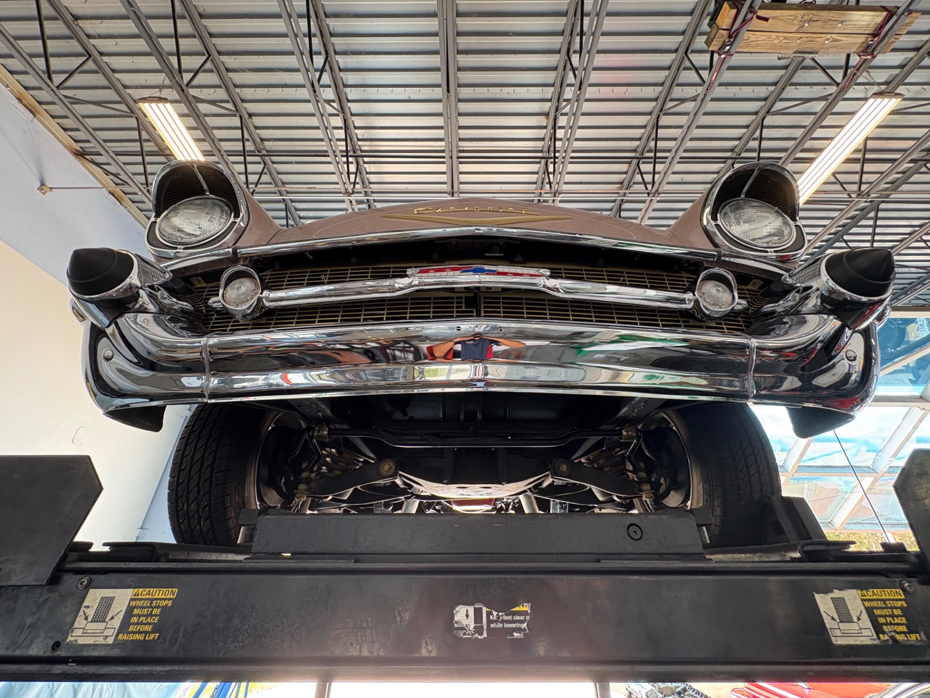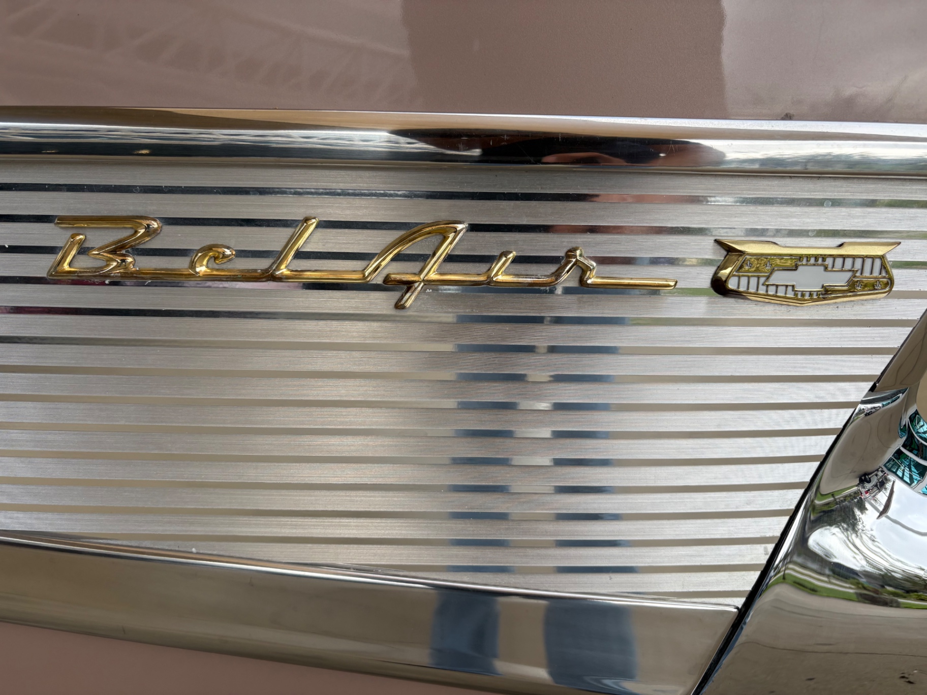 The Pearl Metallic finish on this 1957 Chevrolet Bel Air reads as a soft, warm tone in natural light — it sits in a range that complements the original design language of the car rather than working against it. The 1957 Bel Air was designed by a team working under GM design chief Harley Earl, and its combination of chrome trim, sculpted side spears, and modest tailfins represented the height of late-1950s American styling. The rocker panel moldings on this car are correct to the Bel Air trim level, which is worth noting — the full-length rocker trim was one of the visual distinctions between the Bel Air and the lower Two-Ten trim, and using the correct pieces keeps the car honest.