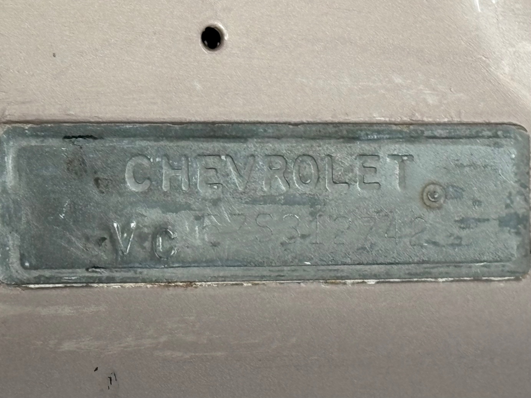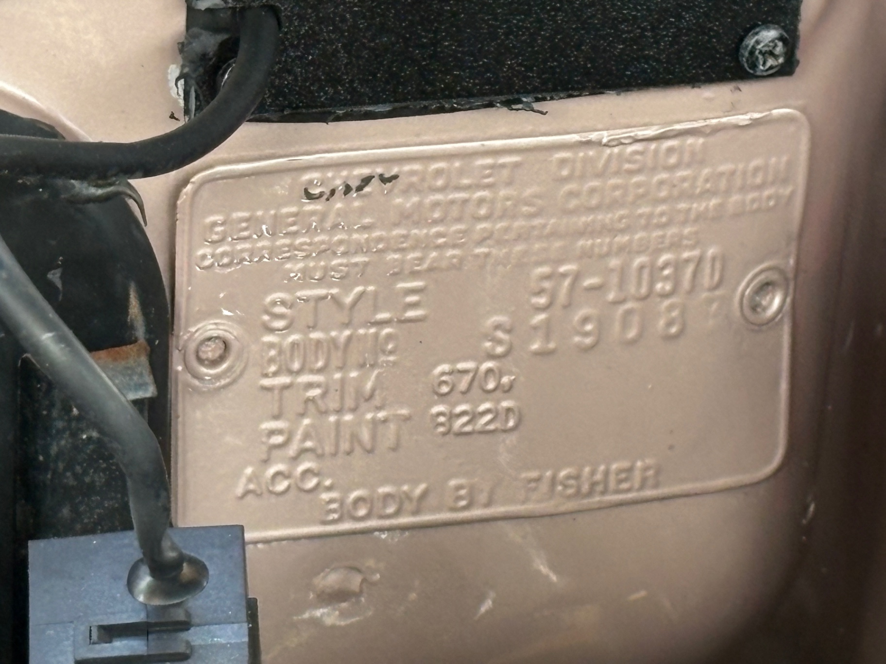 The VIN on this car decodes to a 1957 Chevrolet built in Flint, Michigan, with a V8 engine from the factory. The body style code identifies it as a Sport Sedan — the hardtop two-door body that defined the look of the era with its pillarless roofline and wide greenhouse glass.
