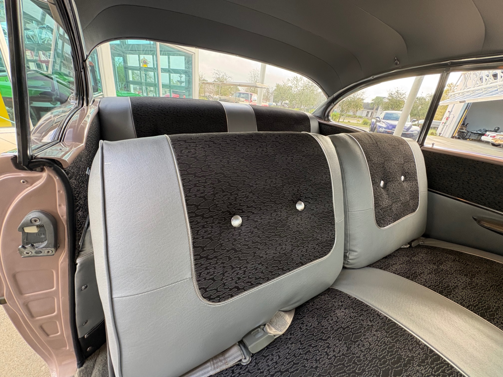 The interior of this 1957 Chevrolet Bel Air has been fully custom built in black and gray vinyl. The color combination works well with the Pearl Metallic exterior, giving the car a cohesive look rather than the mismatched feel that can happen when custom interiors are chosen independently of the body color. Power windows and a power seat have been integrated into the build, which required custom wiring work given that these were not factory options available on the 1957 Bel Air in their modern form.
