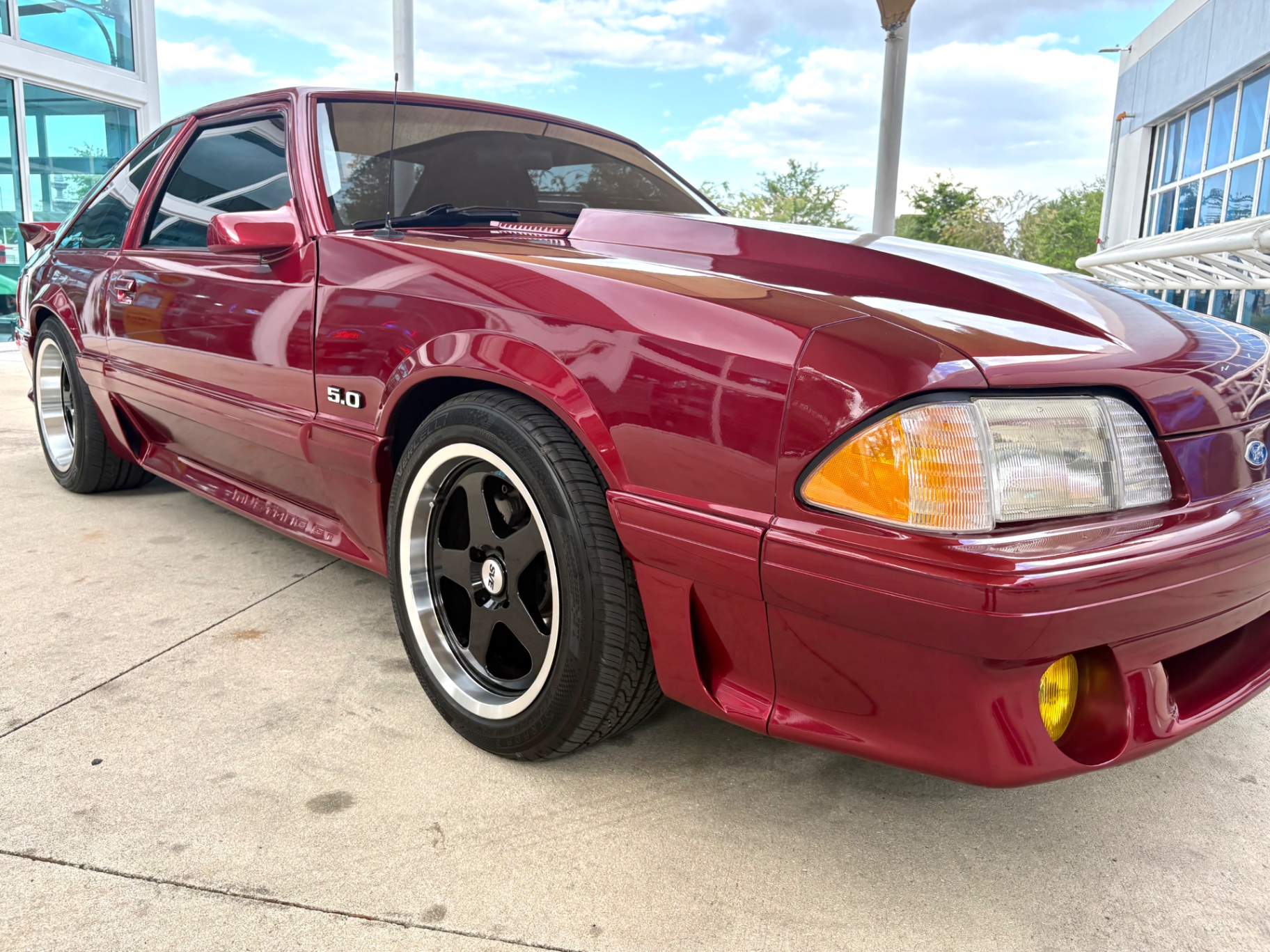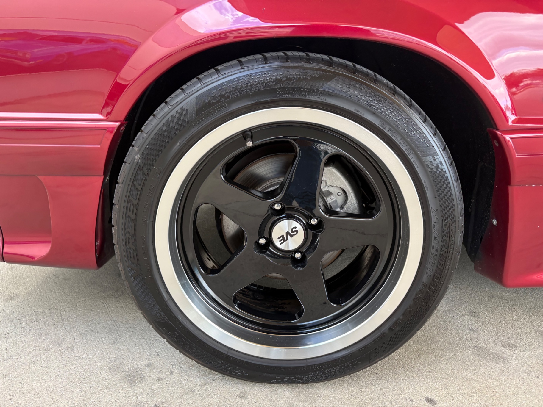 - 5.0L V8 with Edelbrock cylinder heads - Ford Cobra upper and lower intake manifold - Cold air intake with polished aluminum tubing - Griffin aluminum radiator - Full QA1 suspension system - 5-speed manual transmission - Dual exhaust - GT front chin spoiler - GT rear spoiler - Custom aftermarket wheels - Yellow fog lights - Power windows - Tachometer - Fox Body hatchback body style - Maroon exterior - Gray cloth interior